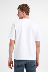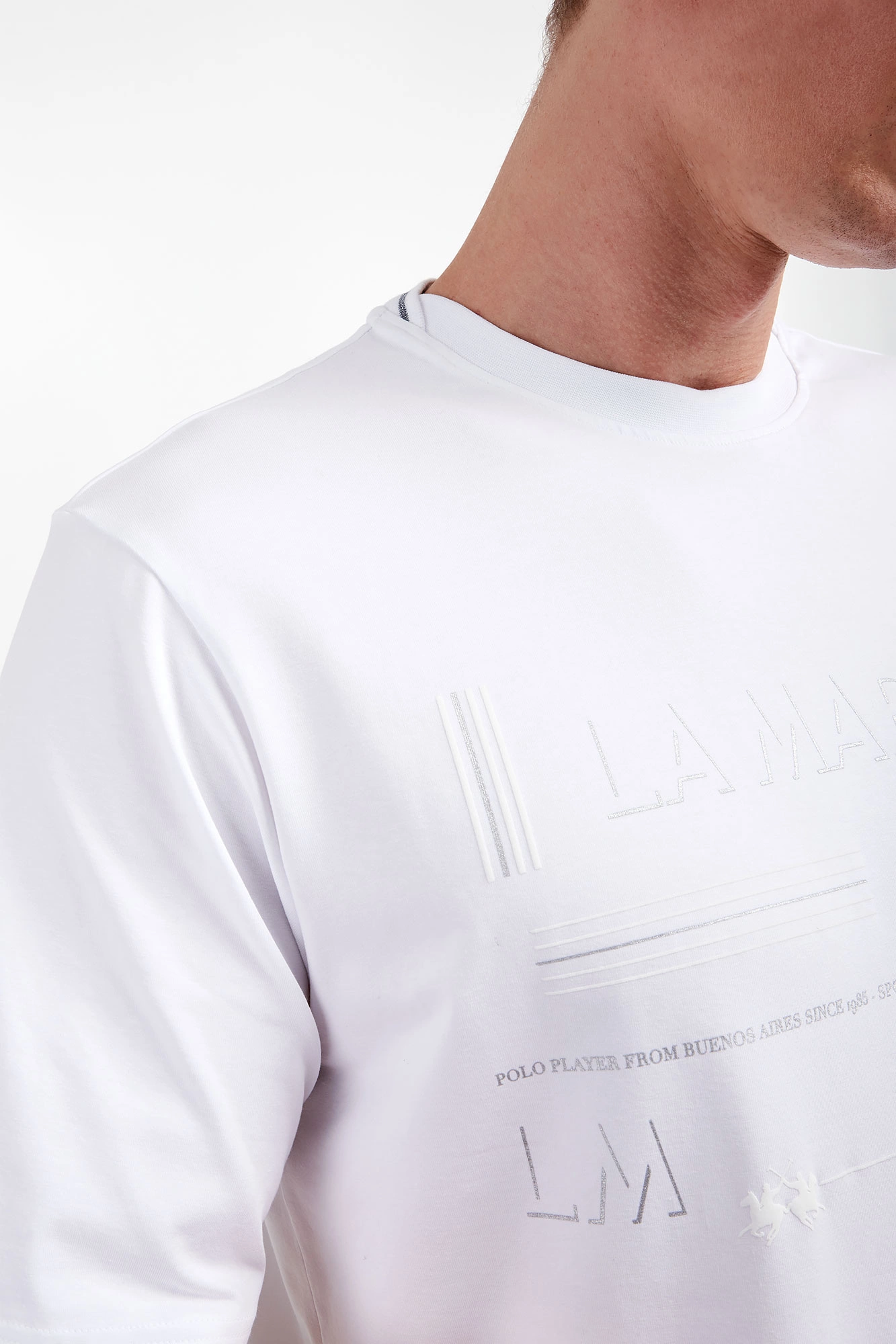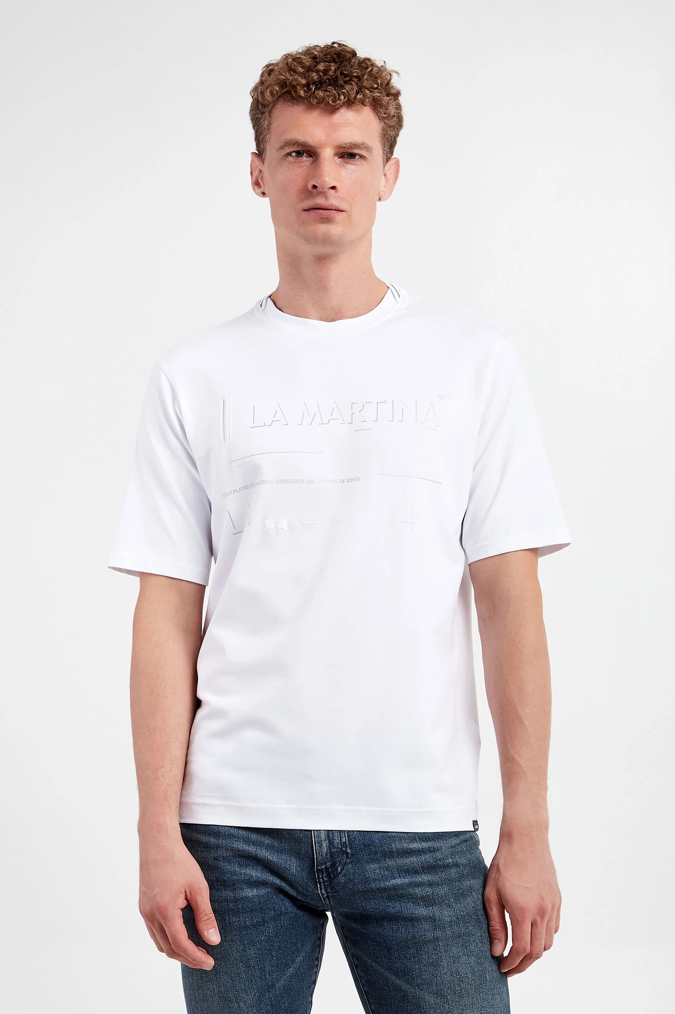 T-shirt marki La Martina w białym kolorze. Krótkie rękawy i dół zakończone przeszyciem. Okrągły dekolt typu o-neck wykończony ściągaczem. Z przodu duży, nieco połyskujący nadruk z nazwą i logo marki. Wykonana z nieco elastycznej bawełny. Fason regular.