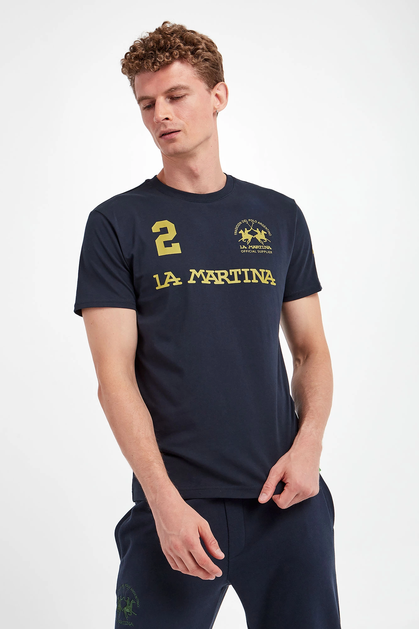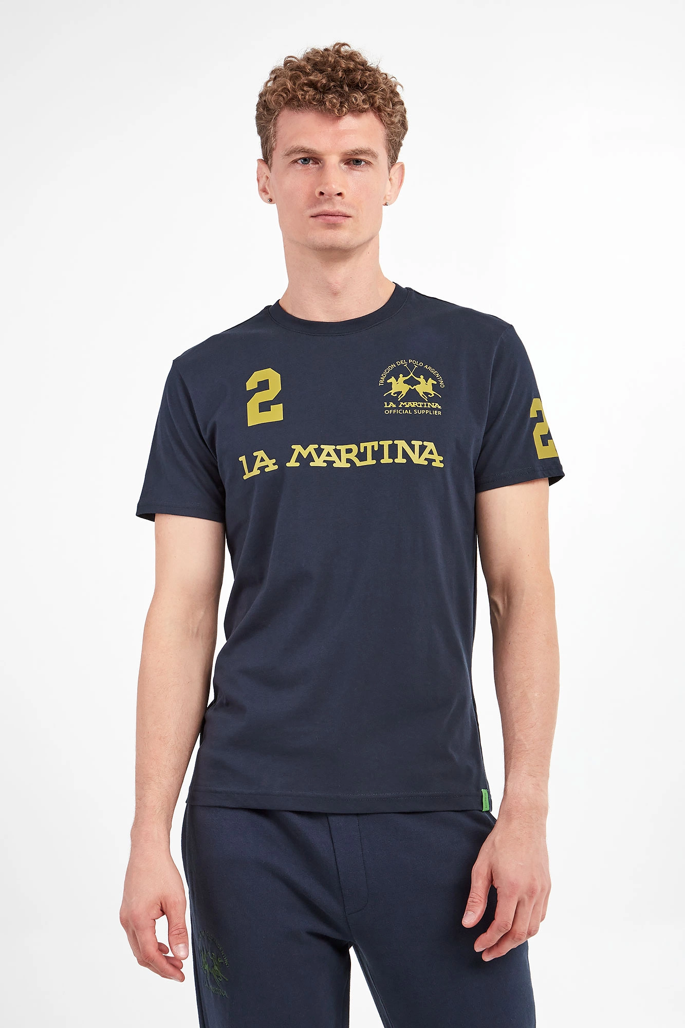 T-shirt marki La Martina w granatowym kolorze. Krótkie rękawy i dół wykończone przeszyciem. Okrągły dekolt typu o-neck zakończony ściągaczem. Z przodu duży nadruk z nazwą i logo marki w żółtym kolorze. Wykonana z czystej bawełny. Fason slim.