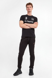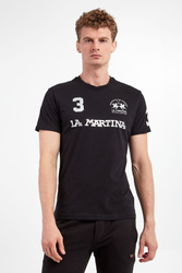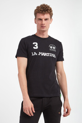 T-shirt marki La Martina w czarnym kolorze. Krótkie rękawy i dół wykończone przeszyciem. Okrągły dekolt typu o-neck zakończony ściągaczem. Z przodu duży nadruk z nazwą i logo marki w szarym kolorze. Wykonana z czystej bawełny. Fason slim.
