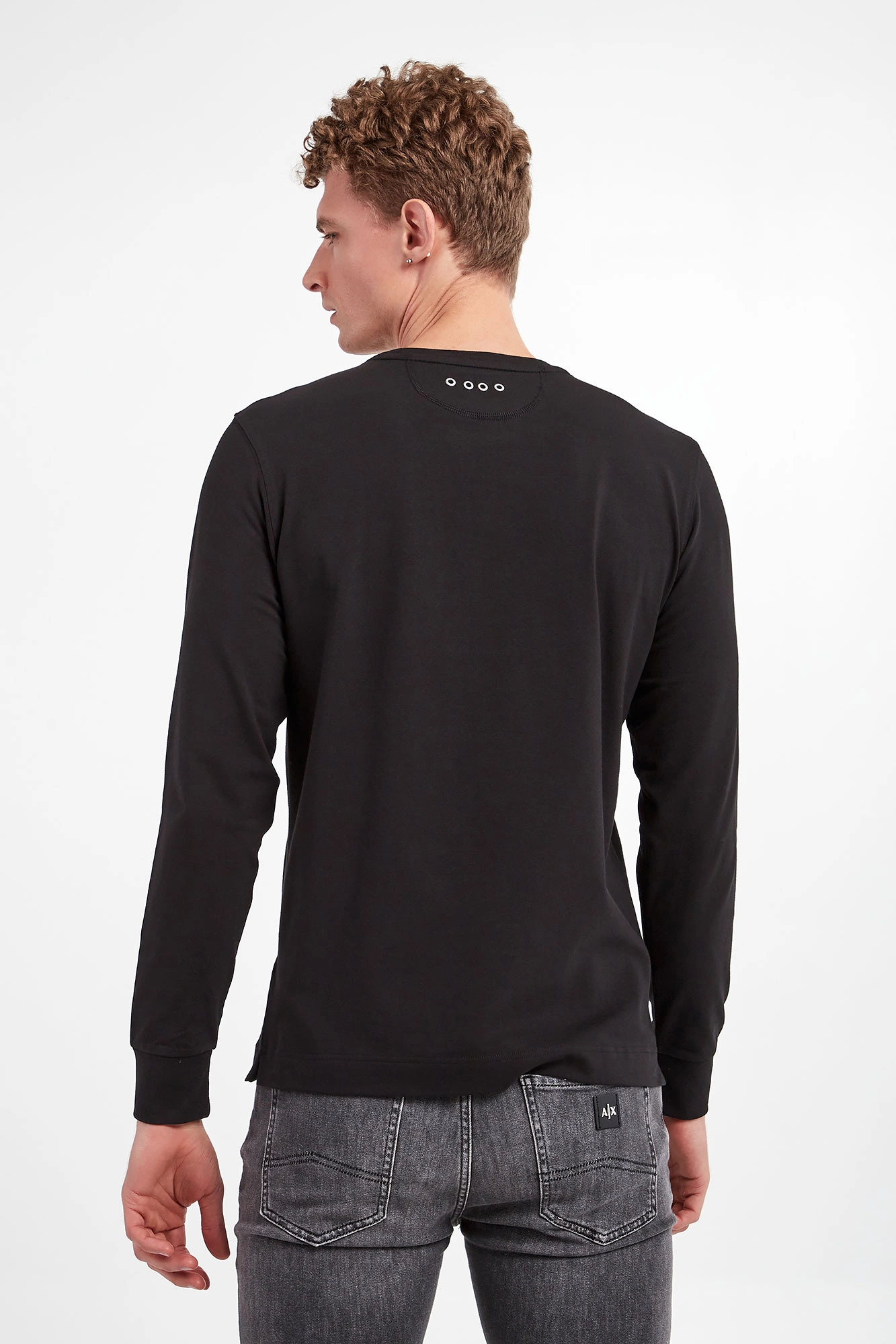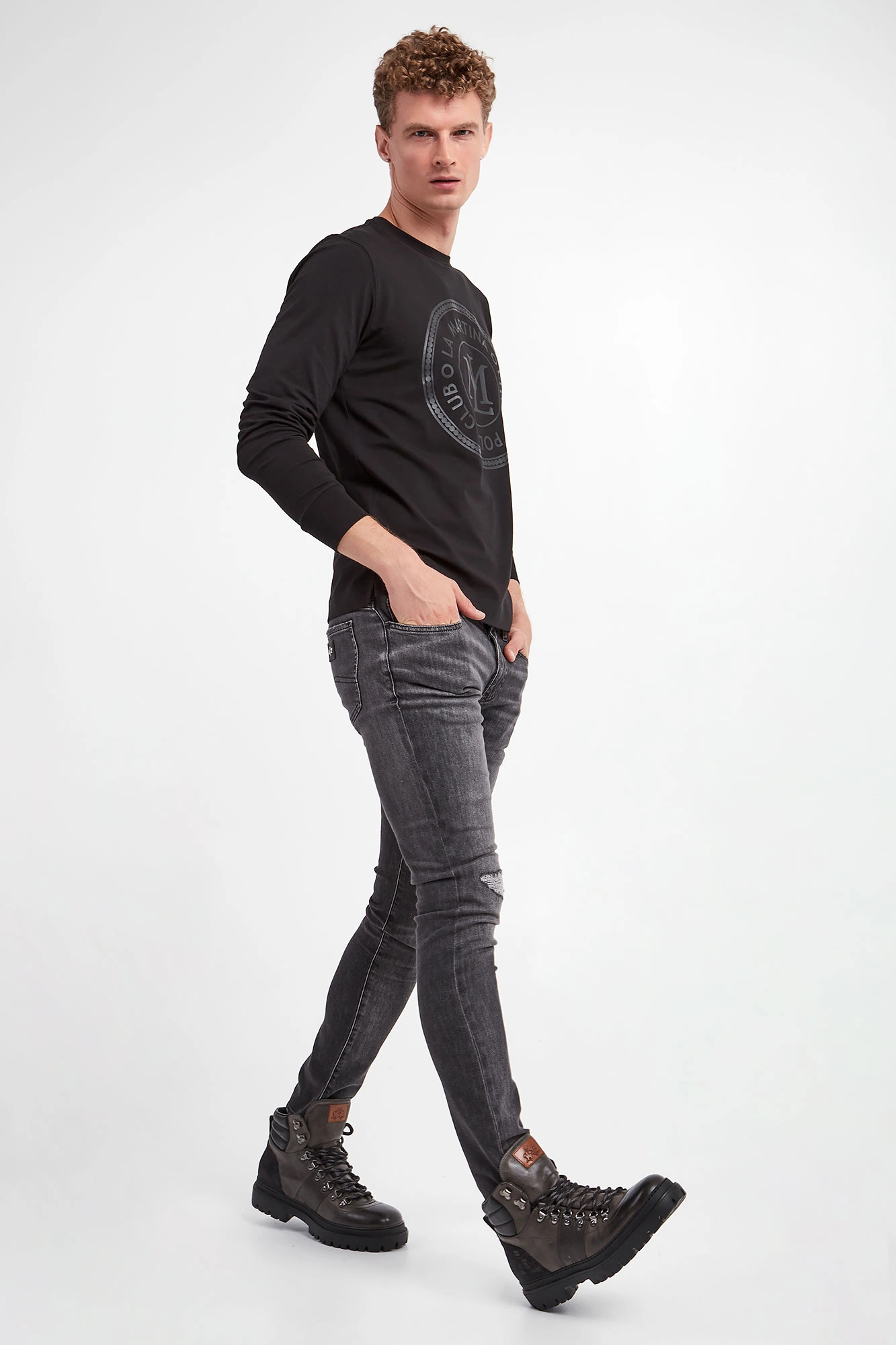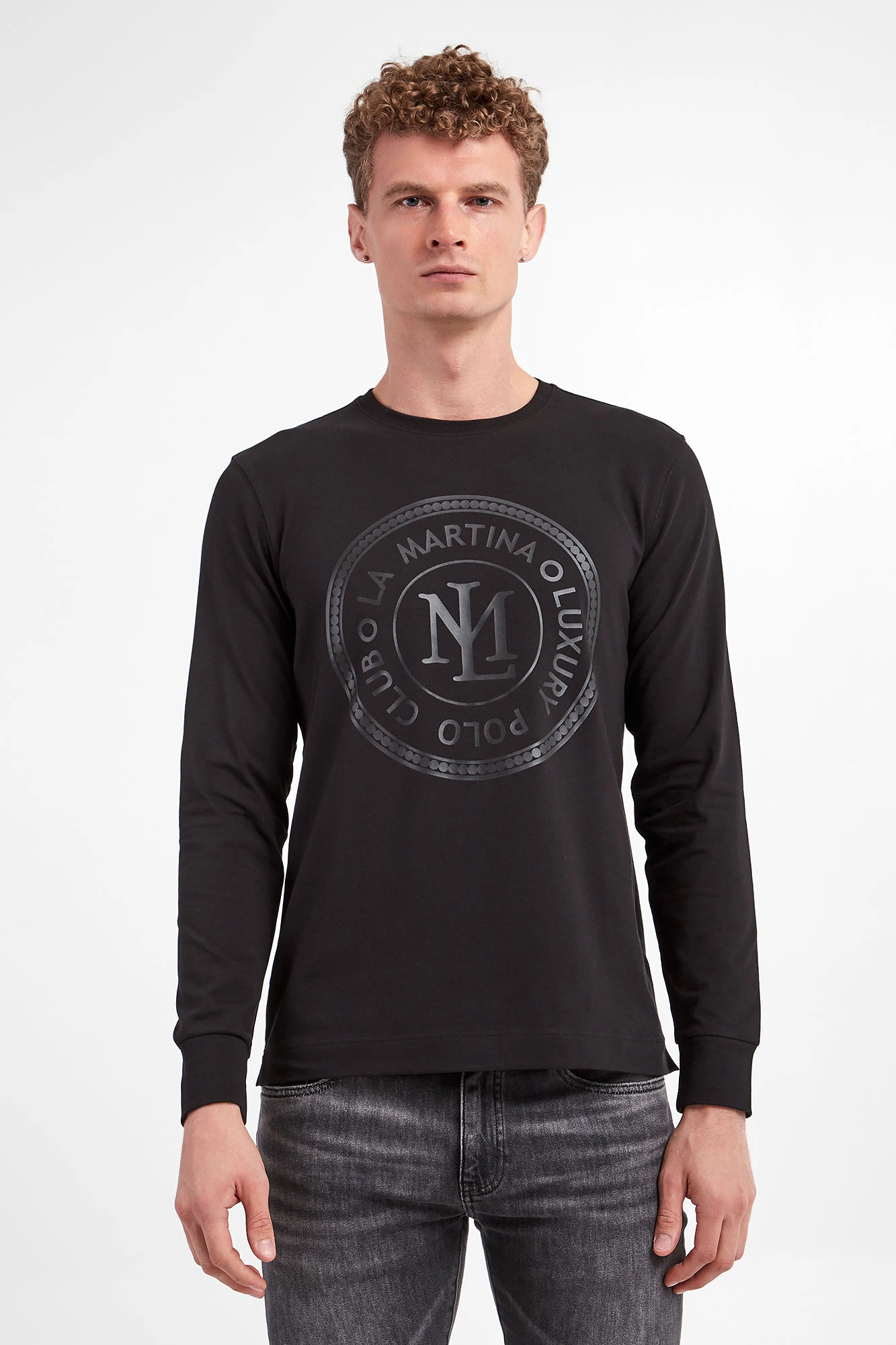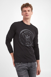 Longsleeve marki La Martina w czarnym kolorze. Z przodu duży, połyskujący nadruk. Długie rękawy i dekolt o-neck wykończony ściągaczem. Na dole niewielkie, ozdobne rozcięcia. Na linii karku dżety w srebrnym kolorze. Fason typu regular. Wykonany z nieco elastycznej bawełny.