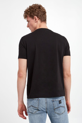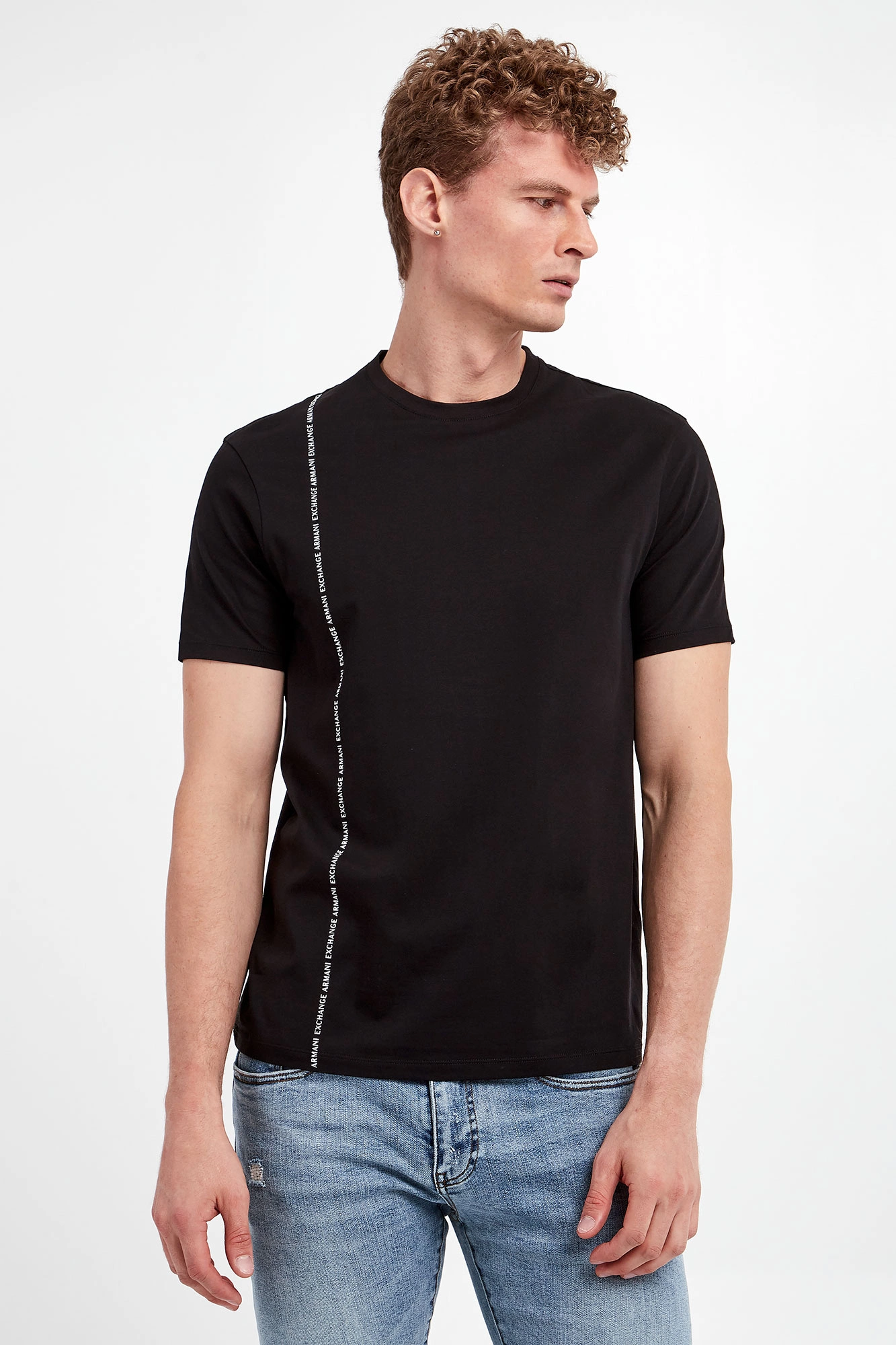 T-shirt marki Armani Exchange w czarnym kolorze. Z boku biały nadruk z logo. Dekolt typu o-neck zakończony ściągaczem. Krótkie rękawy wykończone lamówką. Z boku logowana naszywka. Fason typu regular. Wykonany z czystej bawełny.