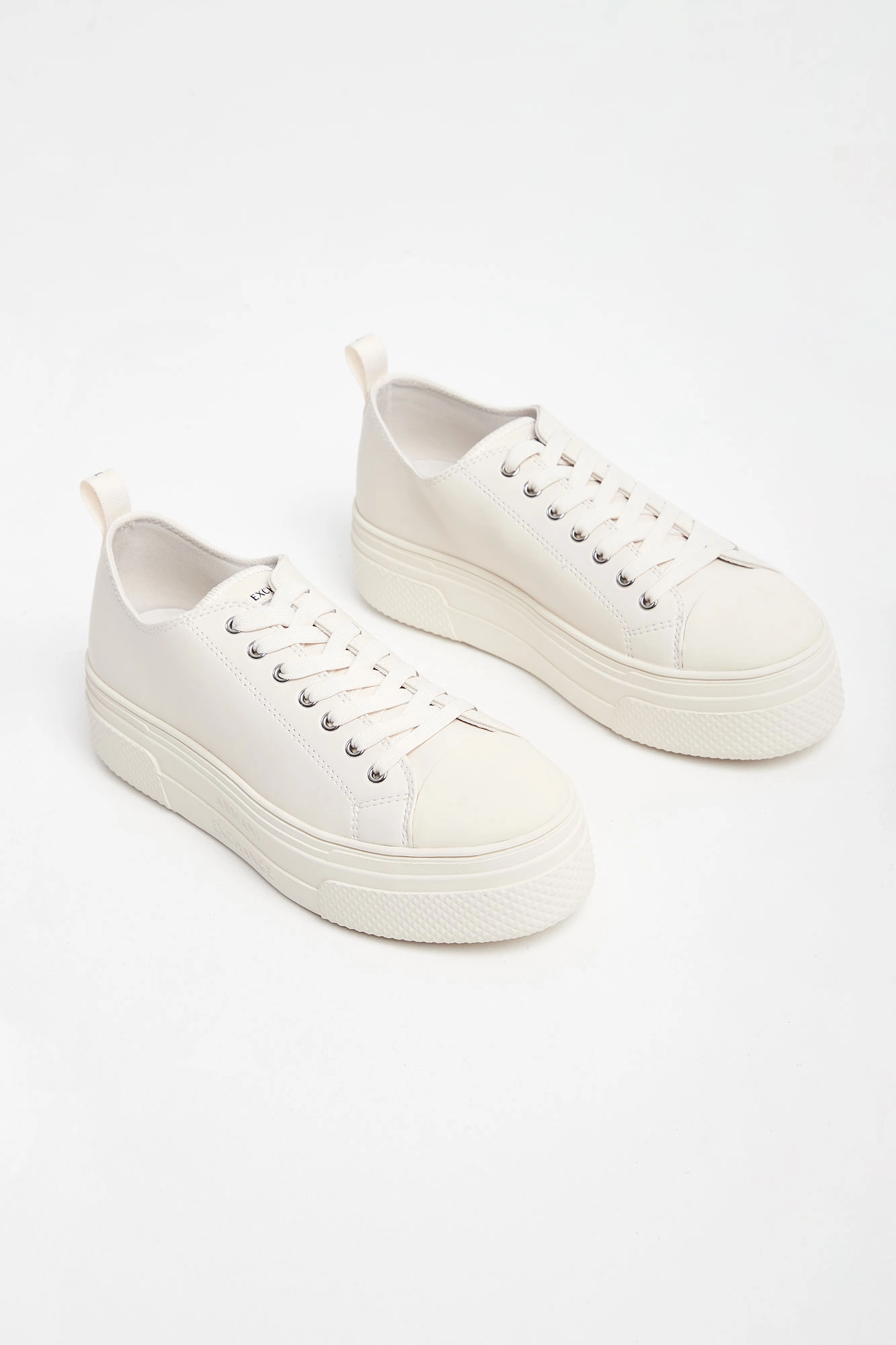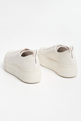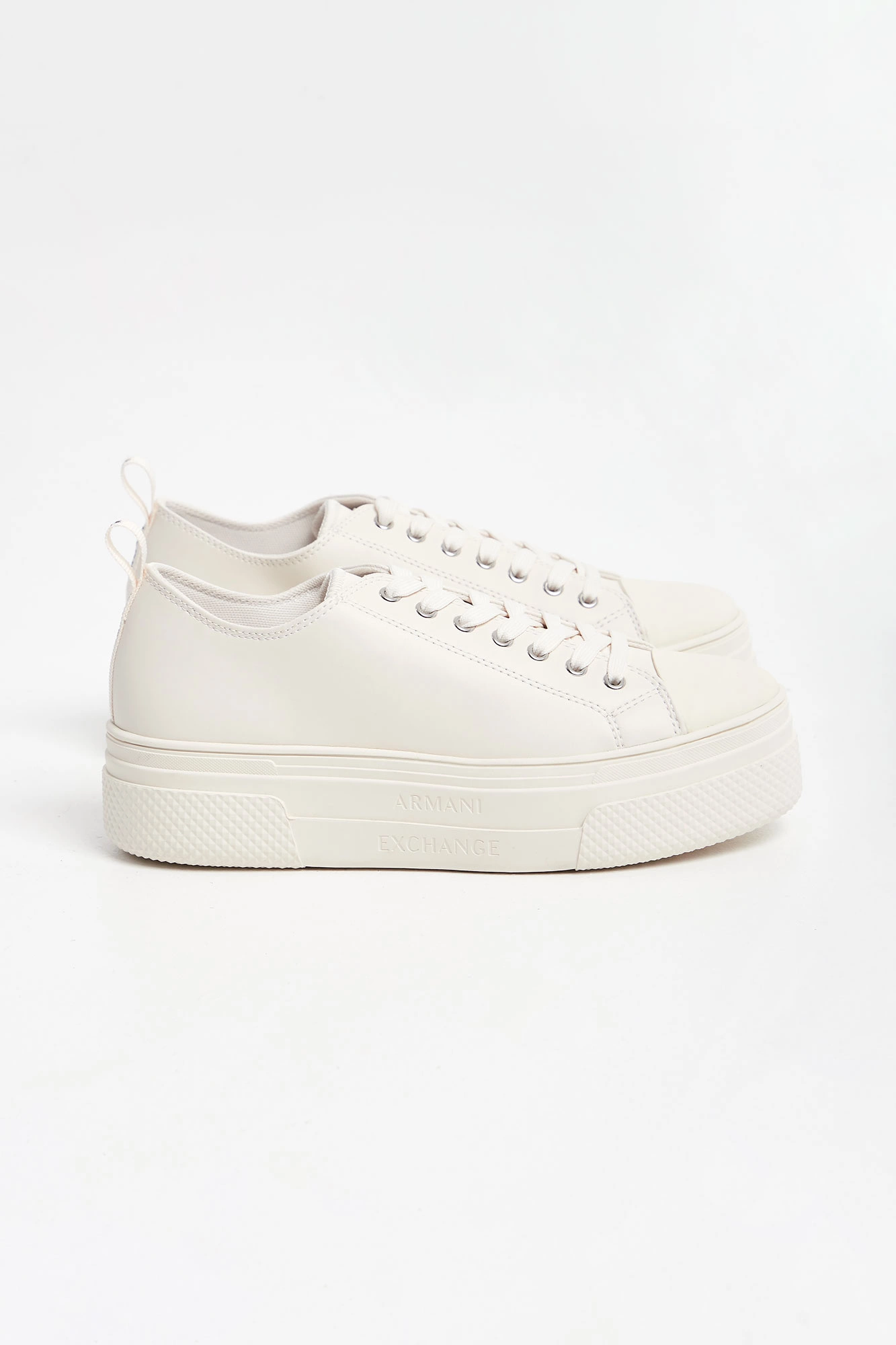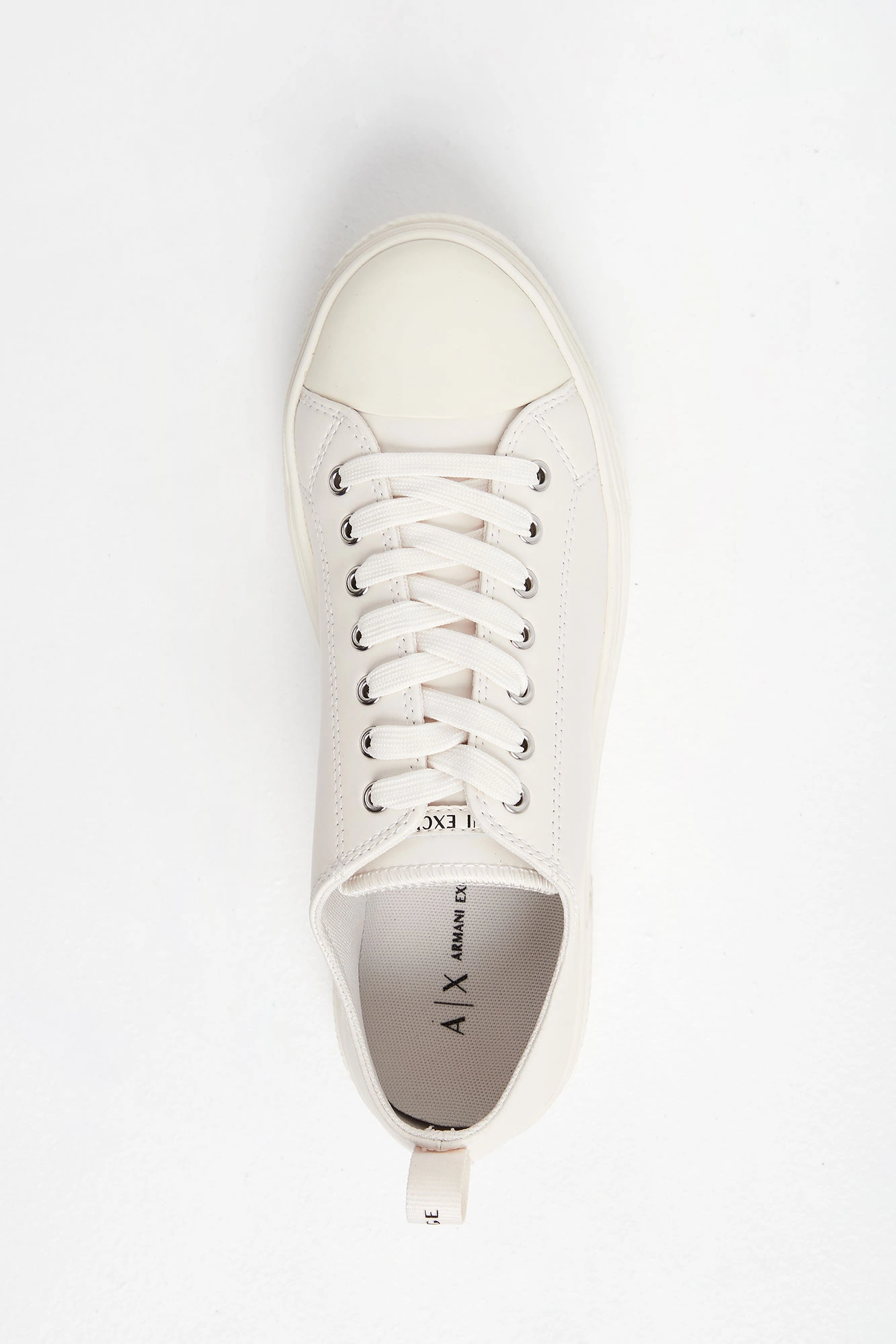 Skórzane sneakersy marki Armani Exchange w kolorze złamanej bieli. Wiązane za pomocą sznurówek. Na języku naszywka z nazwą marki. Z tyłu sygnowana pętelka ułatwiająca noszenie. Wyściółka sygnowana. Na całości przeszycia. Wysoka podeszwa z tłoczoną nazwą.