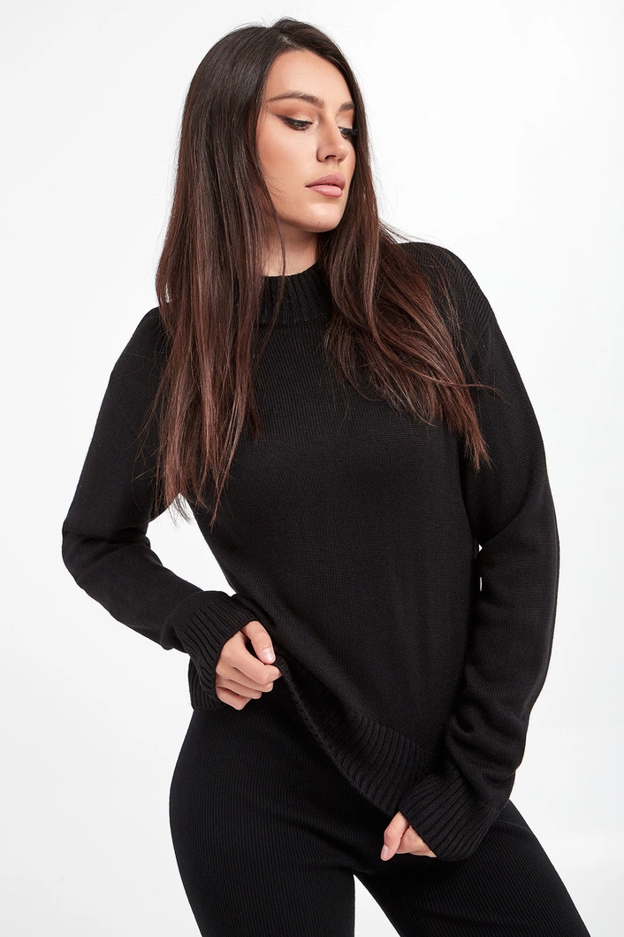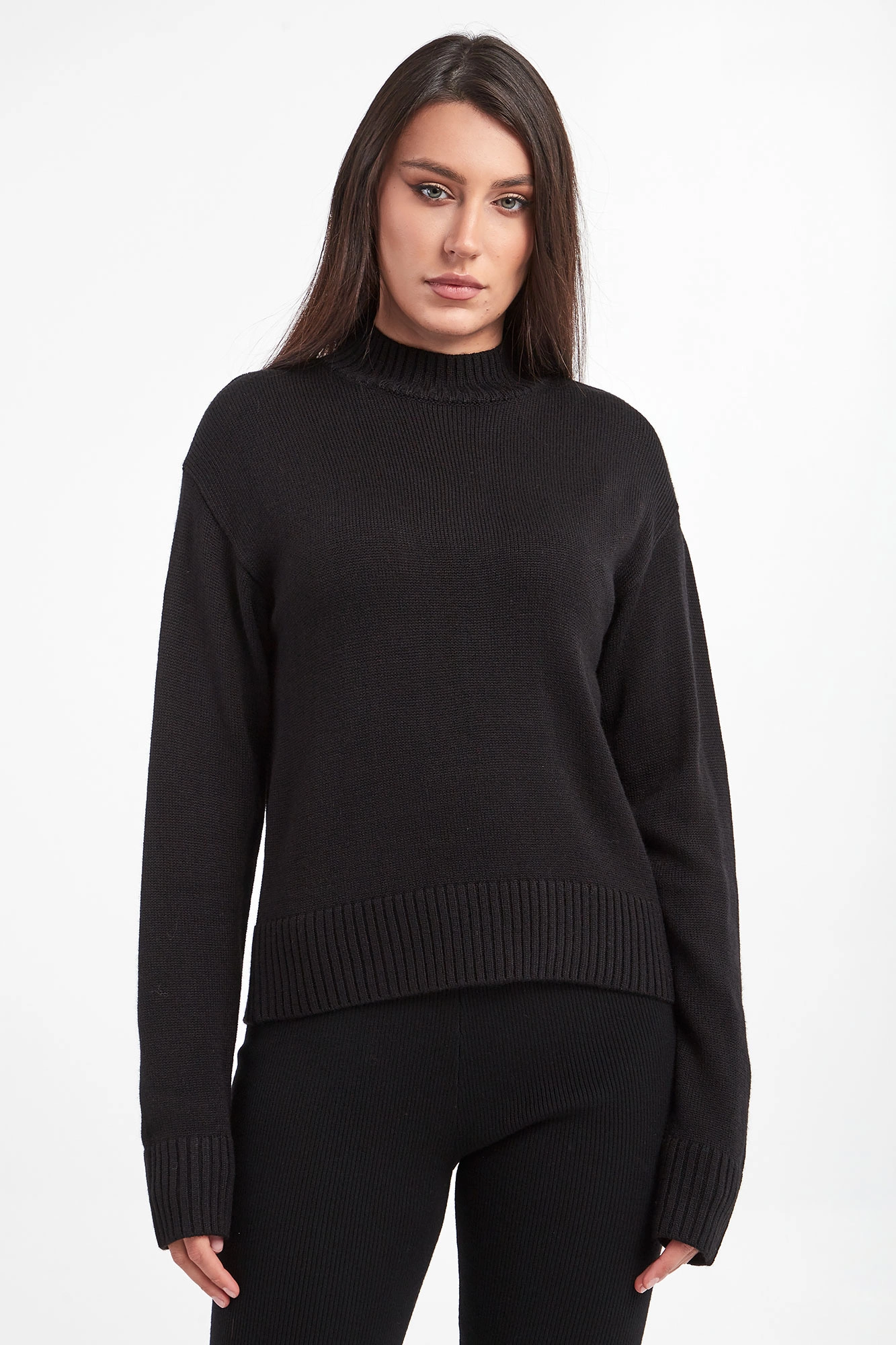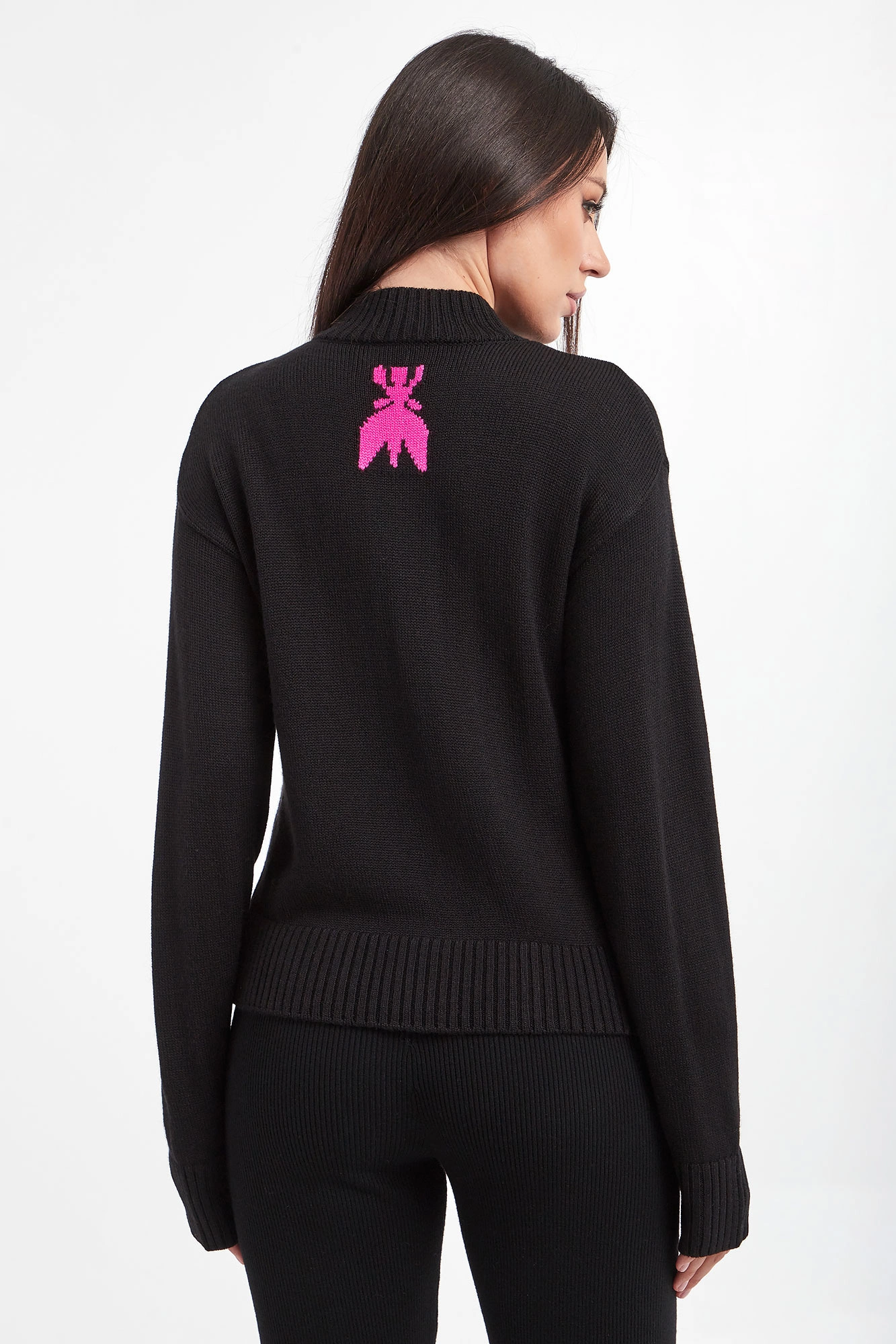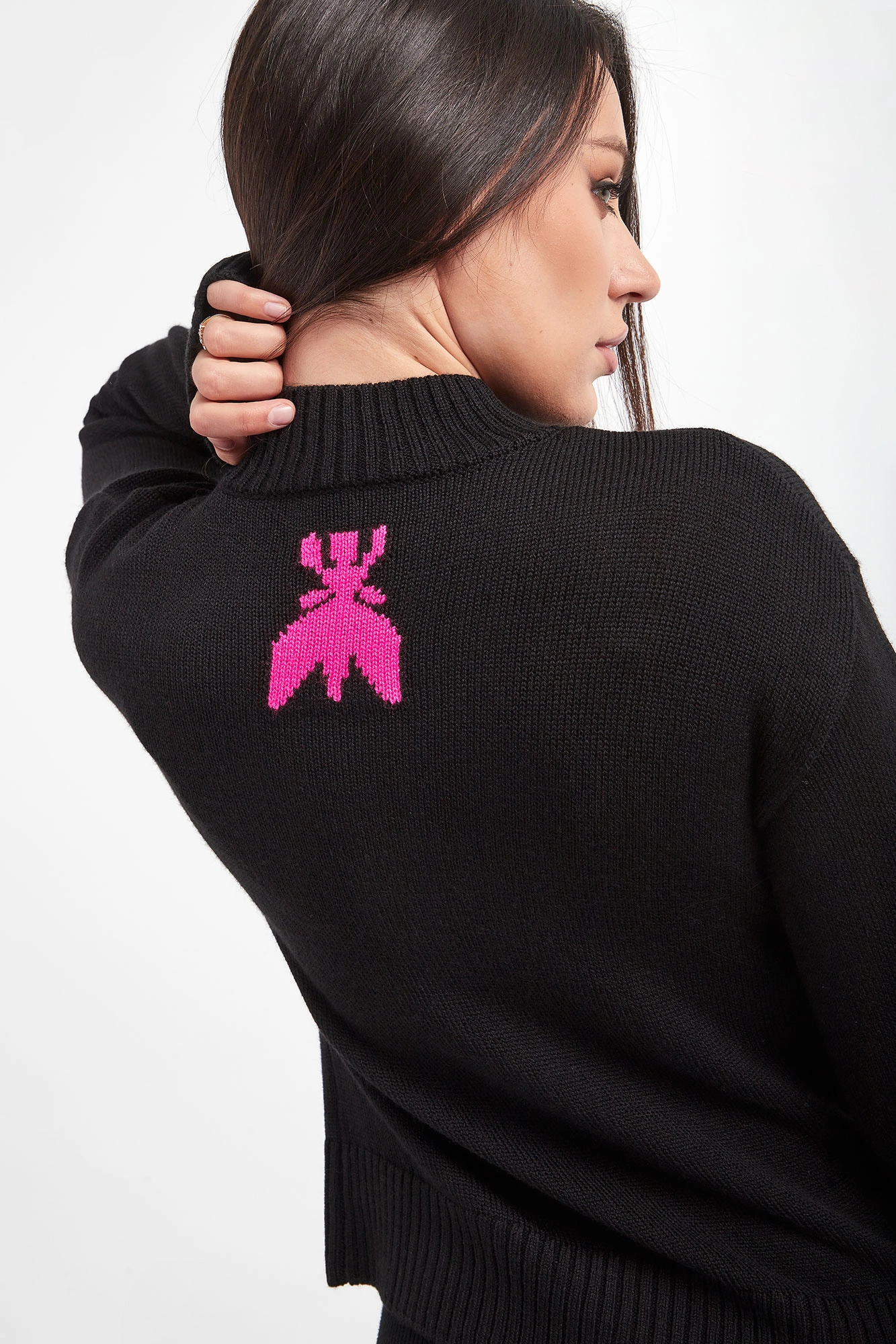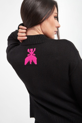 Wełniany sweter z półgolfem marki Patrizia Pepe w czarnym kolorze. Obniżona linia ramion. Długie rękawy i dół zakończone elastycznym ściągaczem. Z tyłu nadruk z logo marki w kontrastowym, różowym kolorze. Wykonany z nieco elastycznej wełny. Fason typu relaxed.