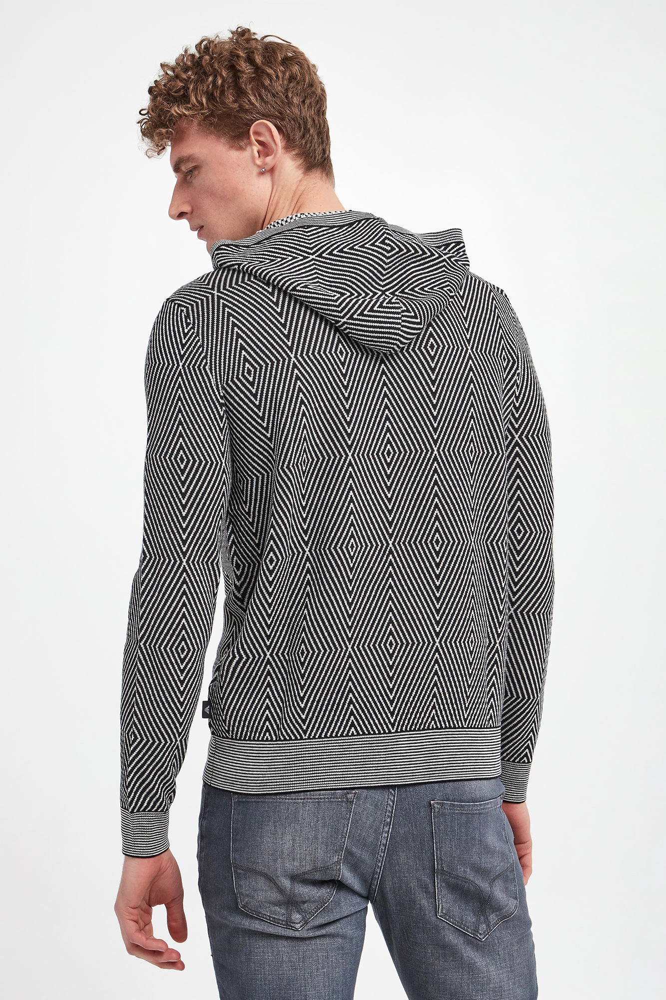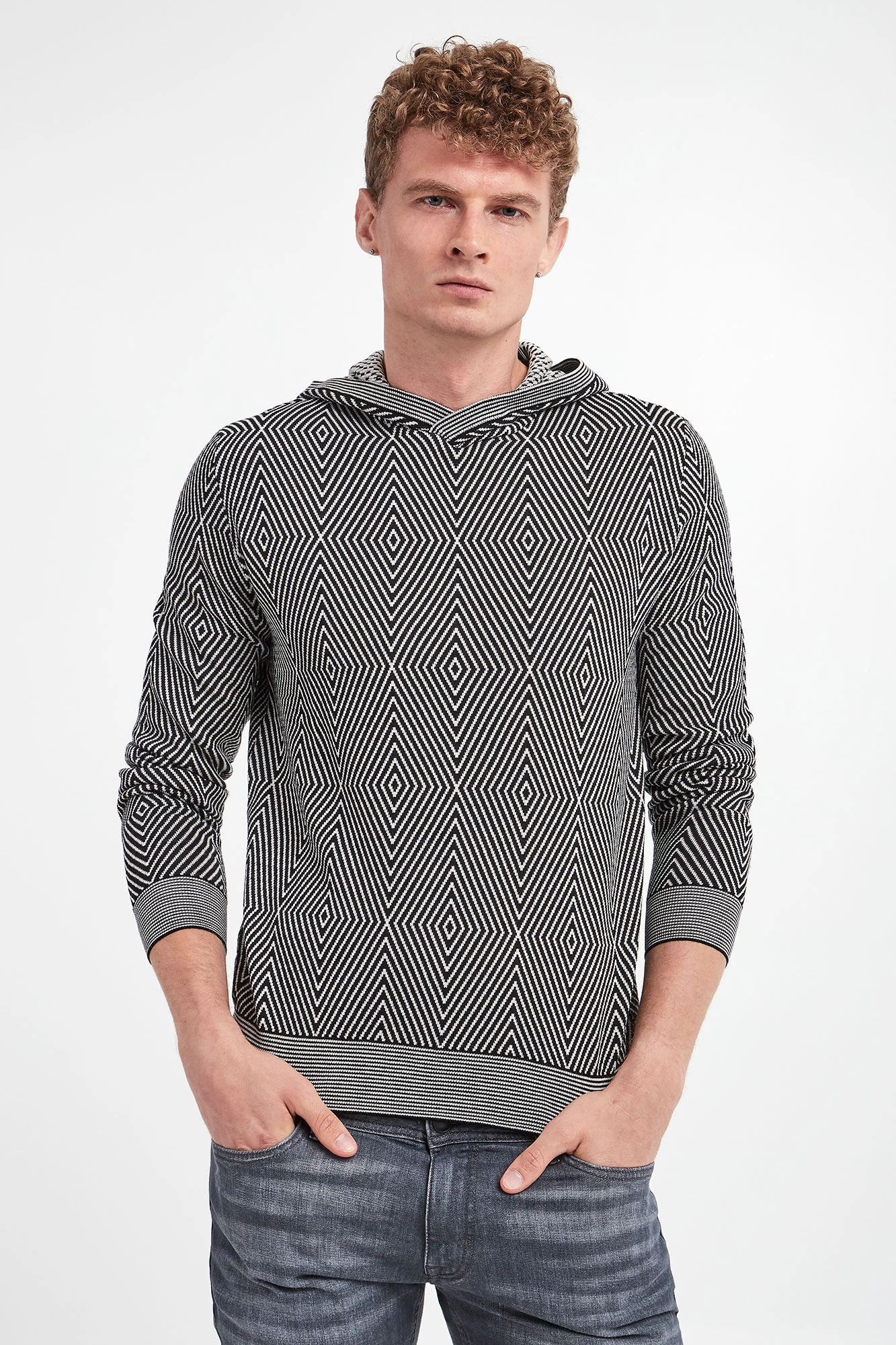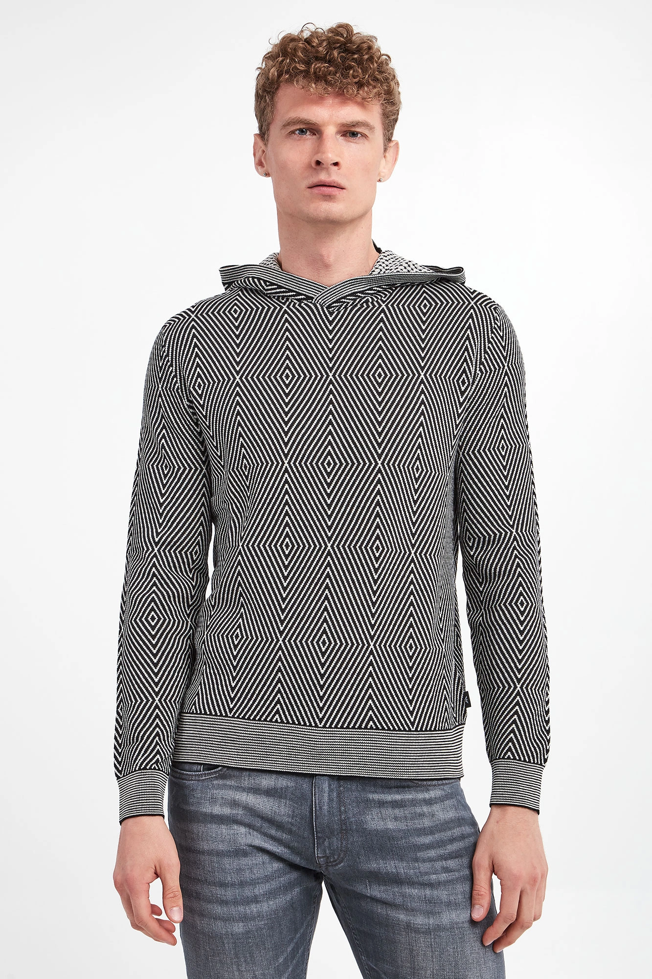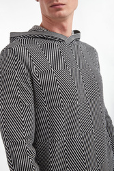Wełniany sweter z kapturem marki Emporio Armani. Na całości biało-czarne, geometryczne wzory. Kaptur, długie rękawy i dół wykończone prążkowanymi ściągaczami. Z boku sygnowana naszywka. Obniżona linia ramion. Fason typu regular.