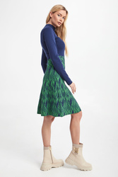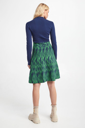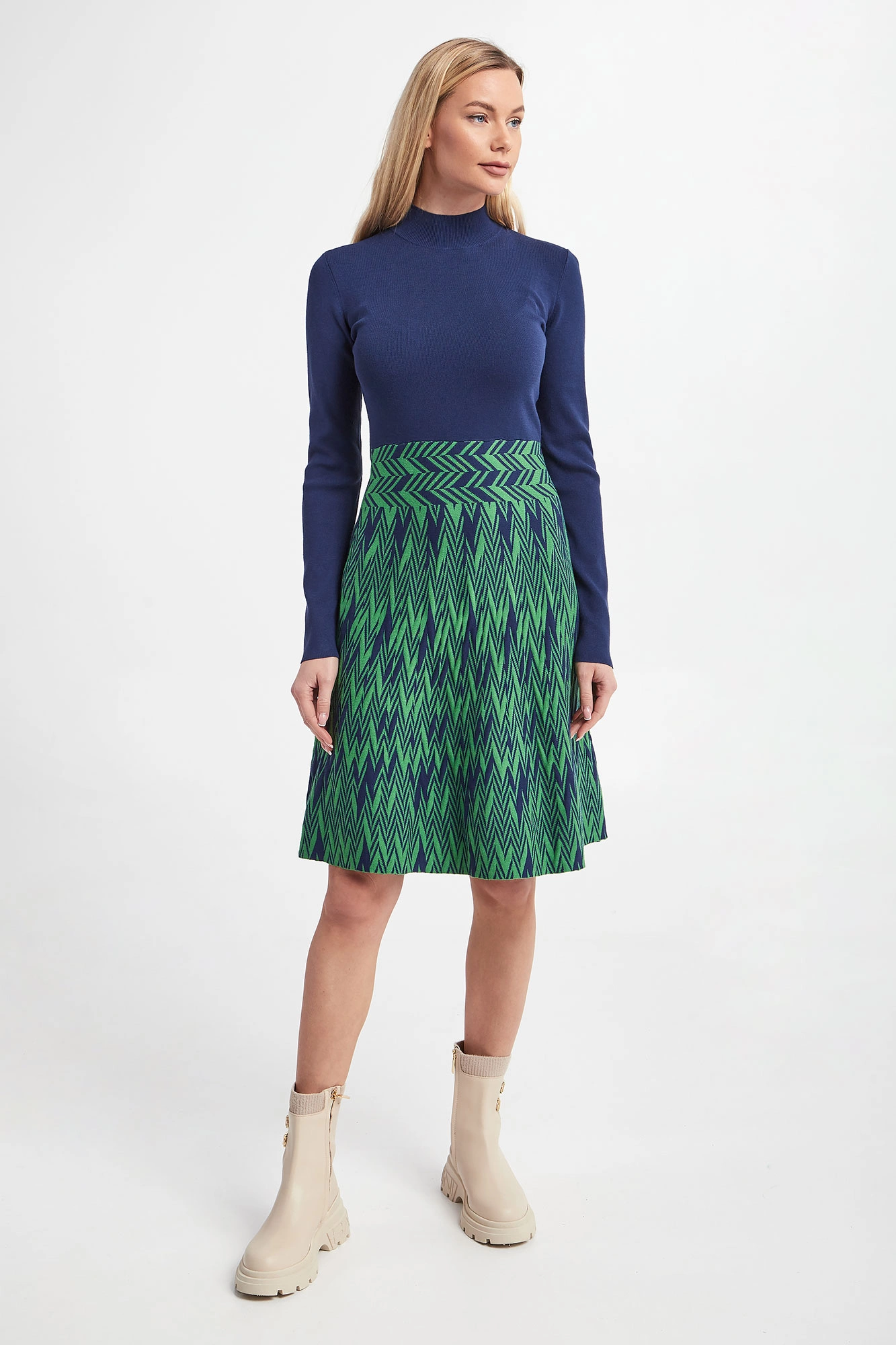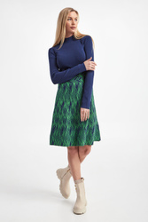 Dzianinowa sukienka marki Emporio Armani w niebieskozielonym kolorze. Dekolt wykończony półgolfem. Dół nieco rozkloszowany. Od pasa w dół pokryta dwukolorowym wzorem w jodełkę. Fason typu regular.