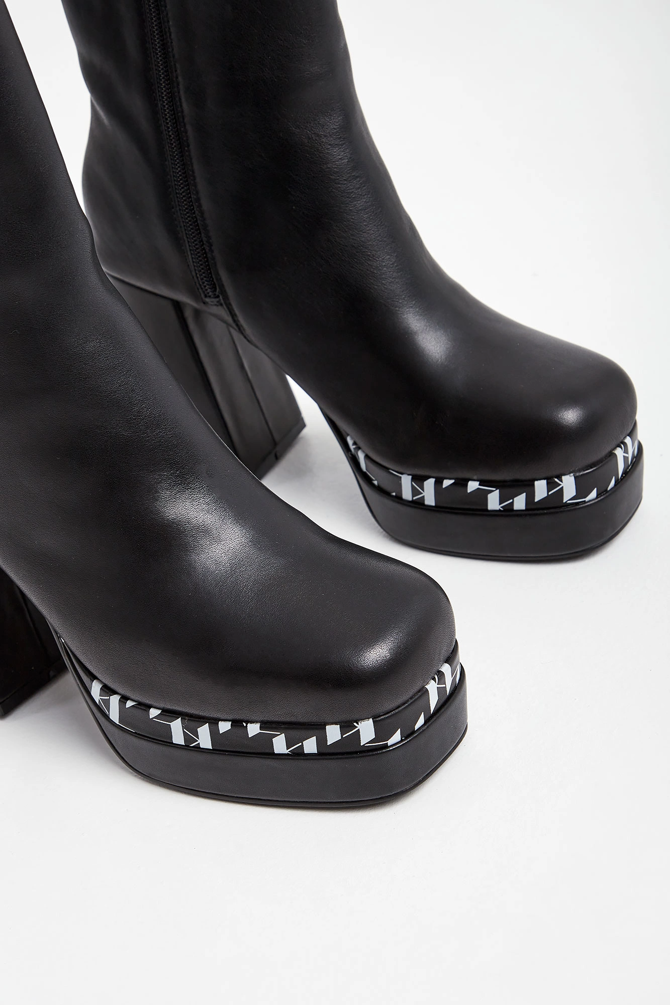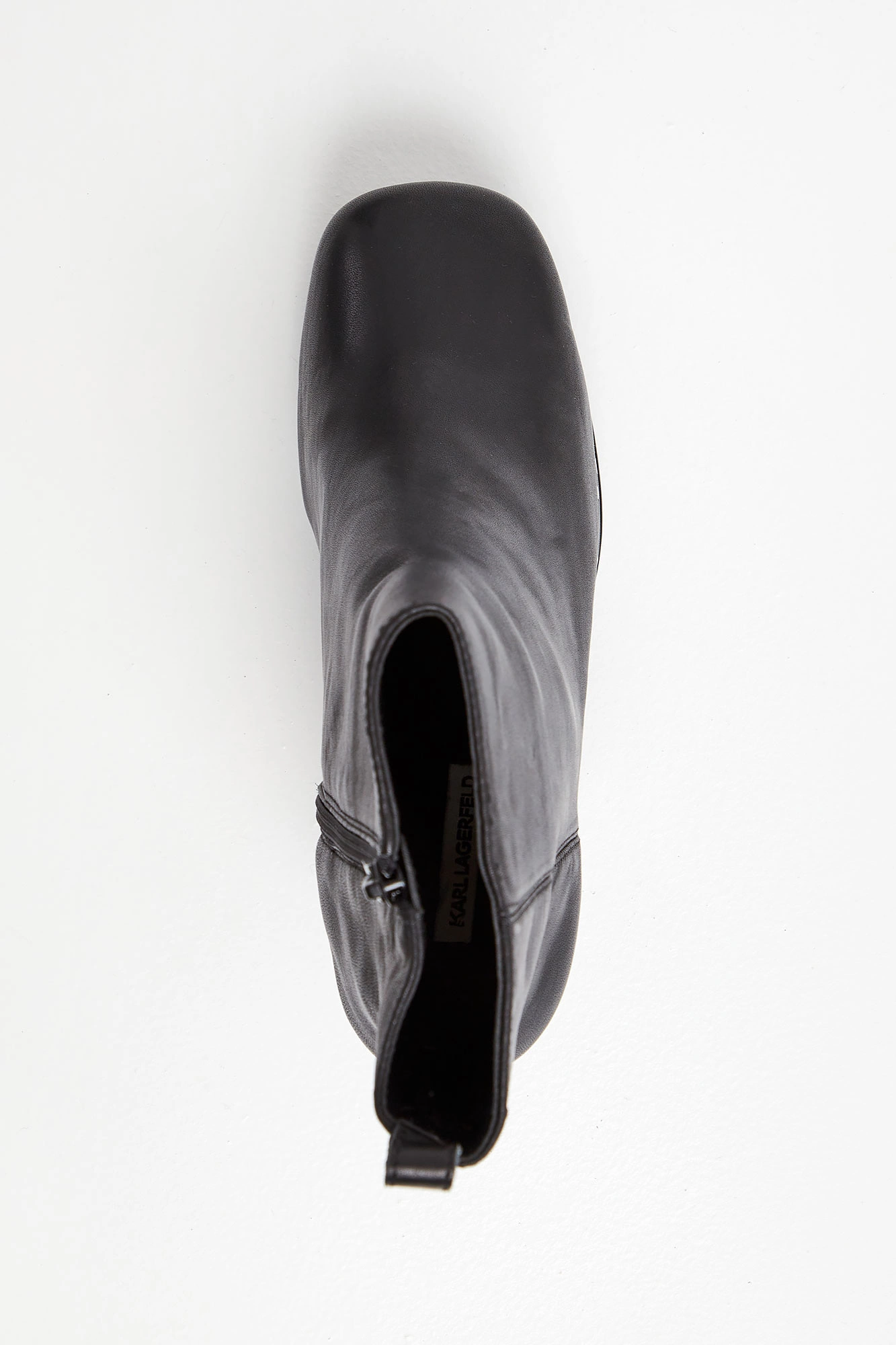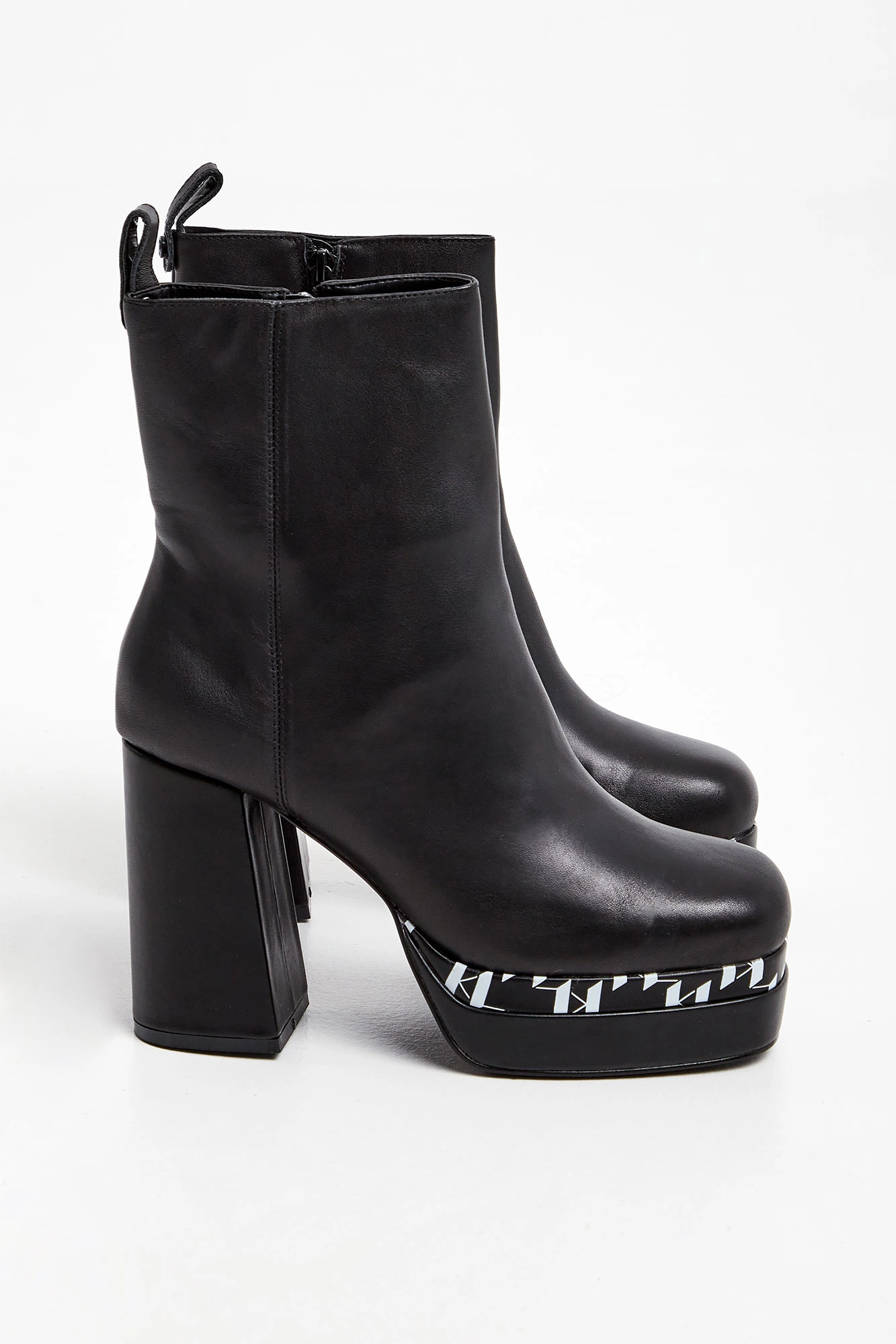 Skórzane botki marki Karl Lagerfeld w czarnym kolorze. Z kwadratowym noskiem. Zapinane z boku, na zamek z sygnowaną zawieszką. Na platformie i słupku. Część platformy z sygnowaniem. Z tyłu szlufka, ułatwiająca zakładanie buta.