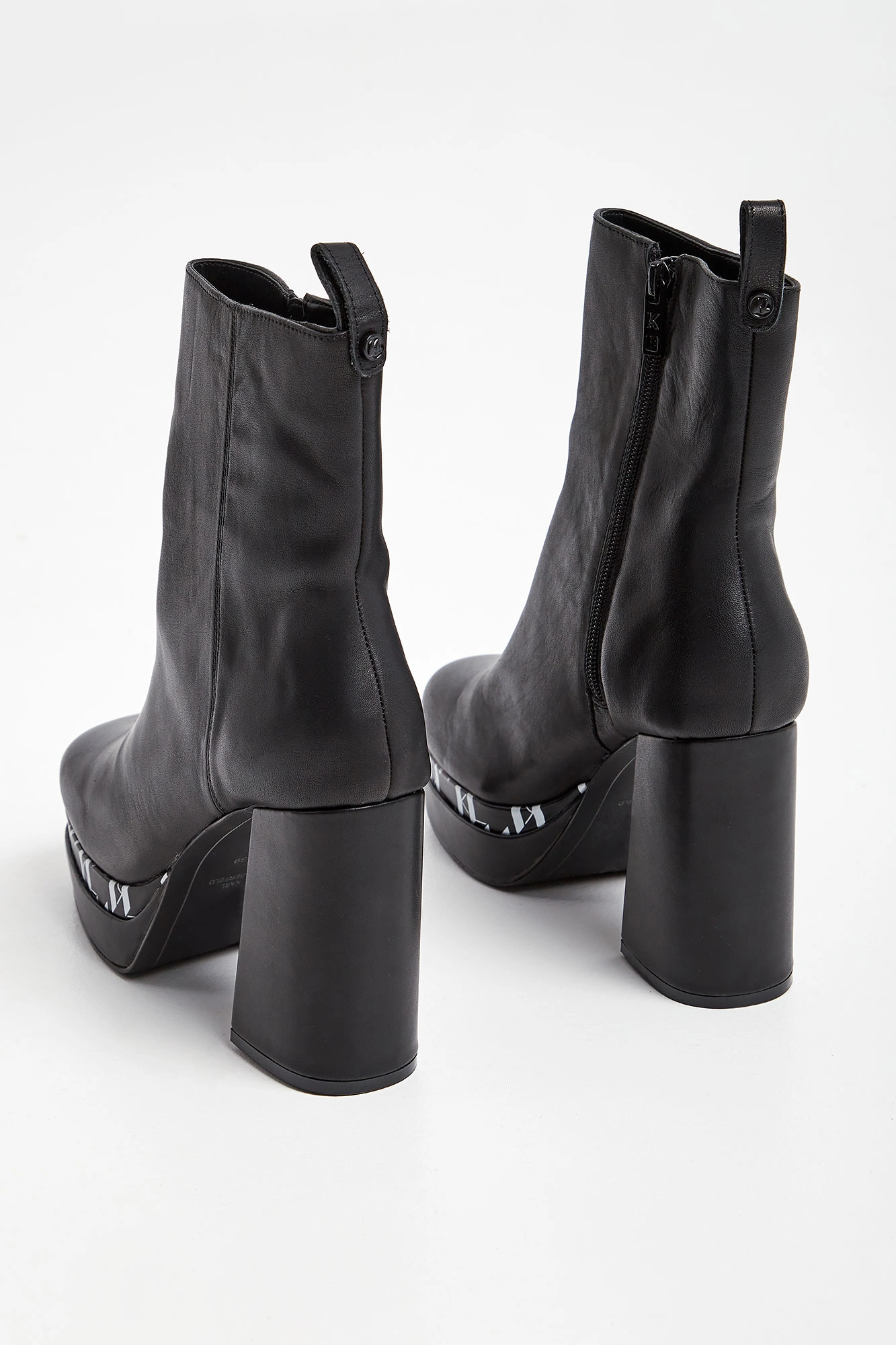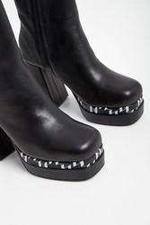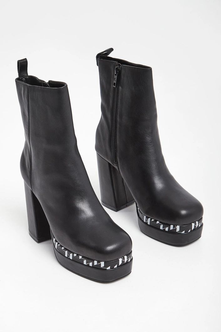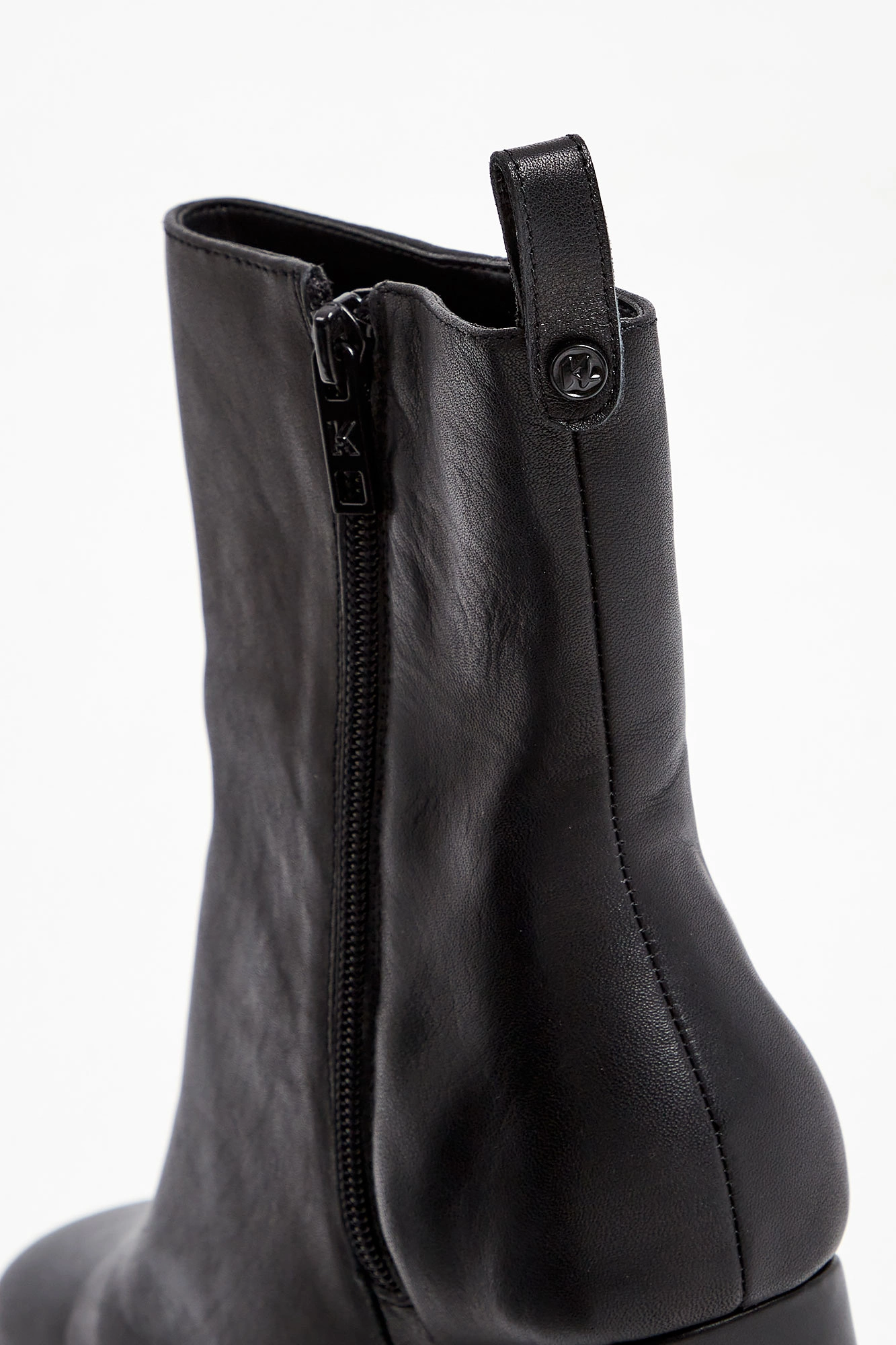 Skórzane botki marki Karl Lagerfeld w czarnym kolorze. Z kwadratowym noskiem. Zapinane z boku, na zamek z sygnowaną zawieszką. Na platformie i słupku. Część platformy z sygnowaniem. Z tyłu szlufka, ułatwiająca zakładanie buta.