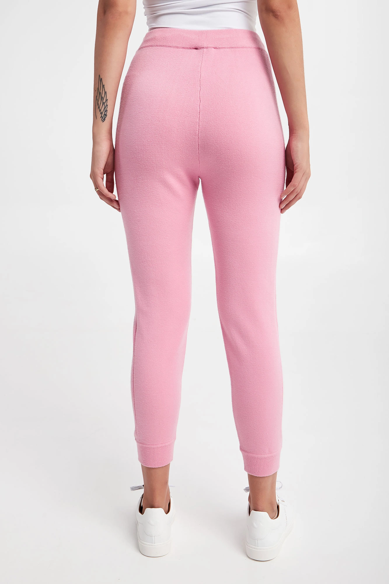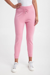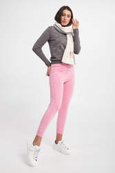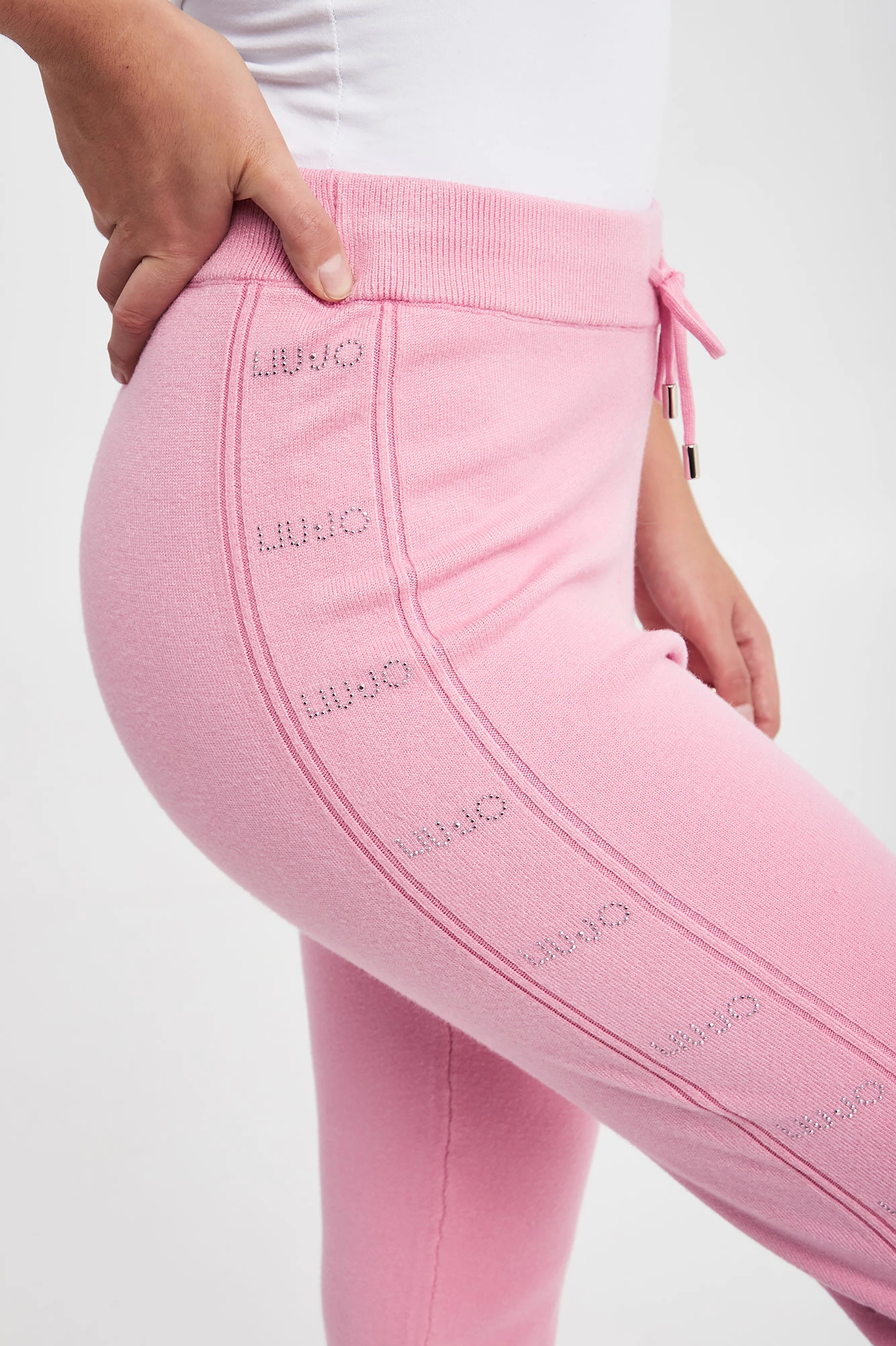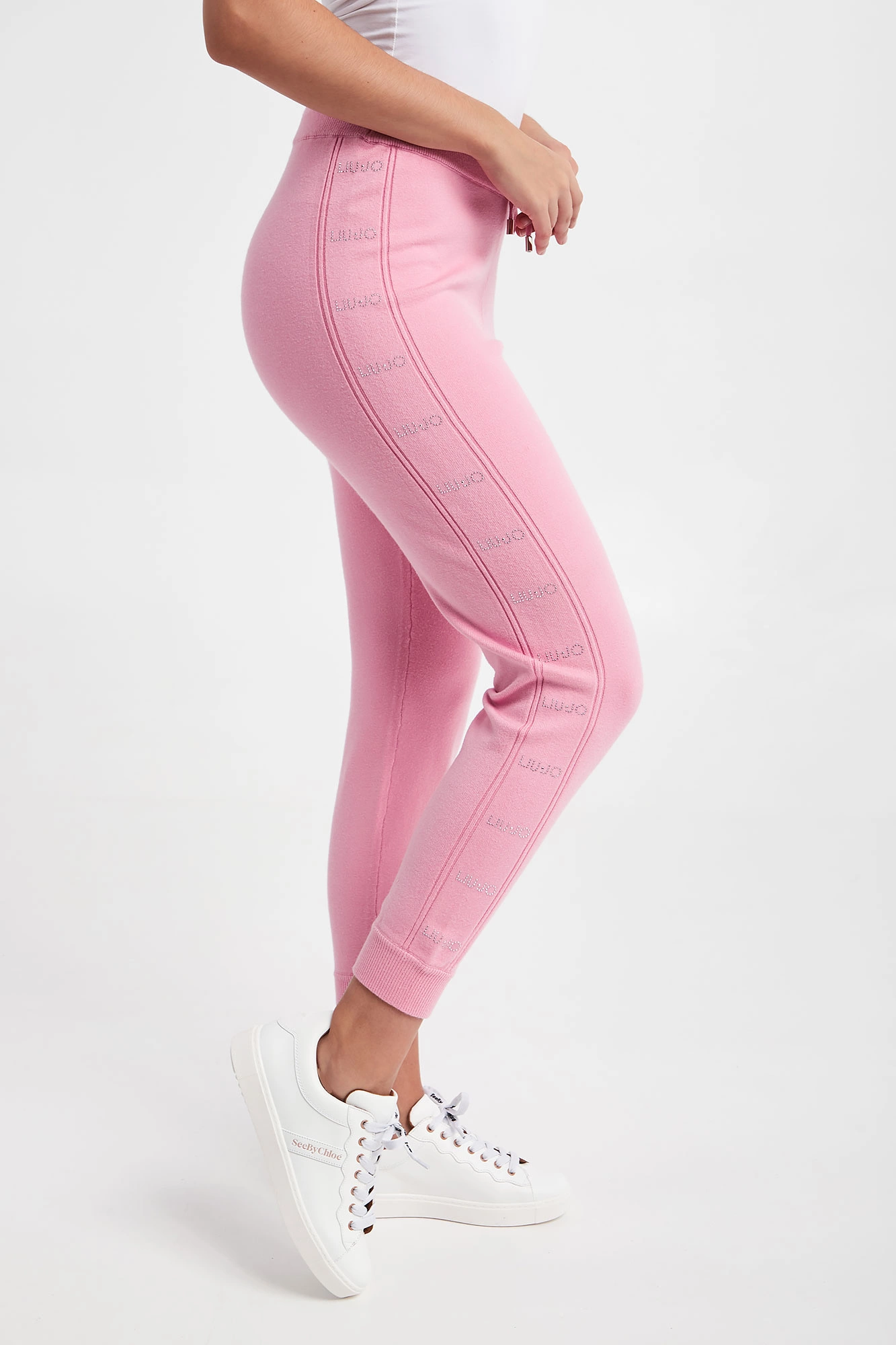 Dzianinowe spodnie marki Liu Jo w różowym kolorze. Typu jogger. W talii i na zakończeniach nogawek ściągacze. Wzdłuż nogawek cyrkonie w kształcie nazwy marki. Wykonane z elastycznej wiskozy.
