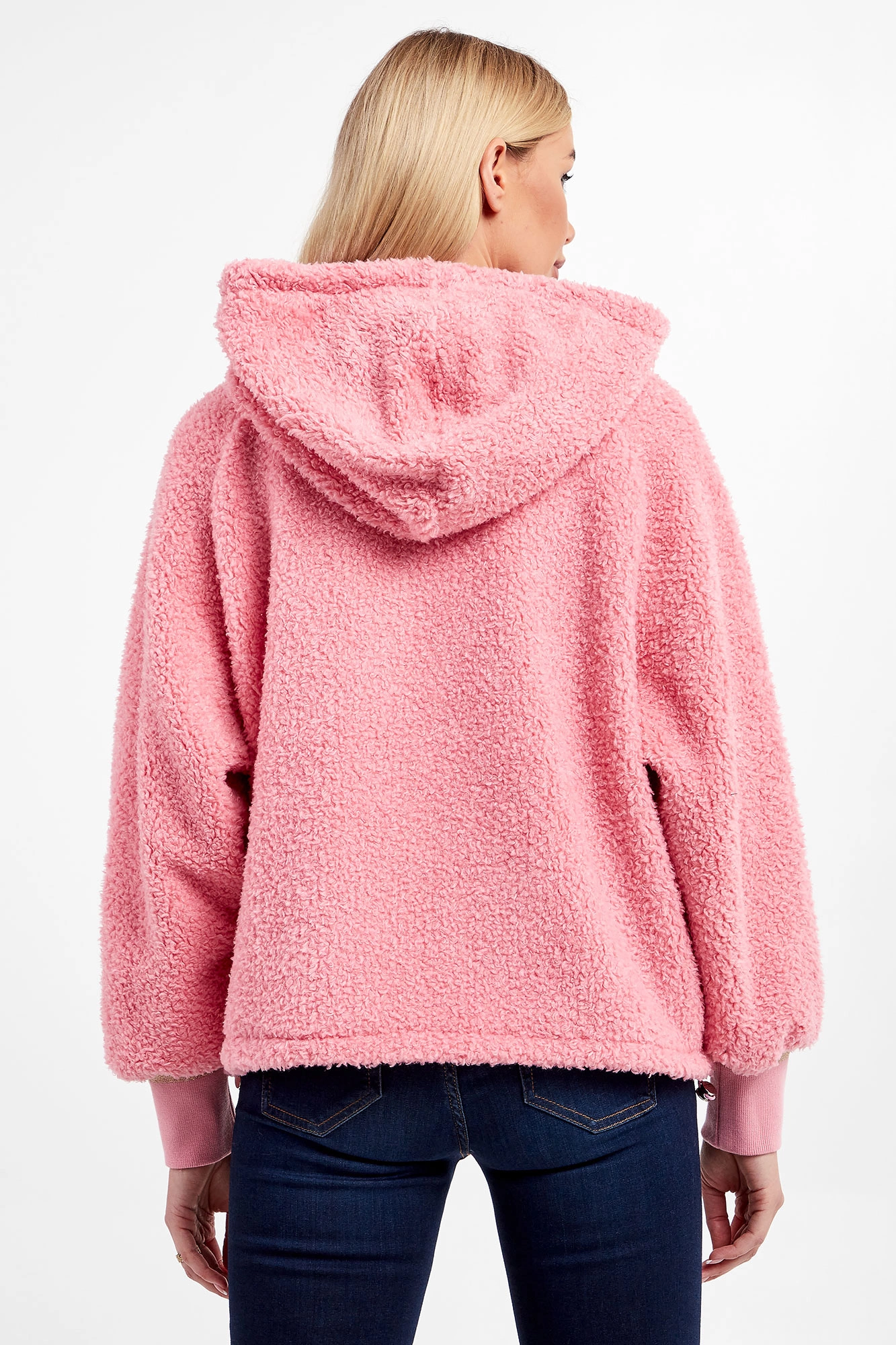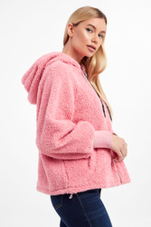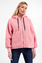 Kurtka futrzana z kapturem marki Liu Jo w różowym kolorze. Zapinana na zamek z sygnowaną zawieszką. Dwie boczne, wpuszczane kieszenie. Rękawy zakończone złoto-różowymi, szerokimi ściągaczami, które zapobiegają wpadaniu chłodnego powietrza. Na rękawie złoty haft z logo. Kaptur regulowany za pomocą czarno-białych, logowanych troczków. U dołu ściągacze. Fason typu relaxed. Wykonana z futra syntetycznego.