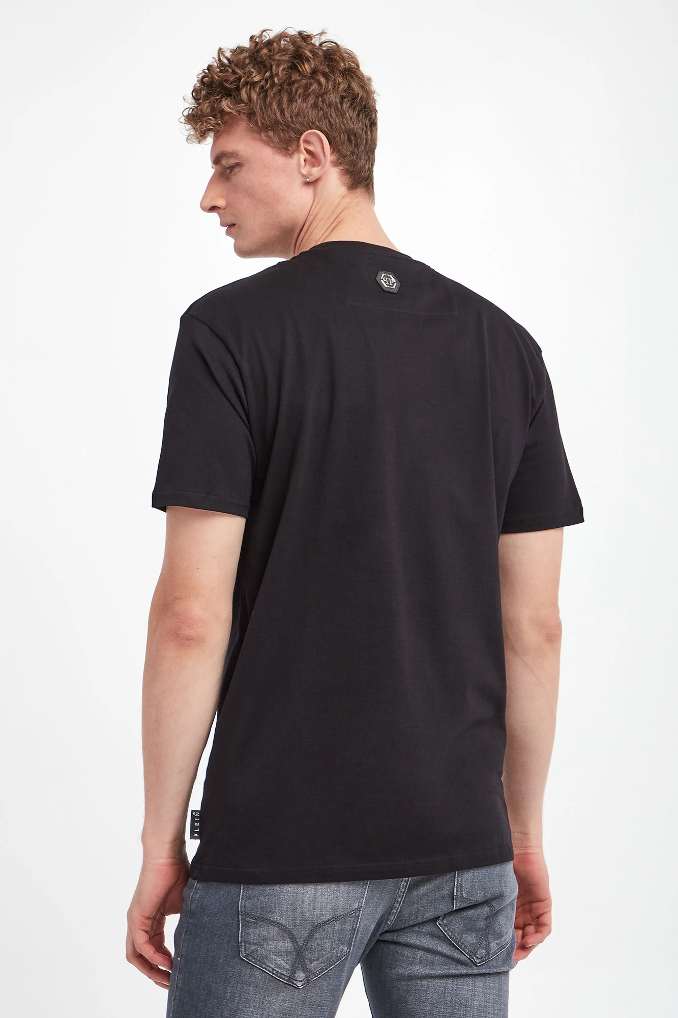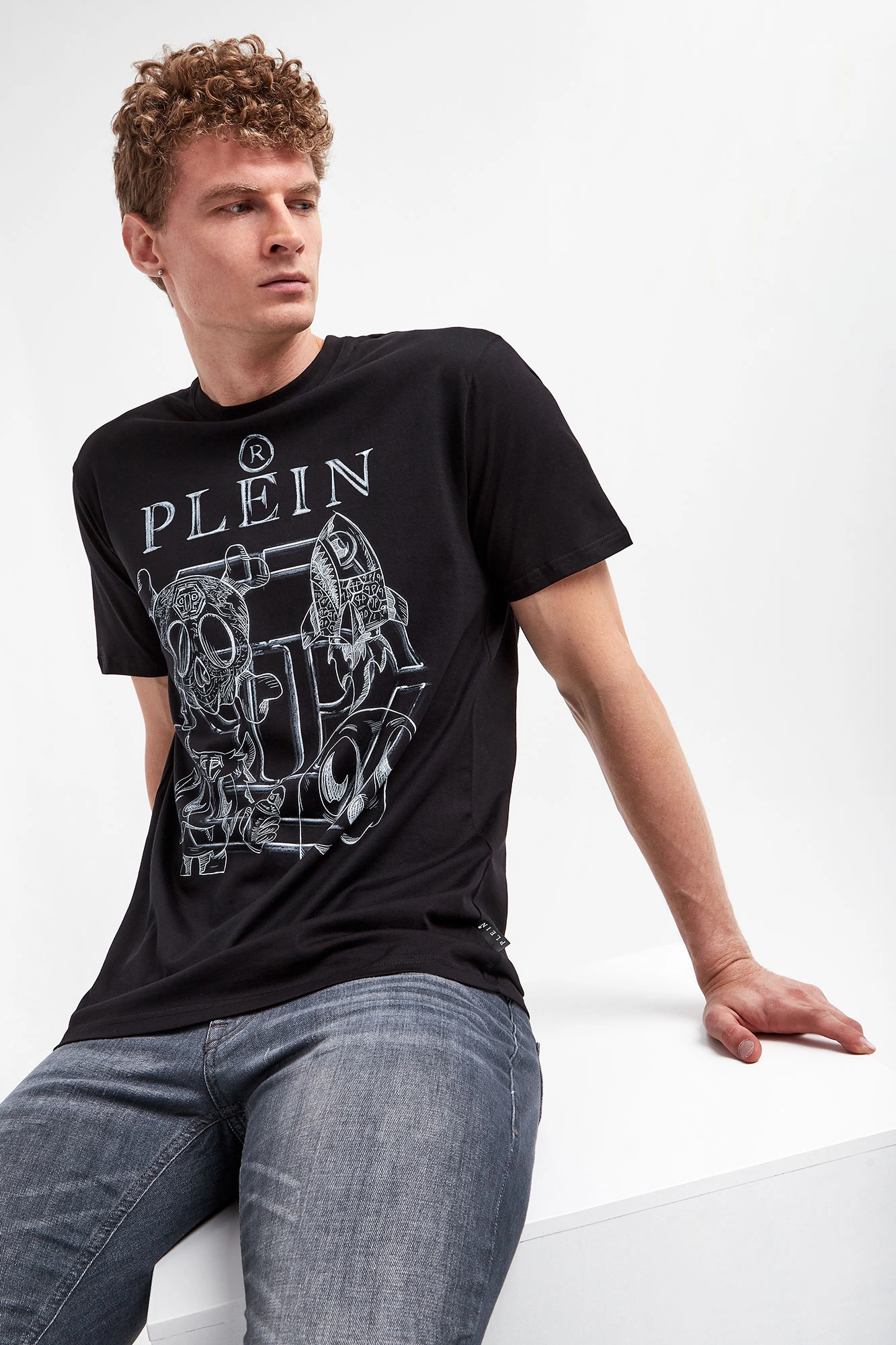 T-shirt marki Philipp Plein w czarnym kolorze. Na froncie biały, komiksowy nadruk z logo. Dekolt typu o-neck zakończony prążkowanym ściągaczem. Krótkie rękawy i dół wykończone lamówką. Z boku logowana naszywka. Fason typu regular. Wykonany ze stuprocentowej bawełny.