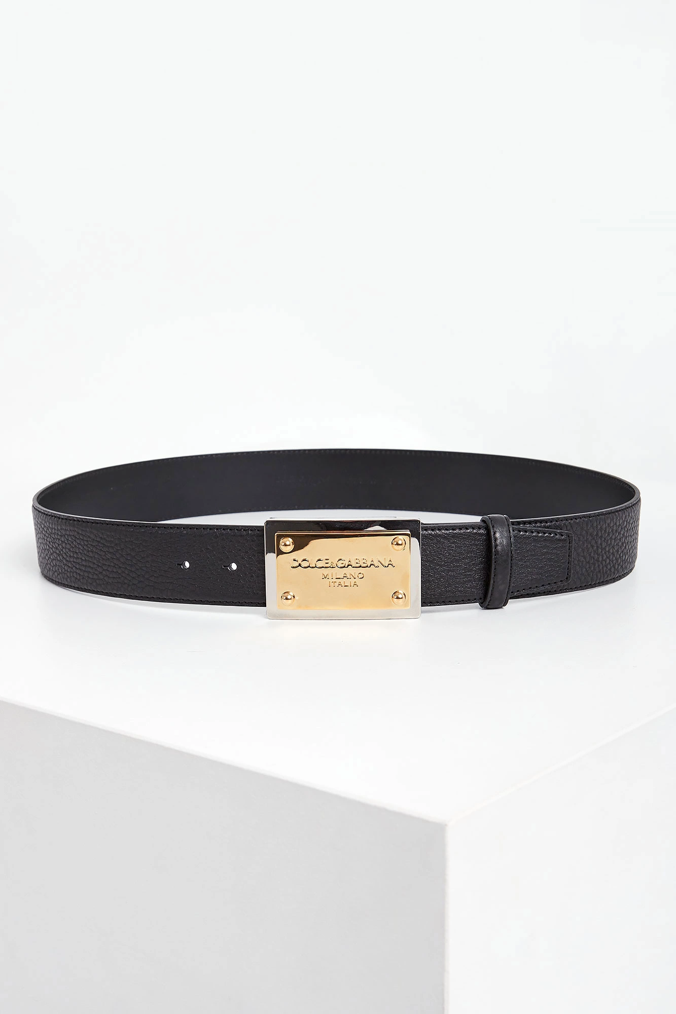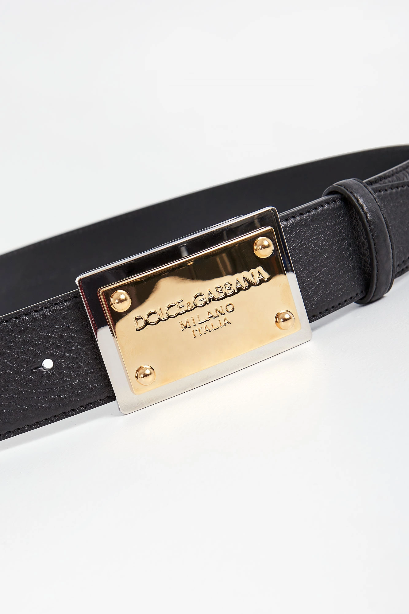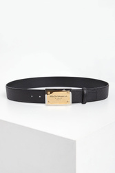 Skórzany pasek marki Dolce & Gabbana w czarnym kolorze. Zapinana za pomocą złoto-srebrnej klamry z tłoczoną nazwą marki. Wykonany ze skóry cielęcej.