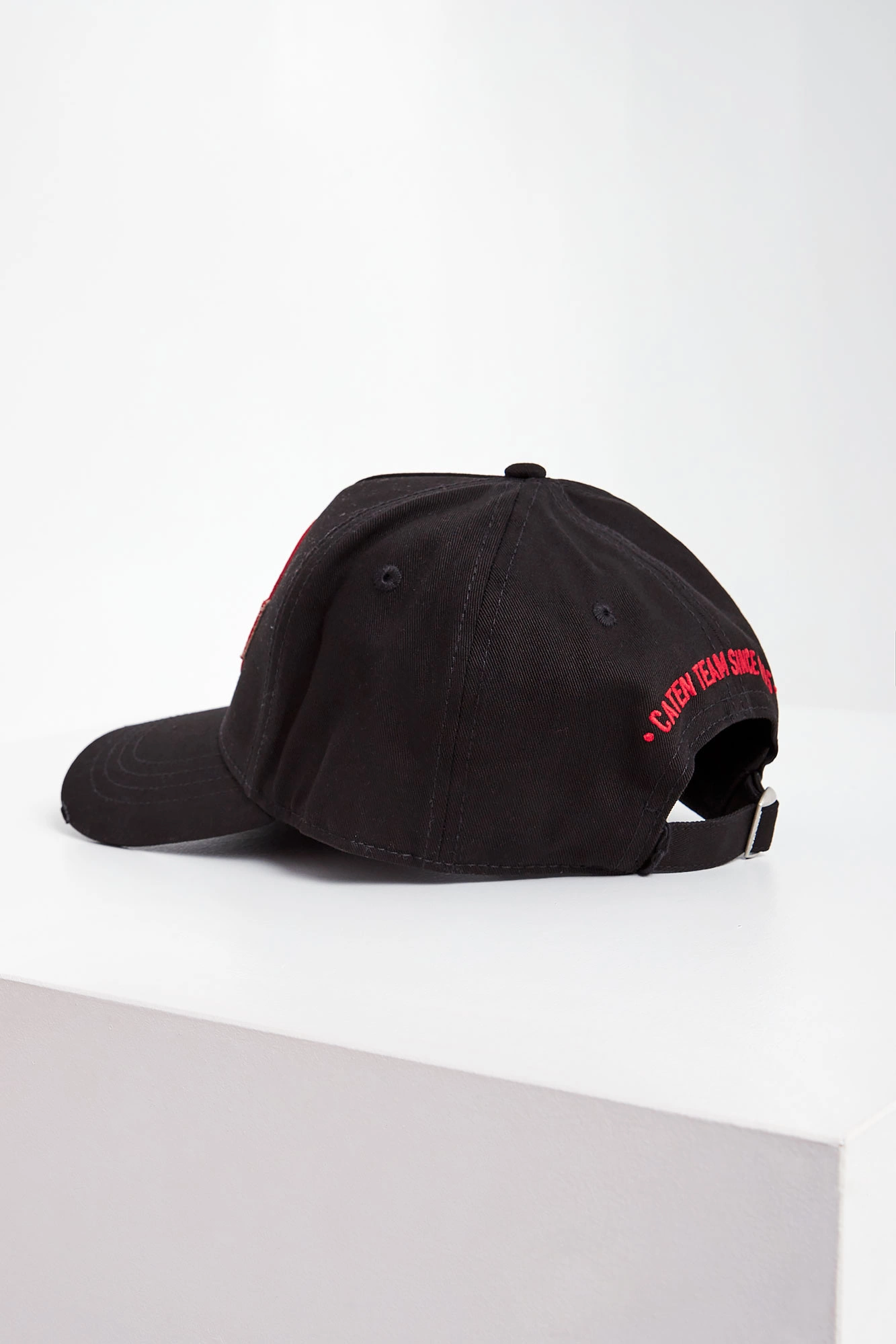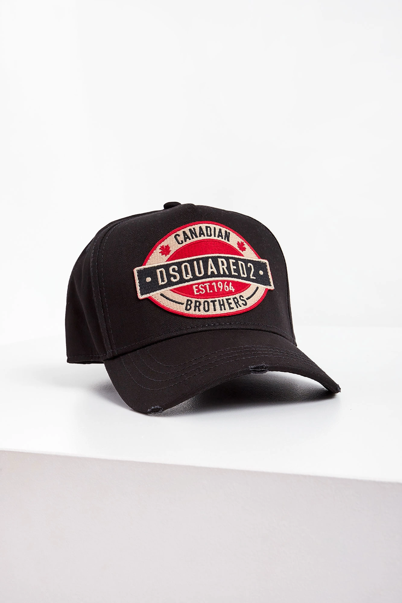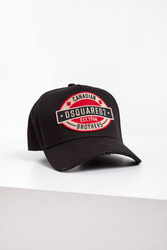 Czapka marki Dsquared2 w czarnym kolorze. Z przodu kolorowa naszywka z nazwą i logo marki. Z tyłu, nad regulacją, wyszyty czerwony napis. Na daszku ozdobne przeszycia i przetarcia. Wygodna i przewiewna. Wykonana z czystej bawełny.