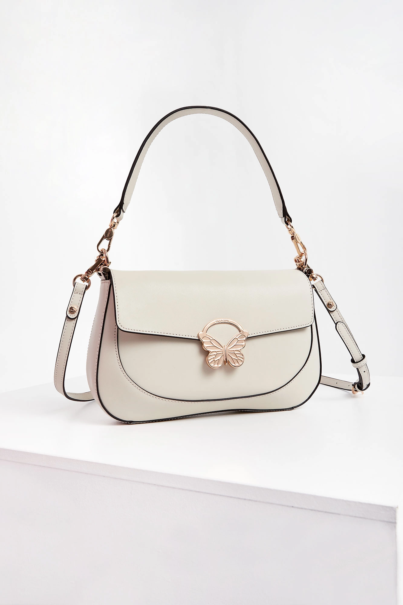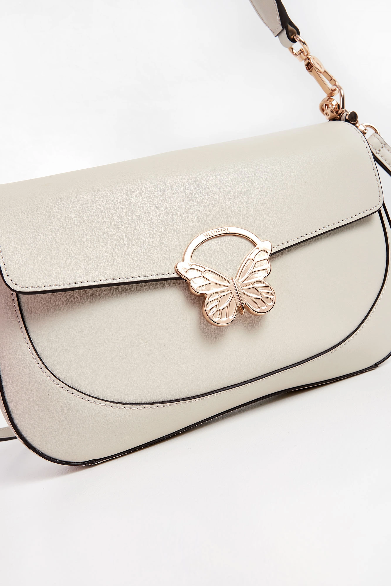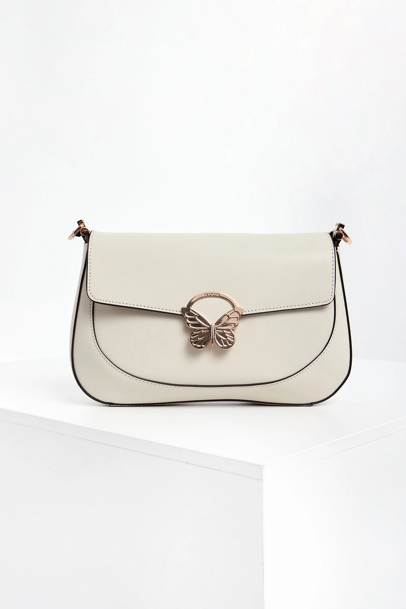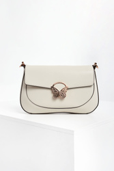 Torebka skórzana marki Blugirl Blumarine w kolorze ecru. Klapa ozdobiona złotym, sygnowanym motywem motyla i zamykana za pomocą napy. Do noszenia na długim, regulowanym pasku lub odpinanej rączce. Okucia w kolorze złotym.