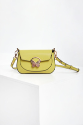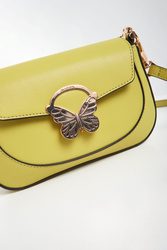 Torebka skórzana marki Blugirl Blumarine w limonkowym kolorze. Klapa ozdobiona złotym, sygnowanym motywem motyla i zamykana za pomocą napy. Do noszenia na długim, regulowanym pasku lub odpinanej rączce. Okucia w kolorze złotym.