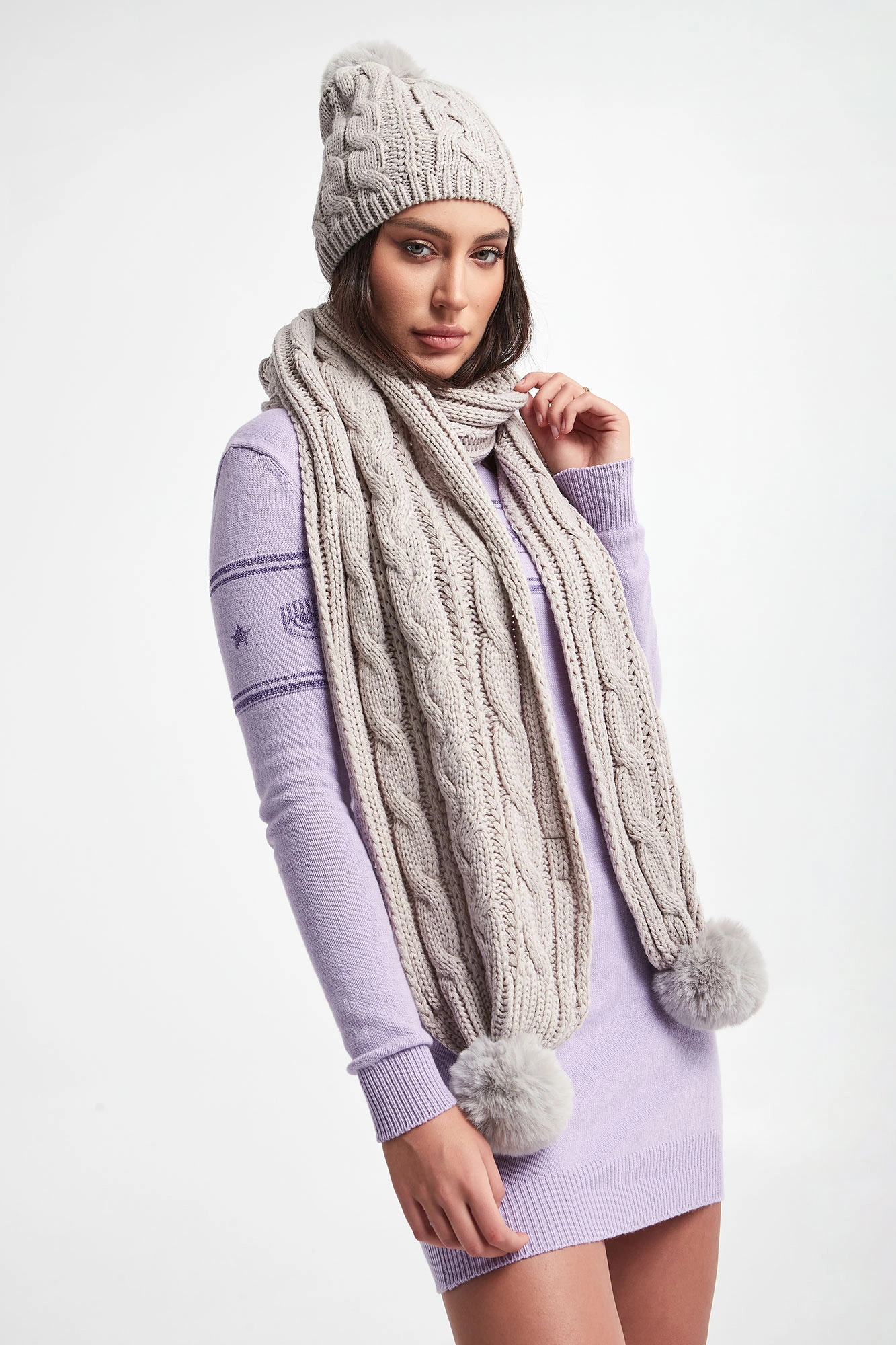 Szal marki Twinset w szarym kolorze. Na całości warkoczowy splot. Wykończony futerkowymi pomponami. Posiada aplikację w postaci złotej zawieszki z logo marki. Ciepły, bardzo miękki i ponadczasowy.