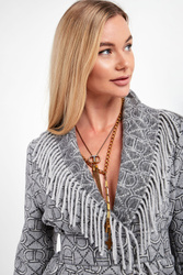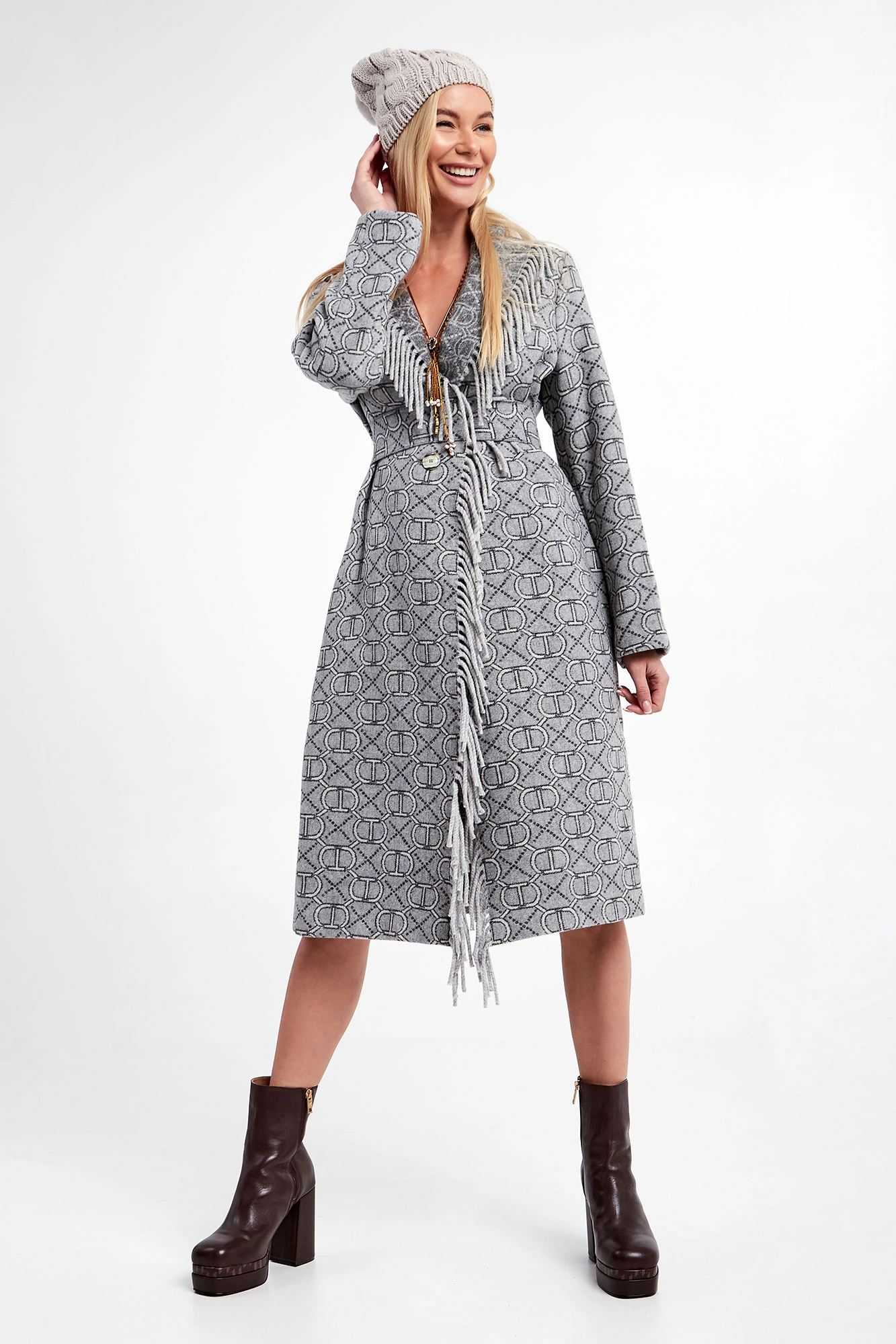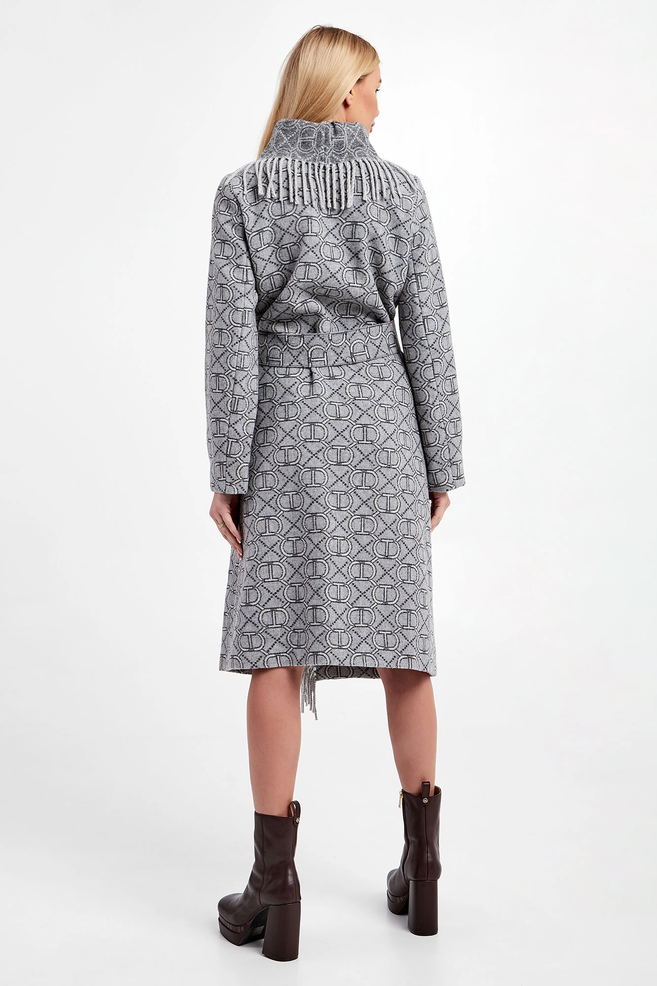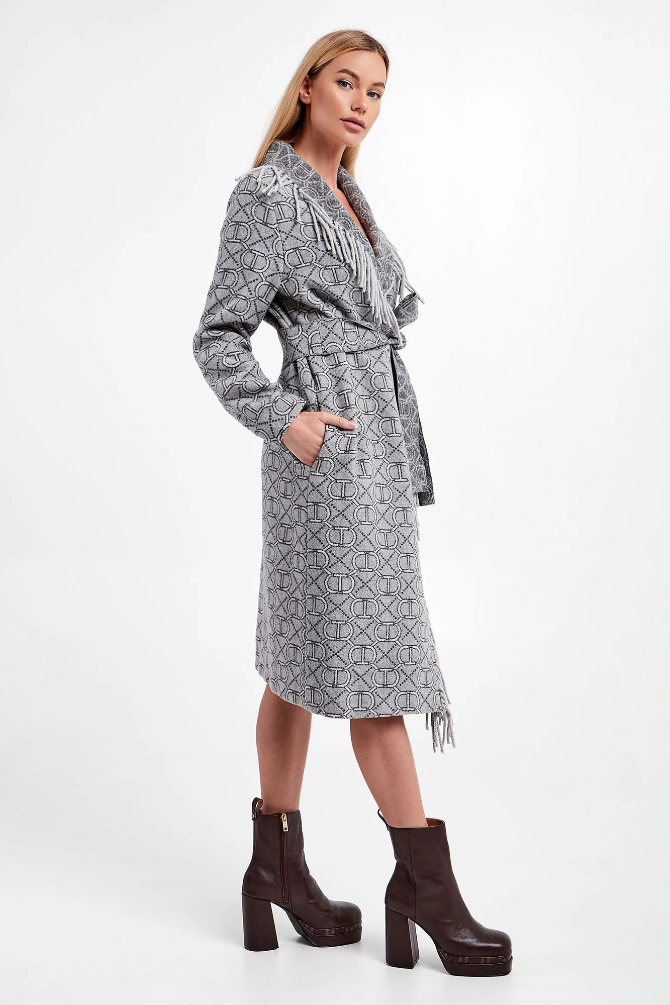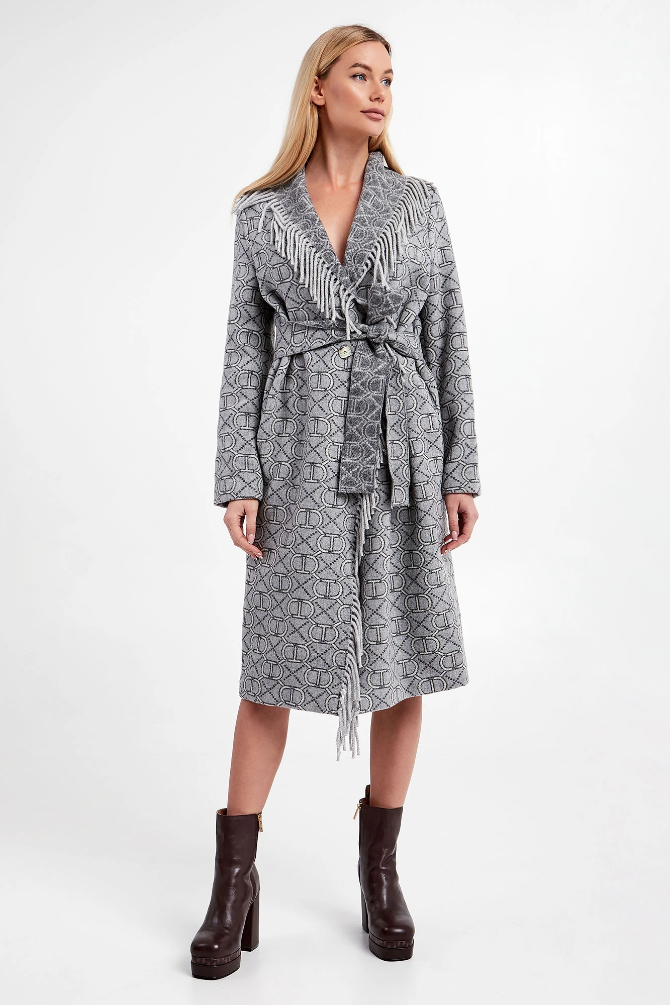 Wełniany płaszcz marki Twinset w szarym kolorze. Na całości nadruk z logo marki. Kołnierz wykończony frędzlami. W talii pasek oraz zapięcie na guzik. Fason typu regular, typ szlafrokowy. Model z dwoma wpuszczanym po boku kieszeniami. Na linii karku metalowa aplikacja z logo marki. Wykonany z przyjemnej w dotyku wełny.