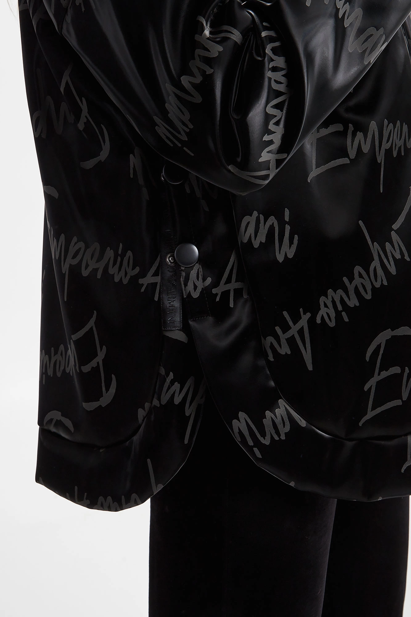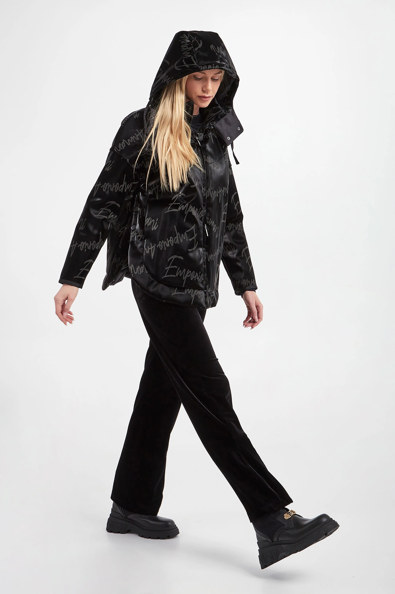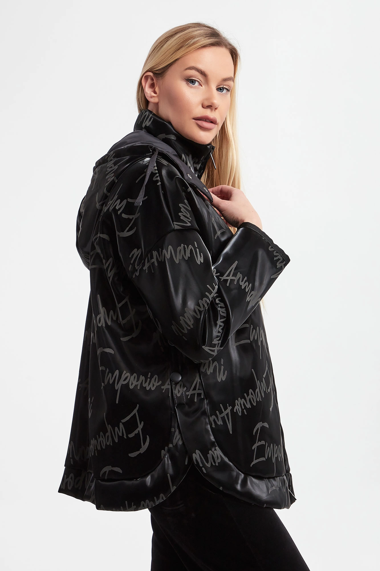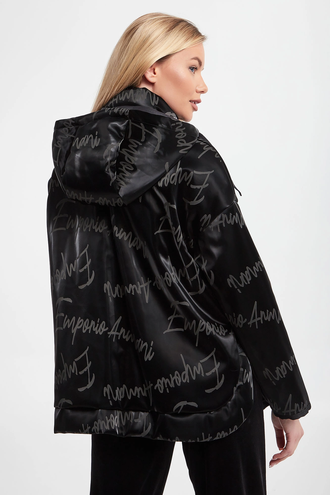 Kurtka winylowa marki Emporio Armani w czarnym kolorze. Na całości powtarzalne logo w szarym kolorze. Obniżona linia ramion. Dekolt wykończony stójką oraz kapturem odpinanym za pomocą zamka. Na froncie dwie kieszenie. Boki kurtki zapinane na napy. Fason typu relaxed.