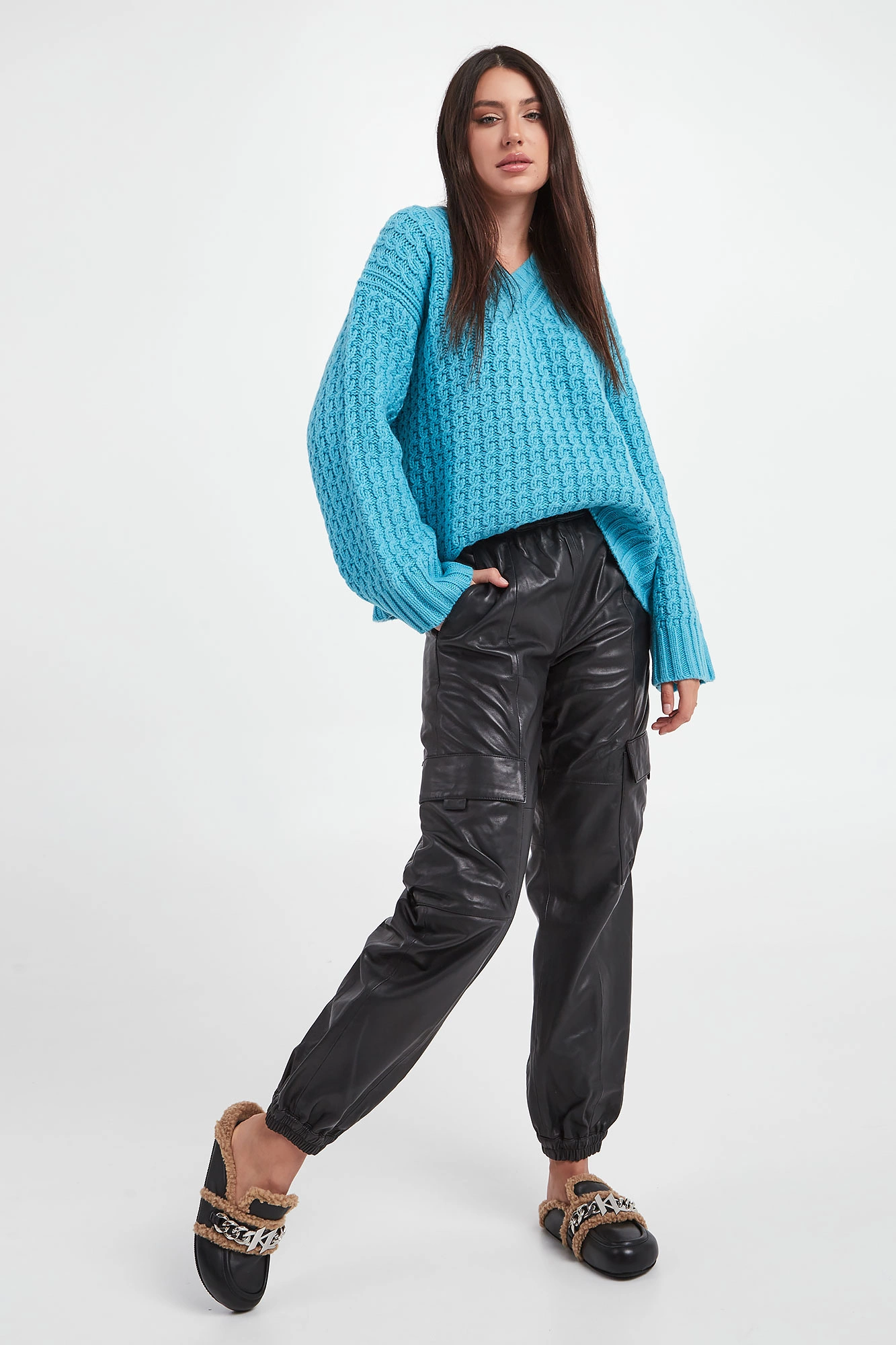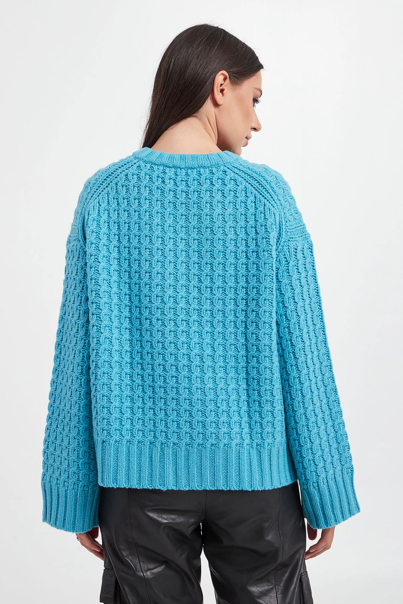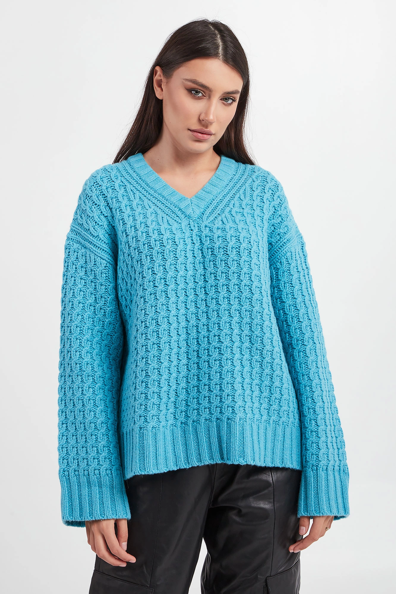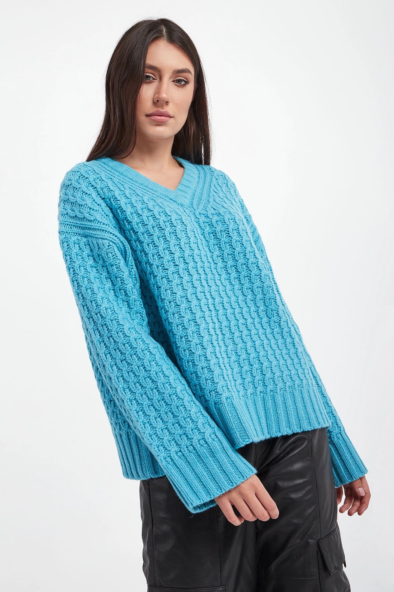 Wełniany sweter marki Samsøe Samsøe w błękitnym kolorze. Na całości warkoczowy splot. Obniżona linia ramion. Dekolt v-neck, rękawy i dół wykończone ściągaczem prążkowanym. Fason typu oversize. Niezwykle ciepły i przyjemny w dotyku. Wykonany z lekko elastycznej, certyfikowanej wełny.
