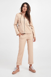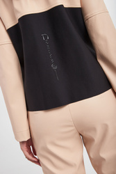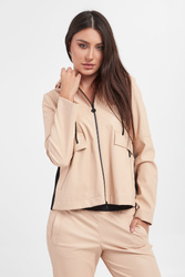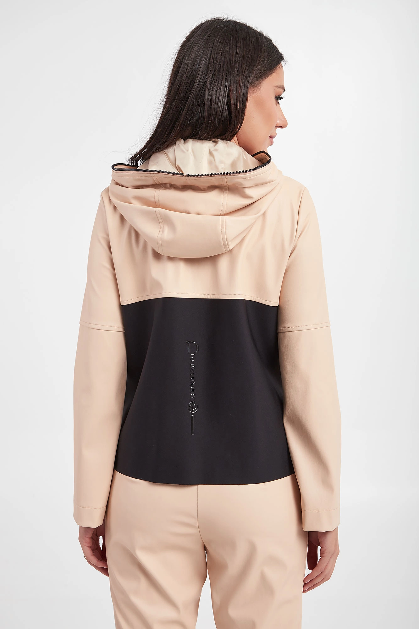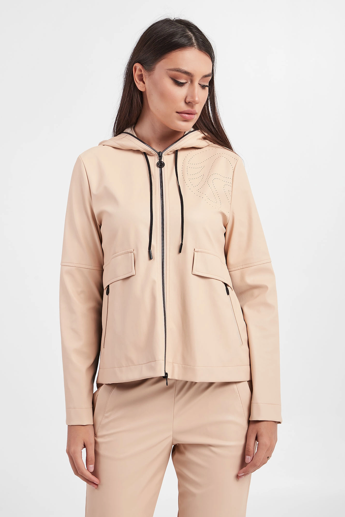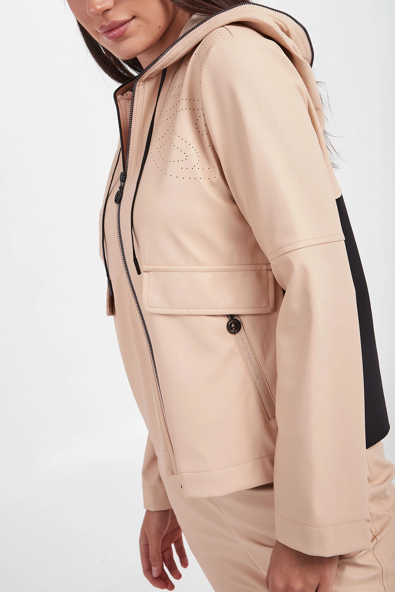 Kurtka z kapturem marki Sportalm w kolorze beżowym. Wykonana ze skóry ekologicznej. Z tyłu wstawka czarnego, gładkiego, elastycznego materiału. Zapinana za pomocą dwustronnego zamka z sygnowaną zawieszką. Po bokach dwie boczne, zamykane kieszenie oraz patki. Przy ramieniu dziurkowanie. Kaptur regulowany za pomocą czarnych troczków. Fason regular.