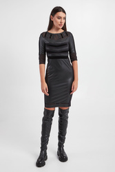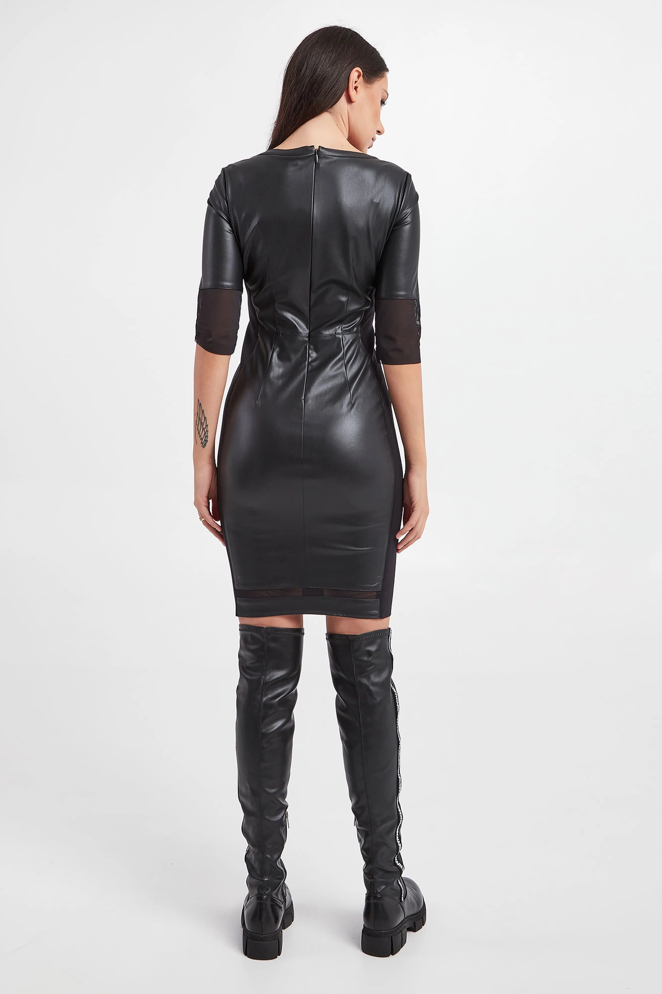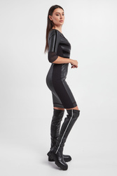 Sukienka marki Sportalm w czarnym kolorze. Wykonana ze skóry ekologicznej. Na froncie, przy rękawach i u dołu wstawki siatki. Krótkie rękawy z zamszowymi lampasami. Po bokach wstawki elastycznego materiału. Zapinana za pomocą tylnego zamka. Fason typu slim, długość mini.