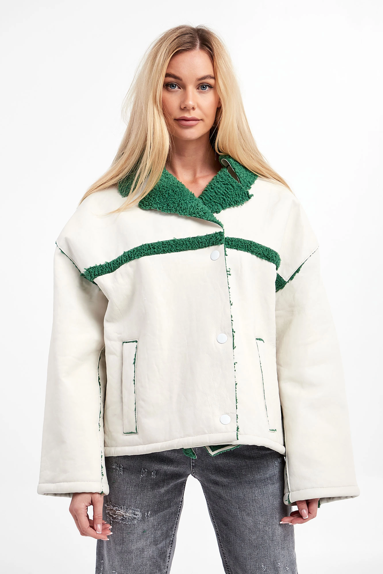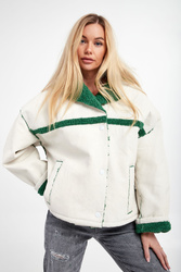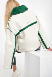 Kożuch marki Ice Play w kolorze ecru. Ozdobiony wstawkami zielonego miśka. Zapinany za pomocą sygnowanych nap. Dwie boczne, wpuszczane kieszenie. Kołnierz z klapami. Z tyłu szary nadruk z logo. Fason typu oversize. Ciepły i stylowy.