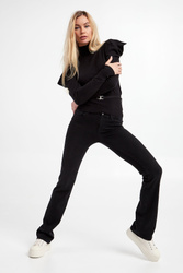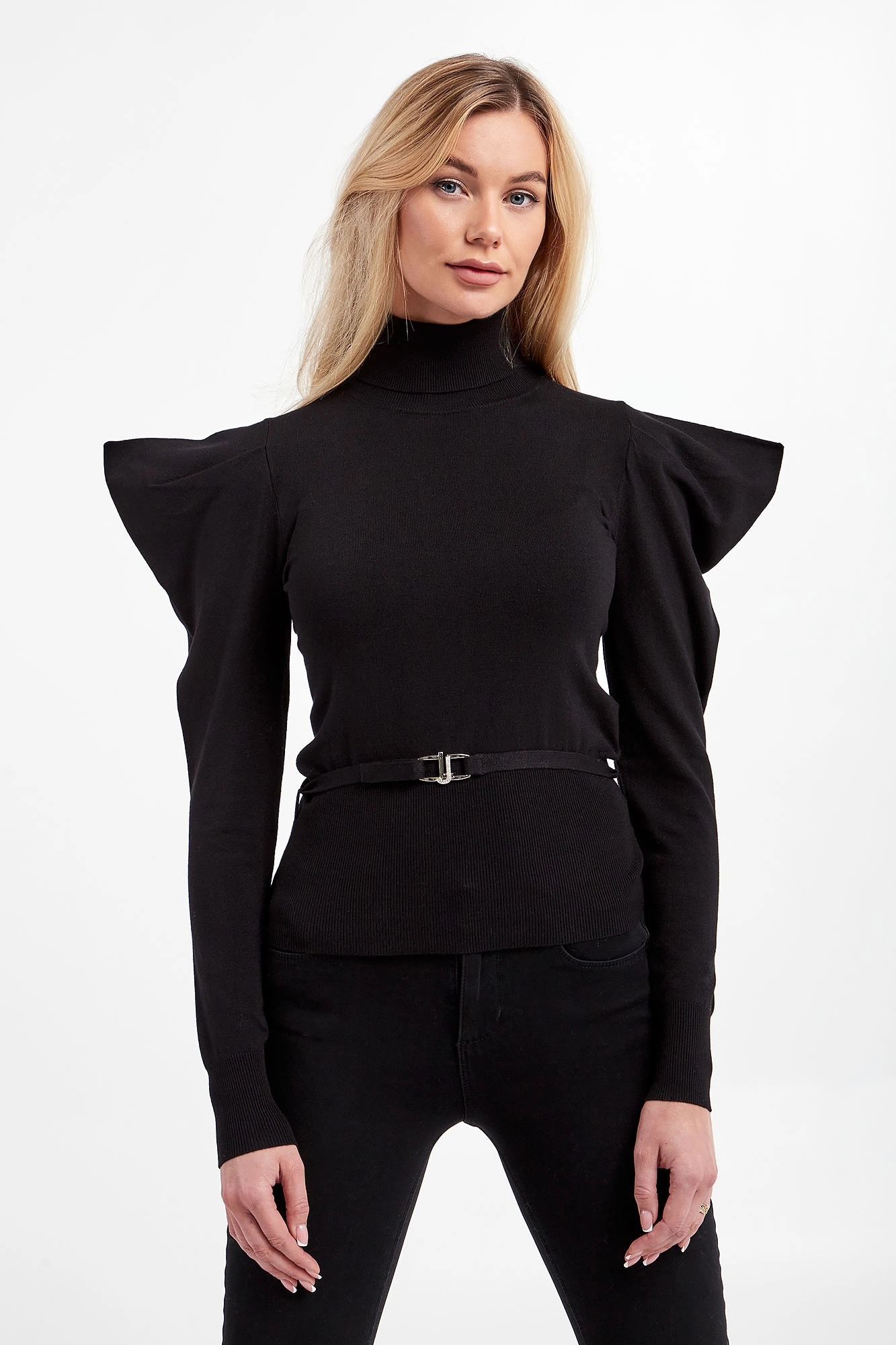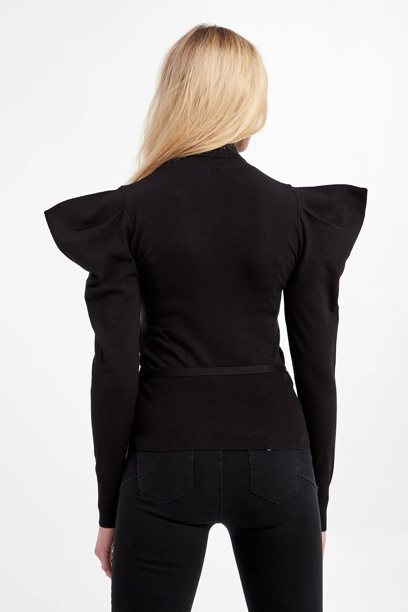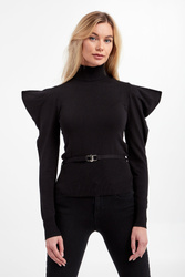 Golf marki Liu Jo w czarnym kolorze. Przy rękawach ozdobne bufki. W talii pasek zapinany na napy ze złotą klamrą ozdobioną kryształkami. Golf, długie rękawy i dół zakończone prążkowanymi ściągaczami. Fason typu slim. Wykonany z elastycznej, wiskozowej tkaniny.