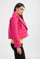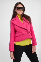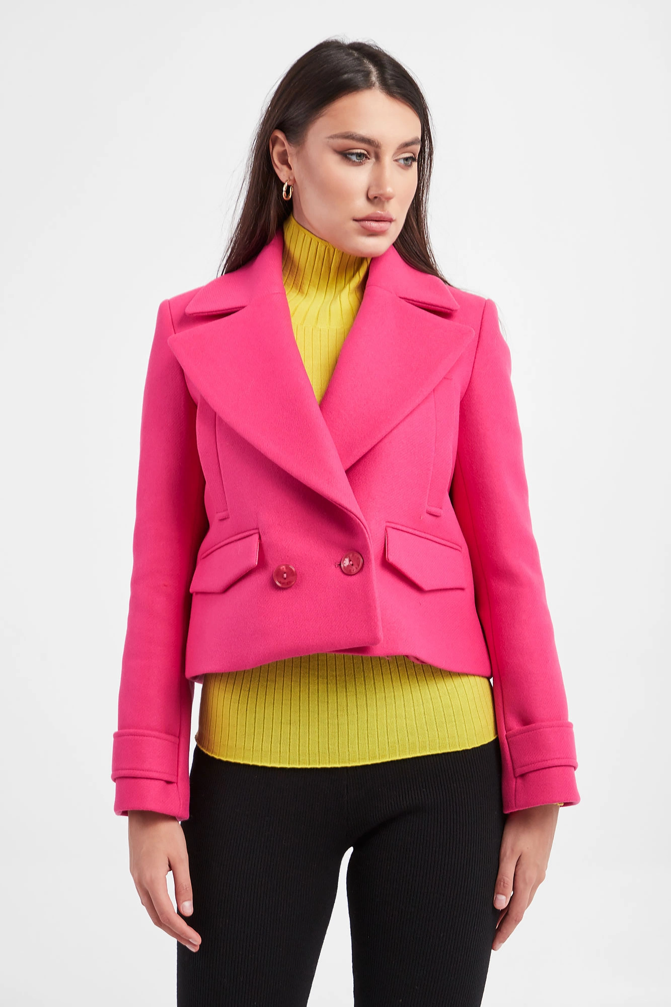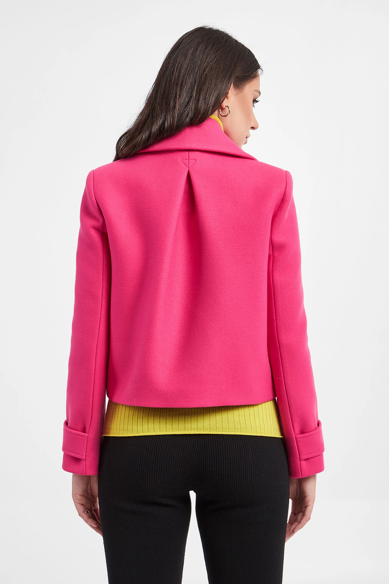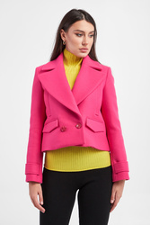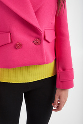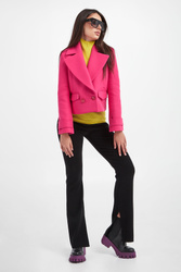 Wełniany płaszcz marki Patrizia Pepe w różowym kolorze. Dekolt wykończony klasyczna klapą. Model z czterema kieszeniami, z czego dwie zapinane na napy, dwie kolejne z patkami. Nieco krótszy fason typu relaxed. Zapinany za pomocą dwurzędowych, sygnowanych guzików. Długie rękawy wykończone ozdobnymi paskami.