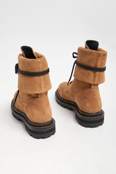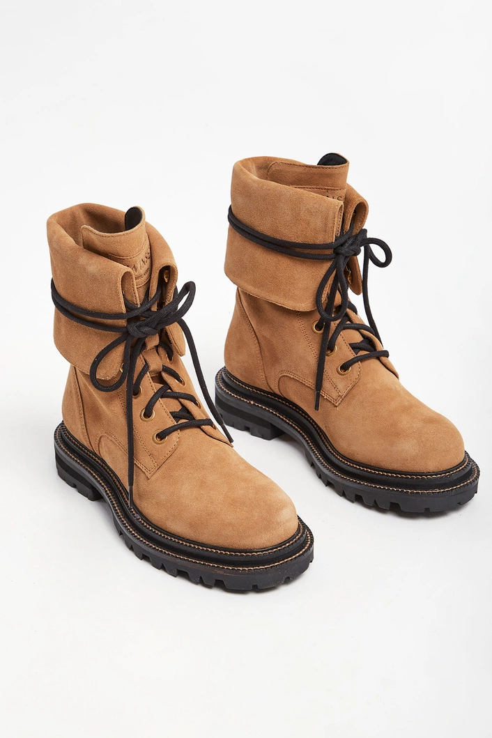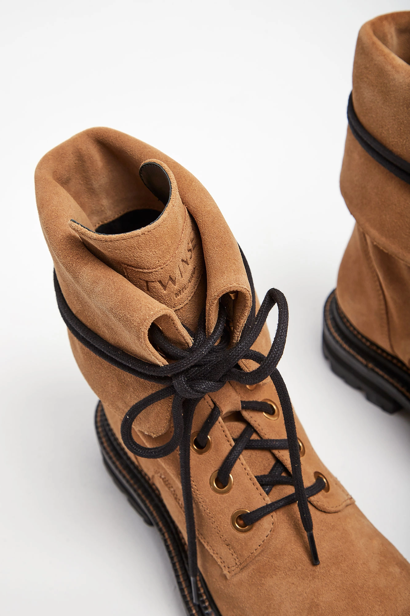 Trapery skórzane marki Twinset w bezowym kolorze. Wykonane z naturalnej skóry zamszowej. Wyższa cholewka z możliwością wywinięcia. Wiązane za pomocą sznurówek w czarnym kolorze. Na języku naszywka z tłoczona nazwą marki. Podeszwa wykończona ozdobnym, beżowym przeszyciem. Wyściółka sygnowana, w czarnym kolorze.