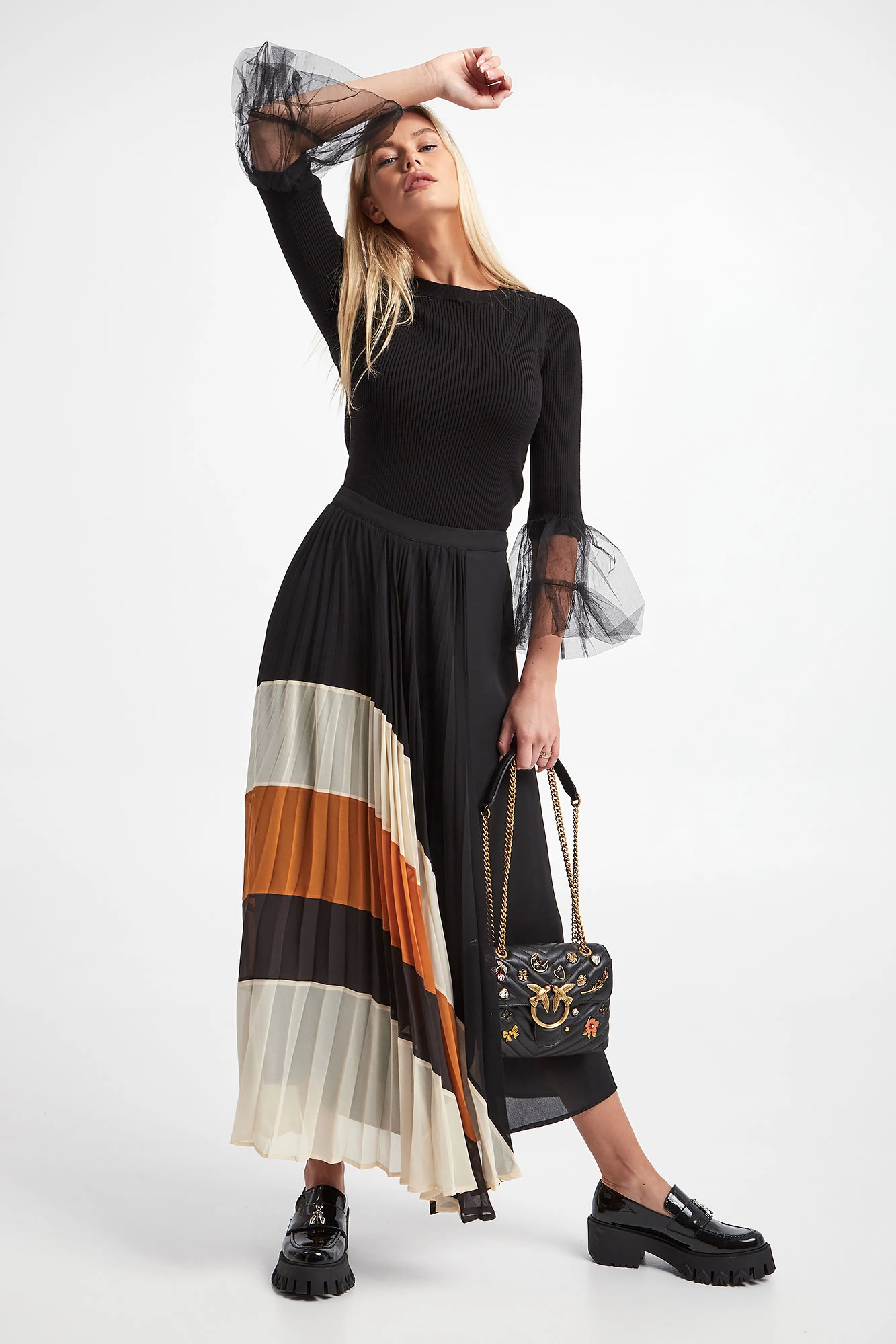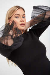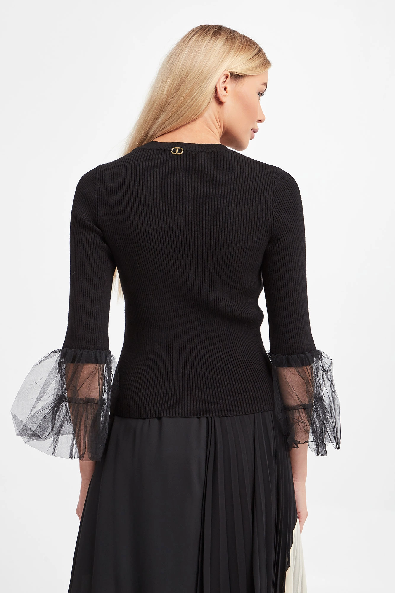 Sweter marki Twinset w czarnym kolorze. Na całości prążki. Dekolt typu o-neck zakończony prążkowanym ściągaczem. Rękawy zakończone tiulowymi wstawkami. Z tyłu, na linii karku złota, metalowa zawieszka w kształcie logo. Fason typu slim. Wykonany z elastycznej, wiskozowej tkaniny.