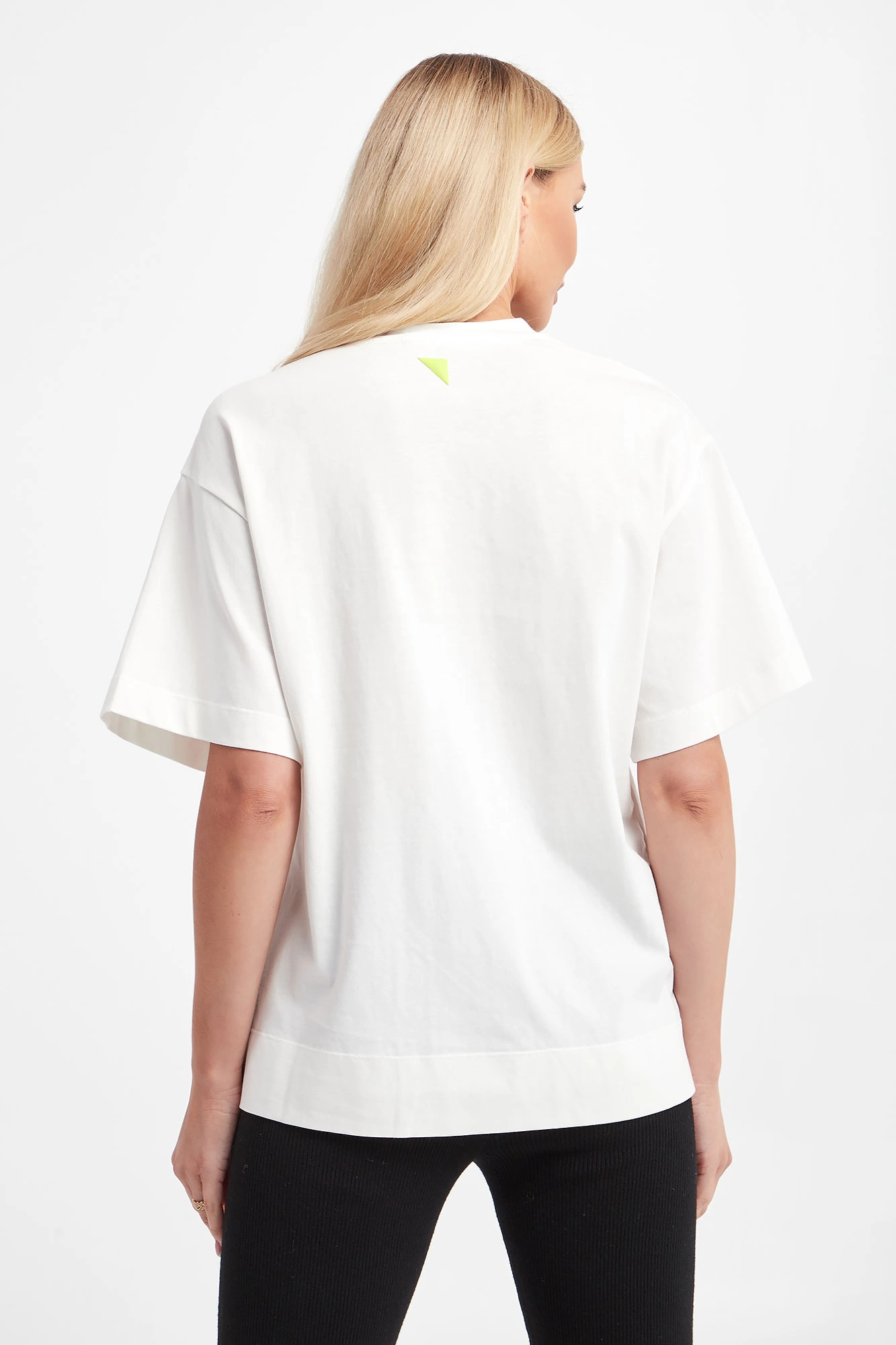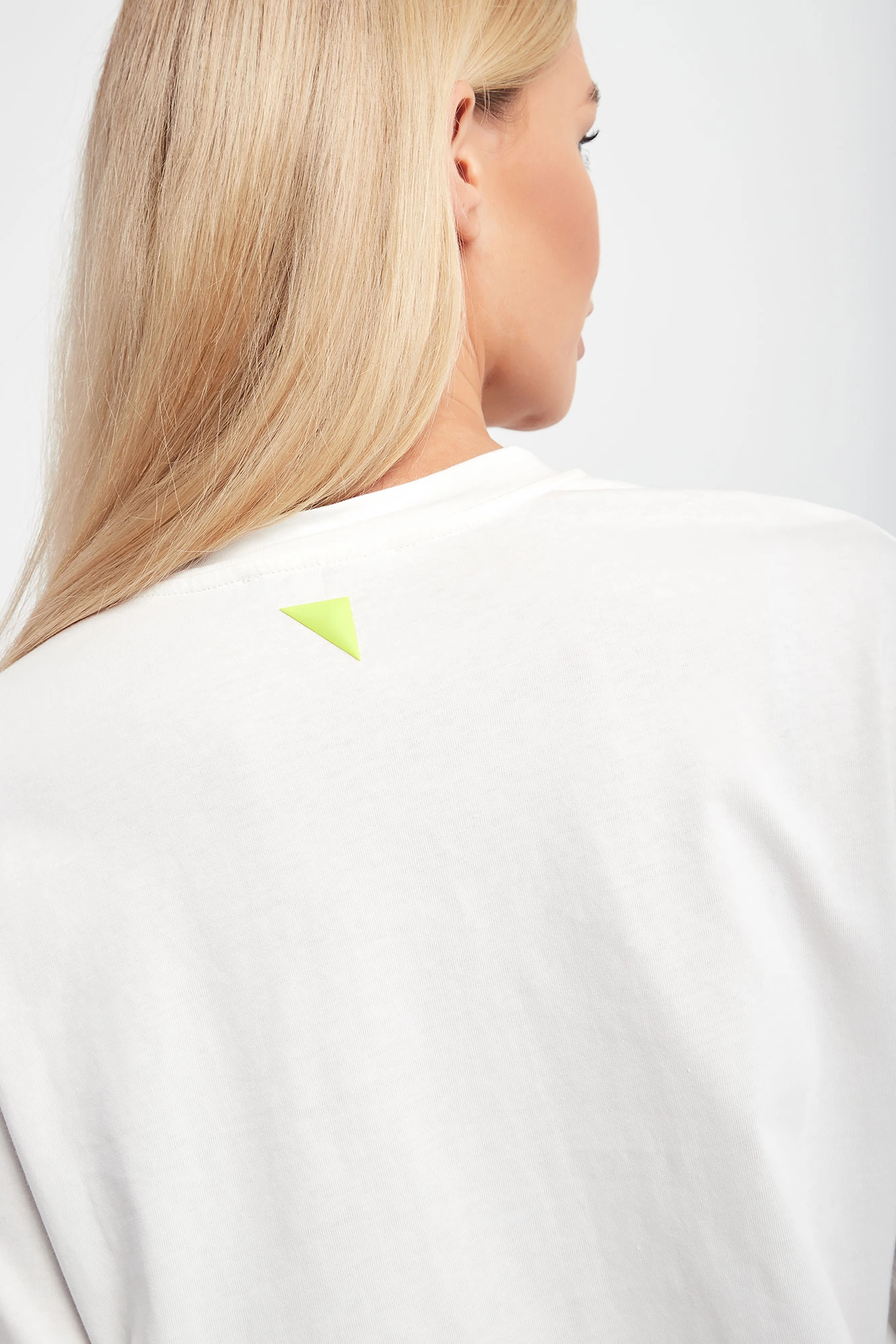 T-shirt marki Twinset Actitude w białym kolorze. Na froncie wielokolorowy nadruk z czarnym logo. Dekolt typu o-neck zakończony ściągaczem. Krótkie rękawy i dół wykończone lamówką. Nad nadrukiem przeszycie. Obniżona linia ramion. Po bokach rozcięcia. Fason typu relaxed. Wykonany z czystej bawełny.
