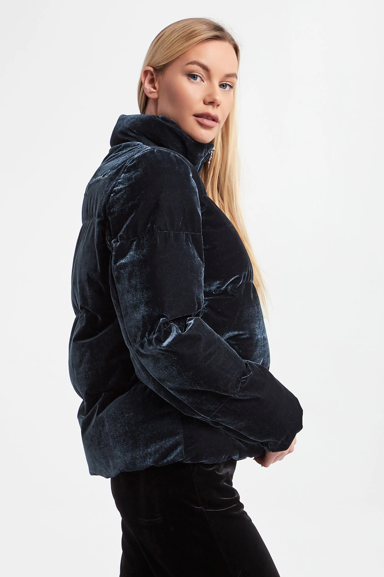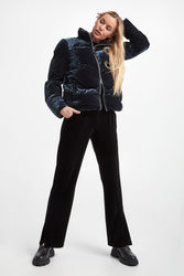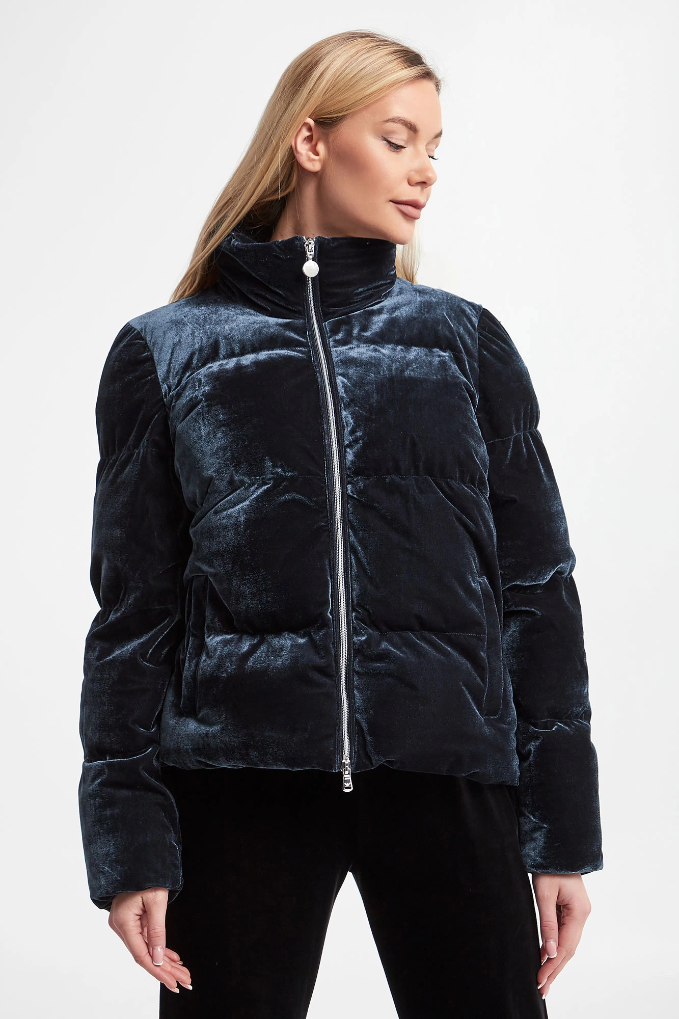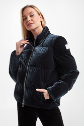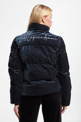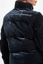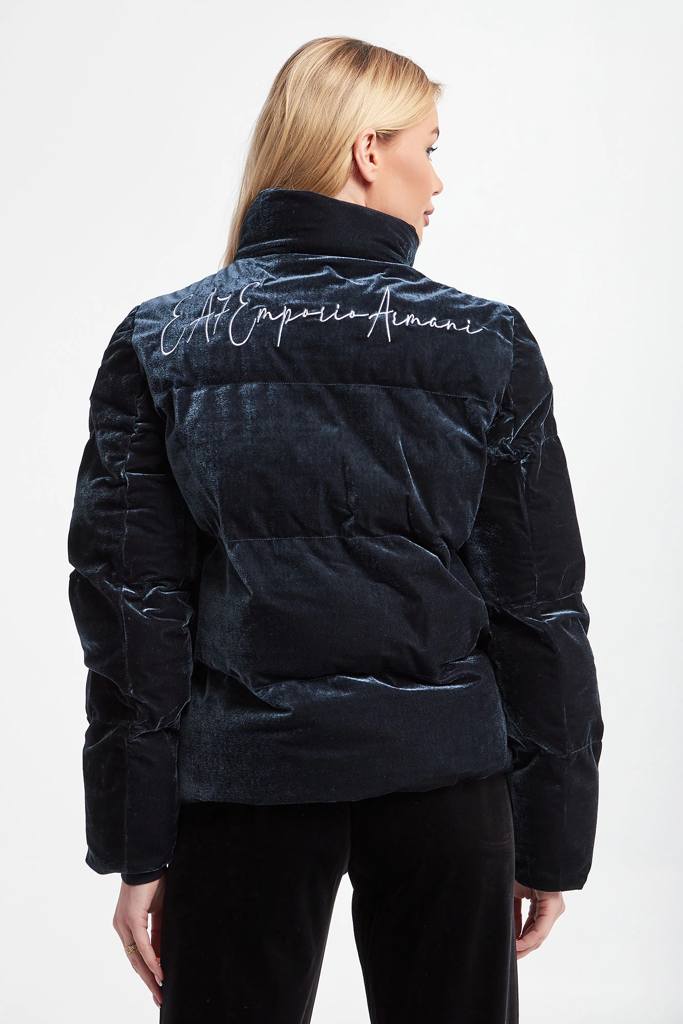 Kurtka welurowa marki EA7 Emporio Armani w granatowym kolorze. Pikowana. Dekolt wykończony stójką. Na plecach wyszyta nazwa marki w kontrastowym kolorze. Na lewym ramieniu naszywka z logo marki. Syntetyczne wypełnienie.