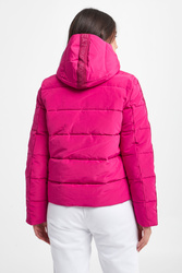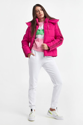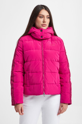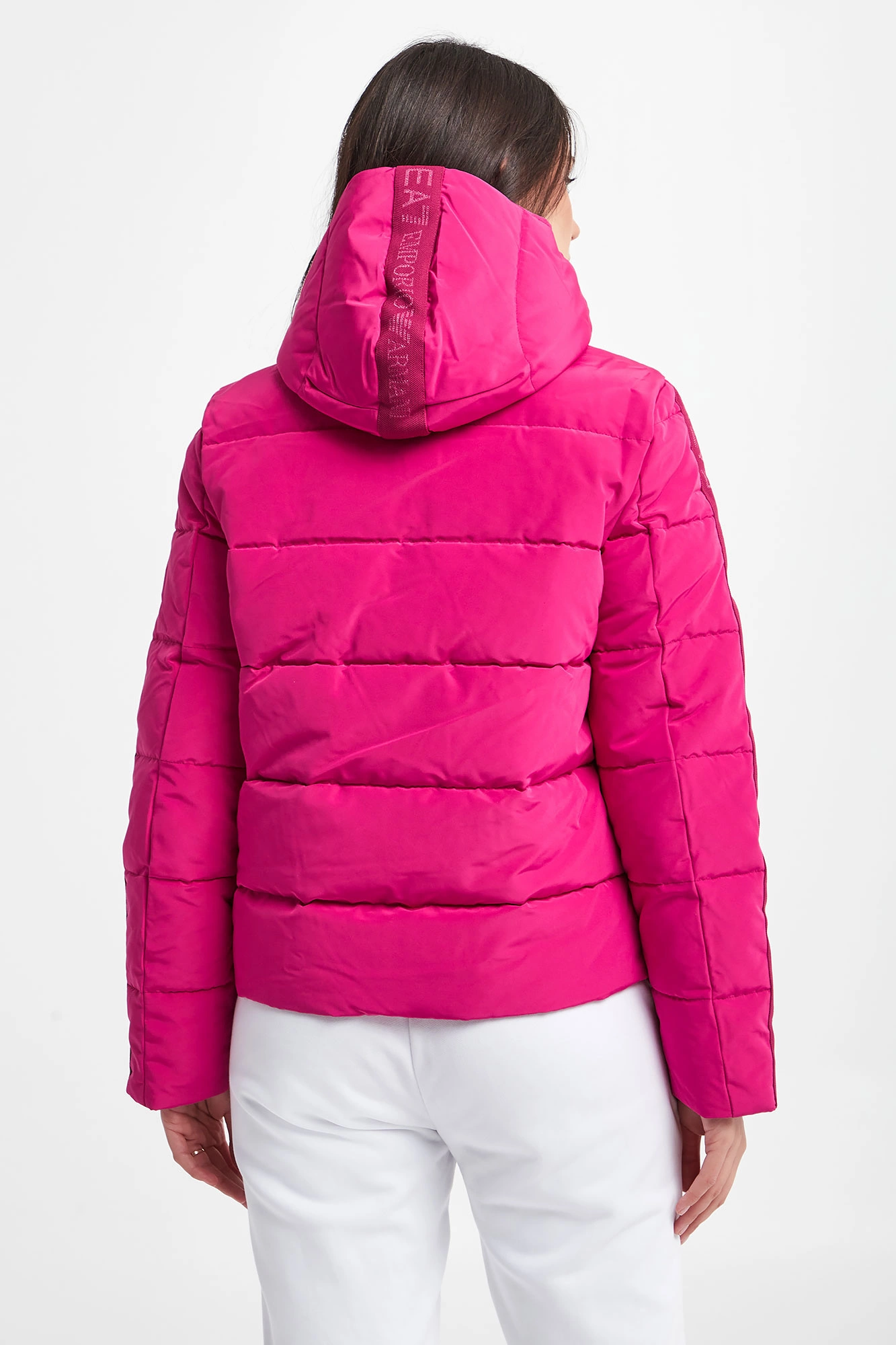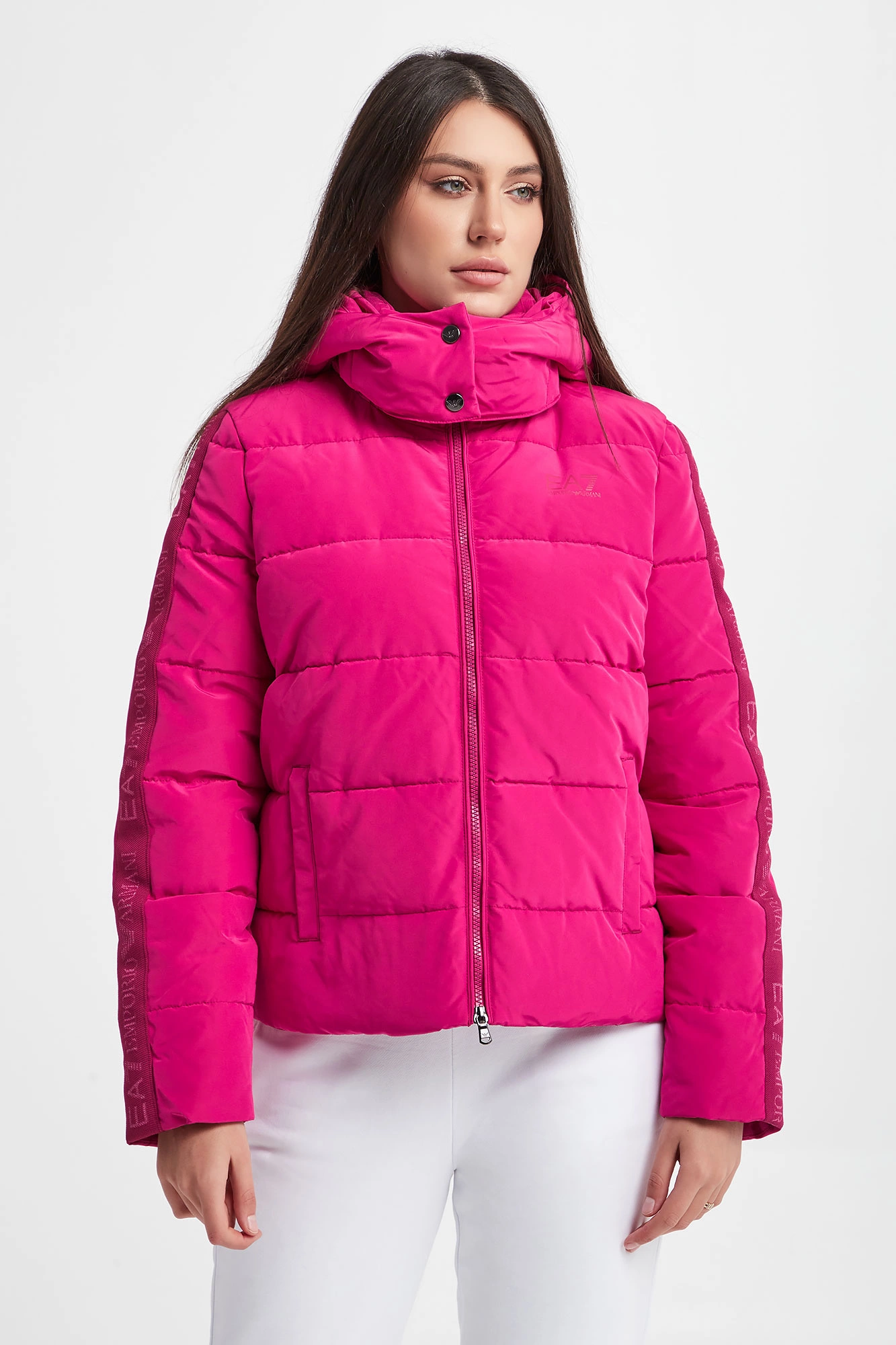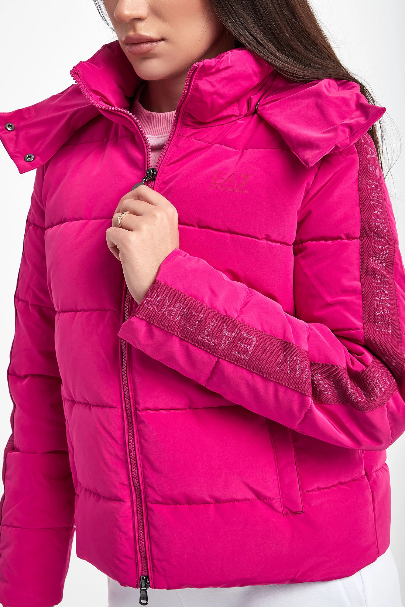 Pikowana kurtka marki EA7 Emporio Armani w różowym kolorze. Odpinany kaptur. Na przodzie mały różowy nadruk z logo marki. Całość zapinana za pomocą dwukierunkowego zamka. Materiałowe logowane pasy wzdłuż rękawów. Wewnątrz wywietrzniki. Fason regular.