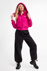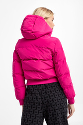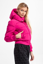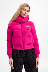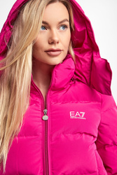 Pikowana, krótka kurtka marki EA7 Emporio Armani w różowym kolorze. Z odpinanym kapturem za pomocą zamka. Rękawy zakończone elastycznym ściągaczem. Zapinana za pomocą dwukierunkowego zamka. Dół zakończony szerokim ściągaczem. Model z dwoma kieszeniami, ocieplonymi sztucznym futerkiem. Fason typu regular. Syntetyczne wypełnienie.