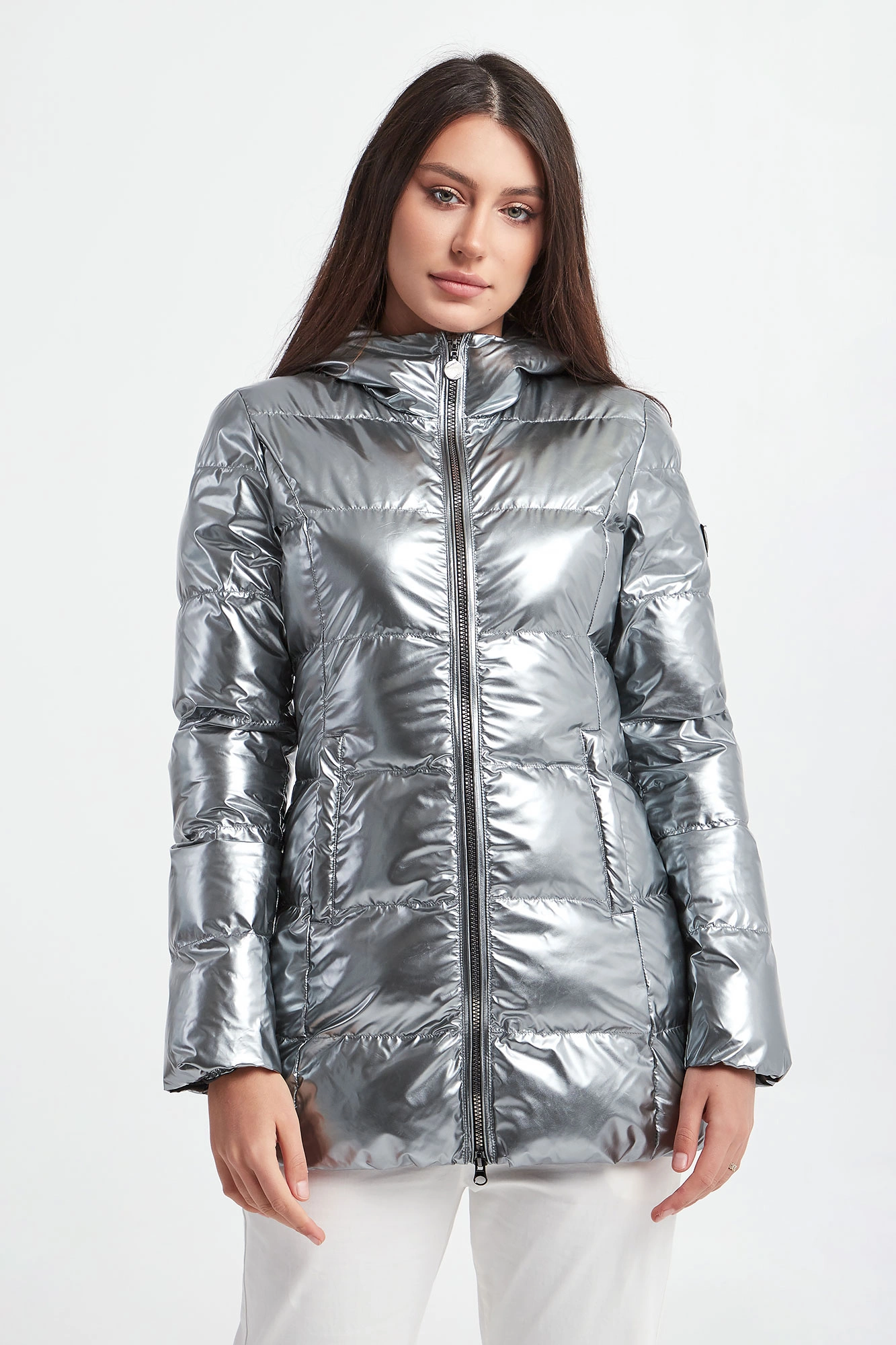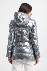 Kurtka z kapturem marki EA7 Emporio Armani w srebrnym kolorze. Całość pikowana z matowym połyskiem. Na ramieniu aplikacja z logo marki. Wewnątrz czarne wypełnienie i wywietrzniki. Zapinana na zamek. Fason typu regular.