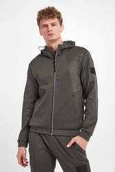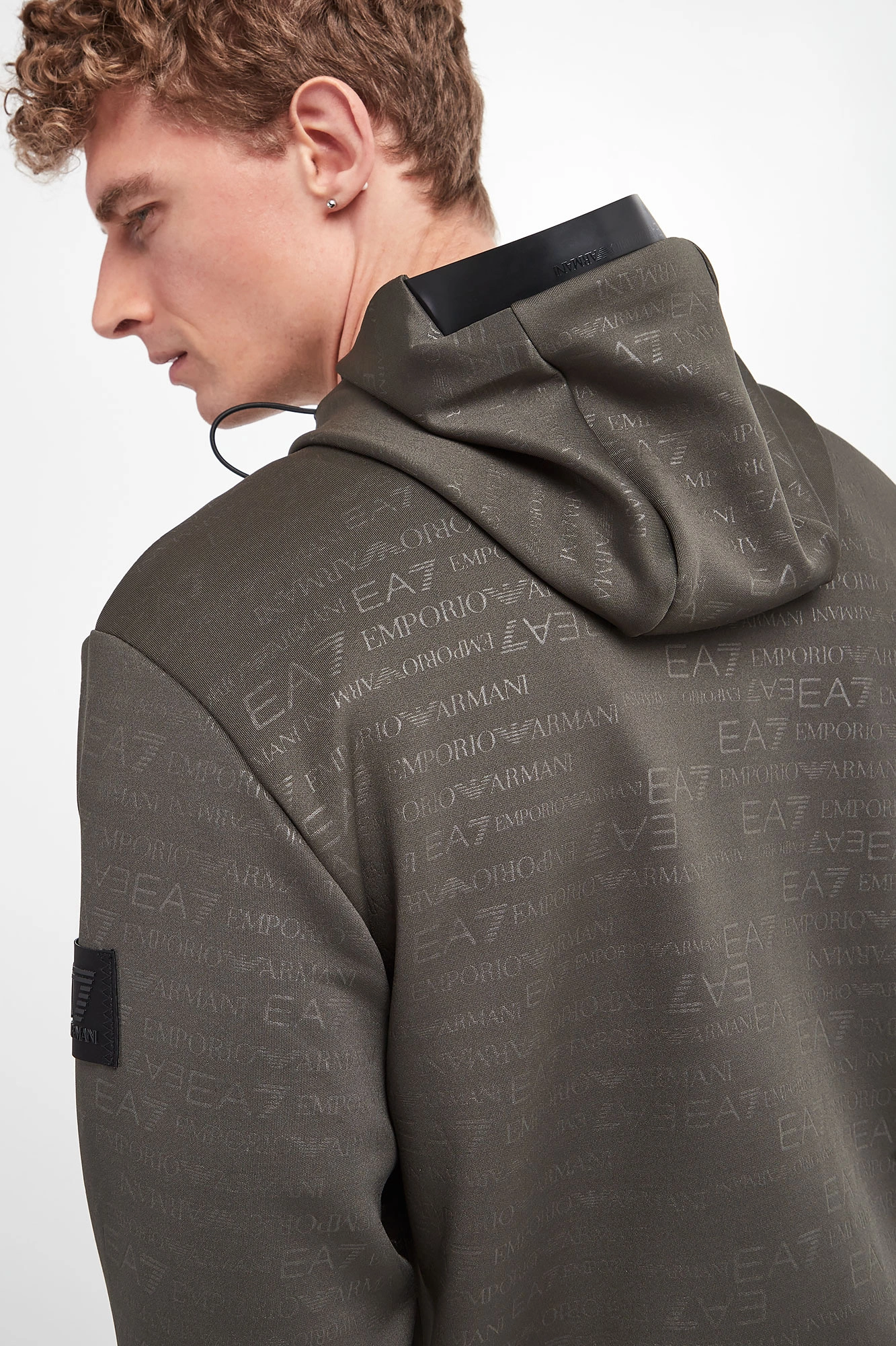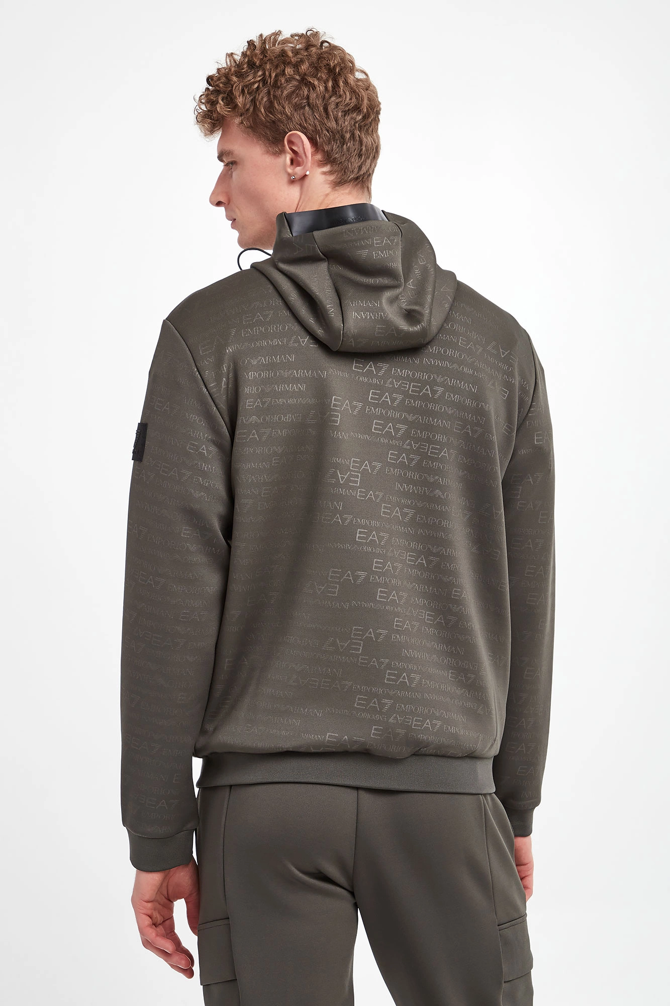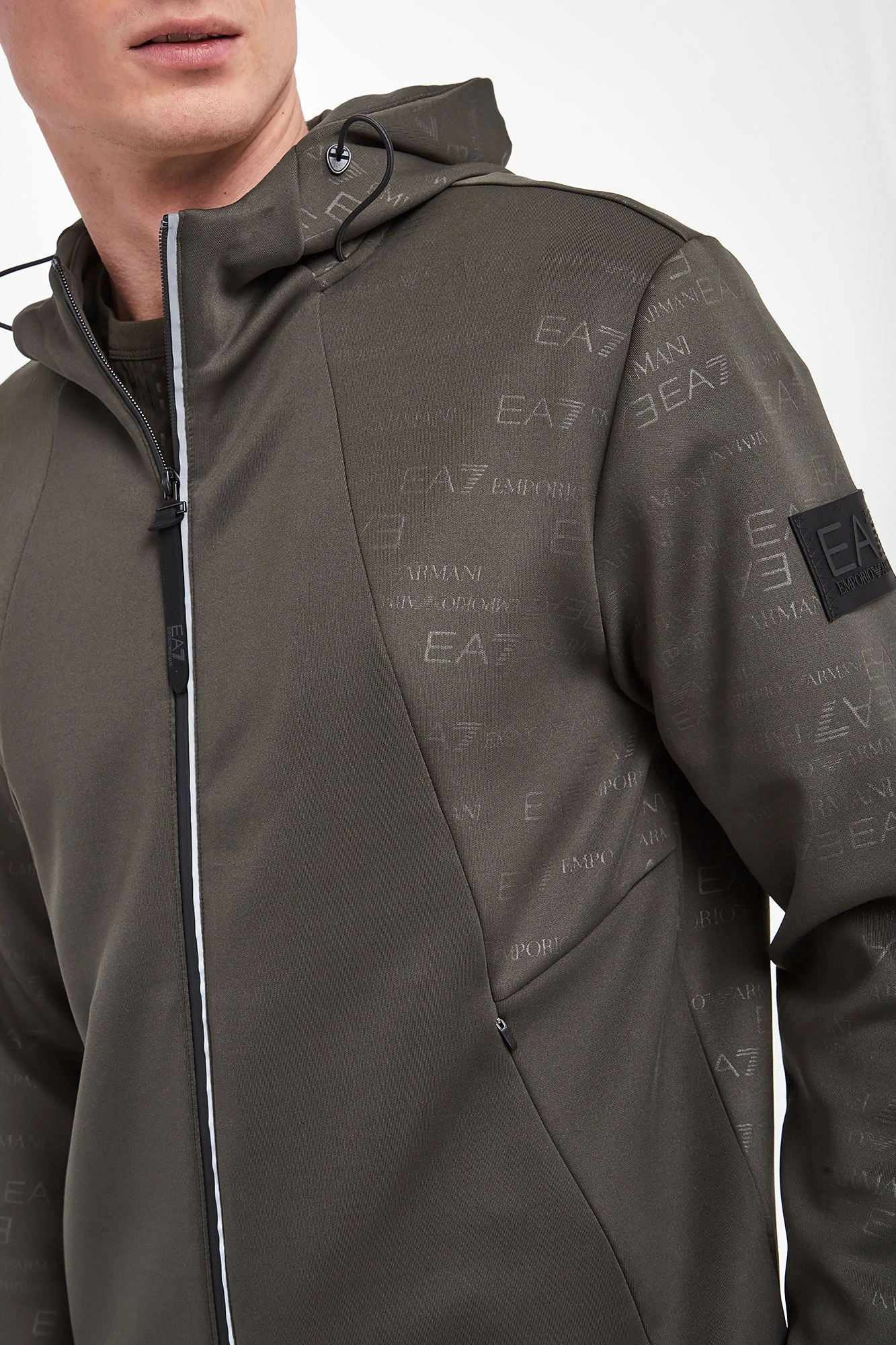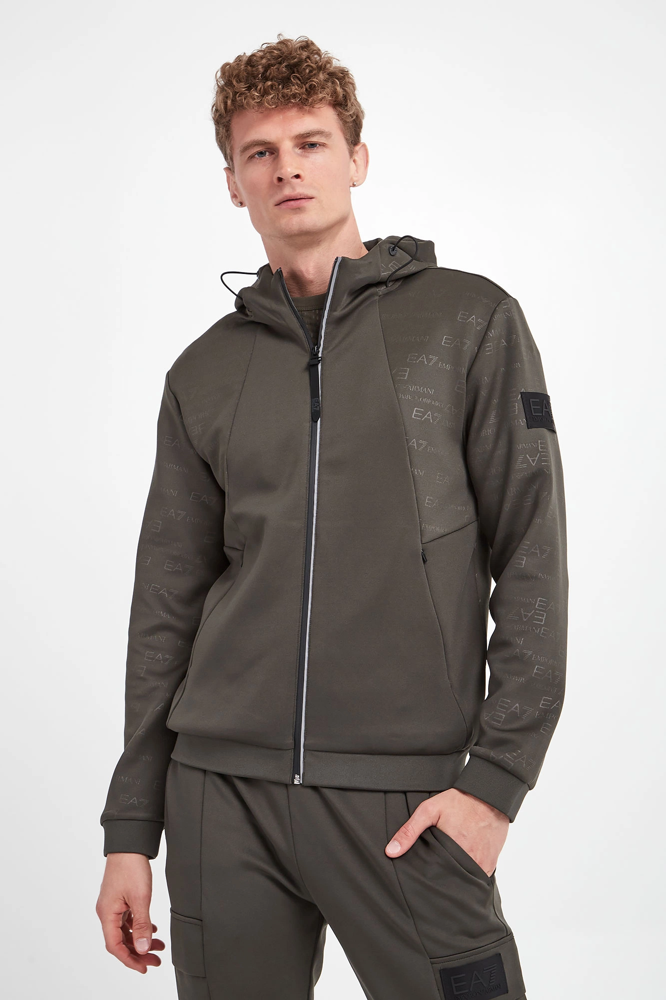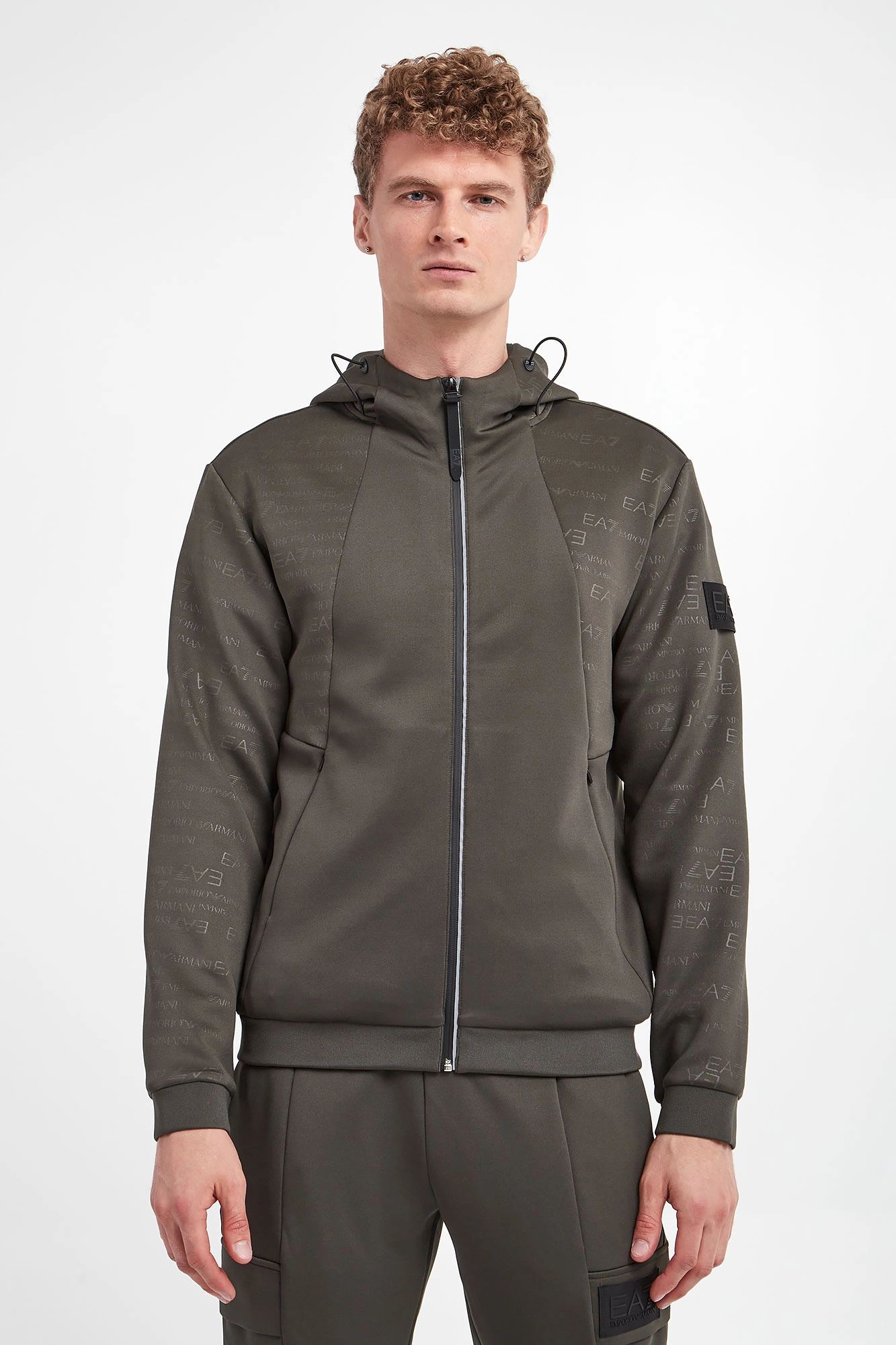 Bluza z kapturem marki EA7 Emporio Armani w kolorze khaki. Na całości nadruk nazwy marki. Kaptur regulowany za pomocą elastycznych troczków ze stoperem. Zapinana za pomocą zamka w srebrnym kolorze. Model z dwoma zapinanymi kieszeniami. Długie rękawy i dół zakończone elastycznym ściągaczem. Na lewym rękawie gumowana naszywka z tłoczoną nazwą marki w czarnym kolorze. Fason typu regular.