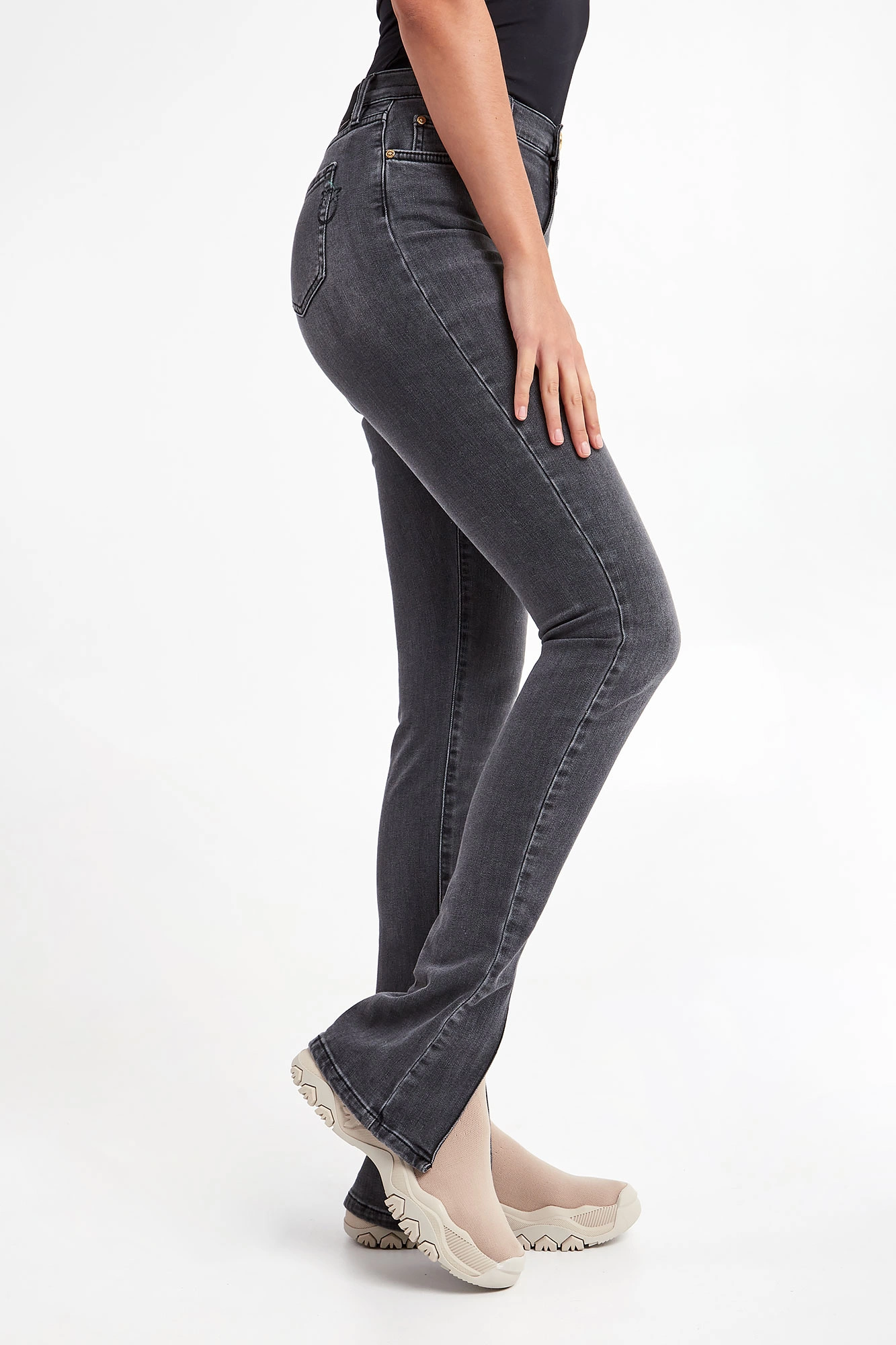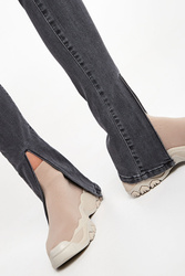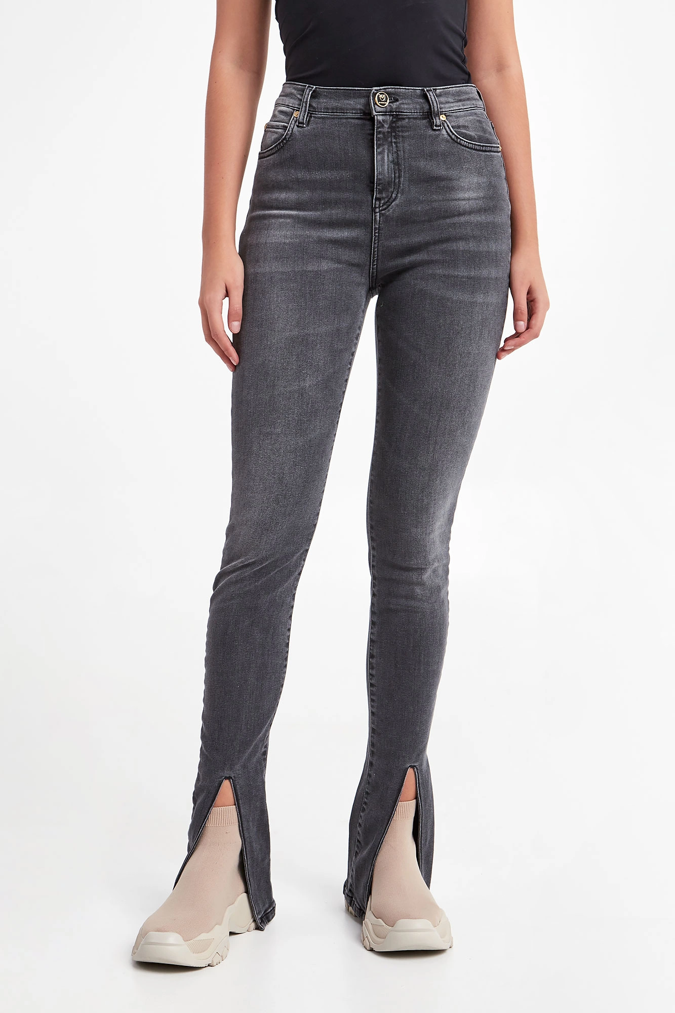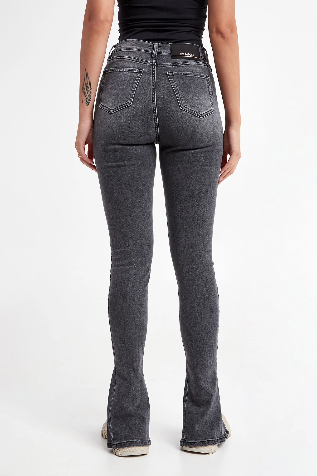 Jeansy marki Pinko w szarym kolorze. W talii szlufki. Zapinane za pomocą zamka i dużego, sygnowanego guzika. Model z pięcioma kieszeniami. Na całości ozdobne przetarcia. Fason typu slim. Nogawki zakończone ozdobnymi rozcięciami. Z tyłu haft logo i naszywka z tłoczoną nazwą marki. Wykonane z elastycznej mieszanki bawełny i lyocellu.