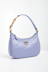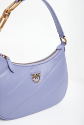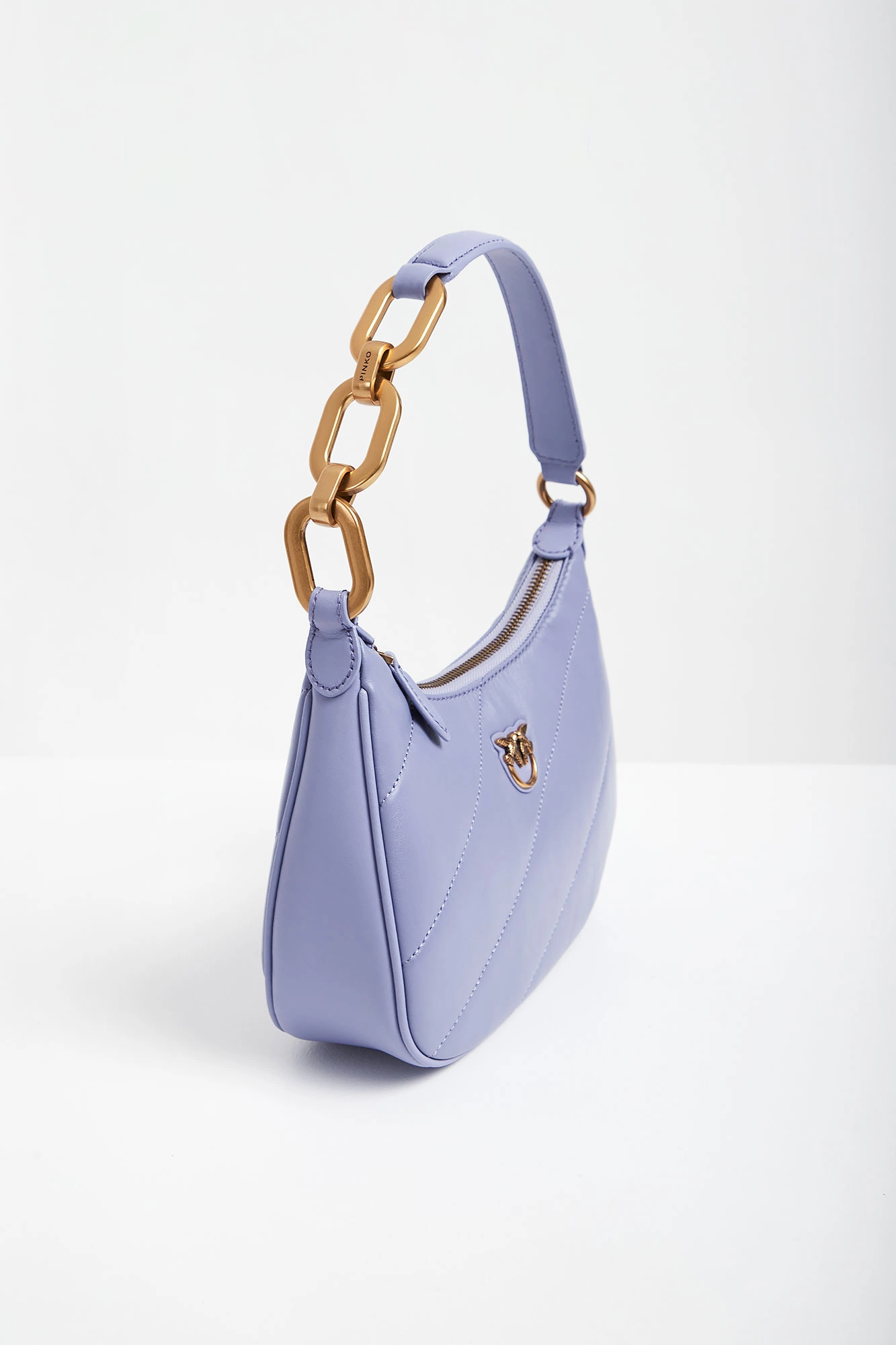 Skórzana torebka marki Pinko w kolorze pastelowej lilii. Baguette bag. Pikowana. Na froncie charakterystyczne, złote logo " Love Birds". Zapinana za pomocą zamka. Do noszenia na pasku ze wstawką grubego łańcucha.