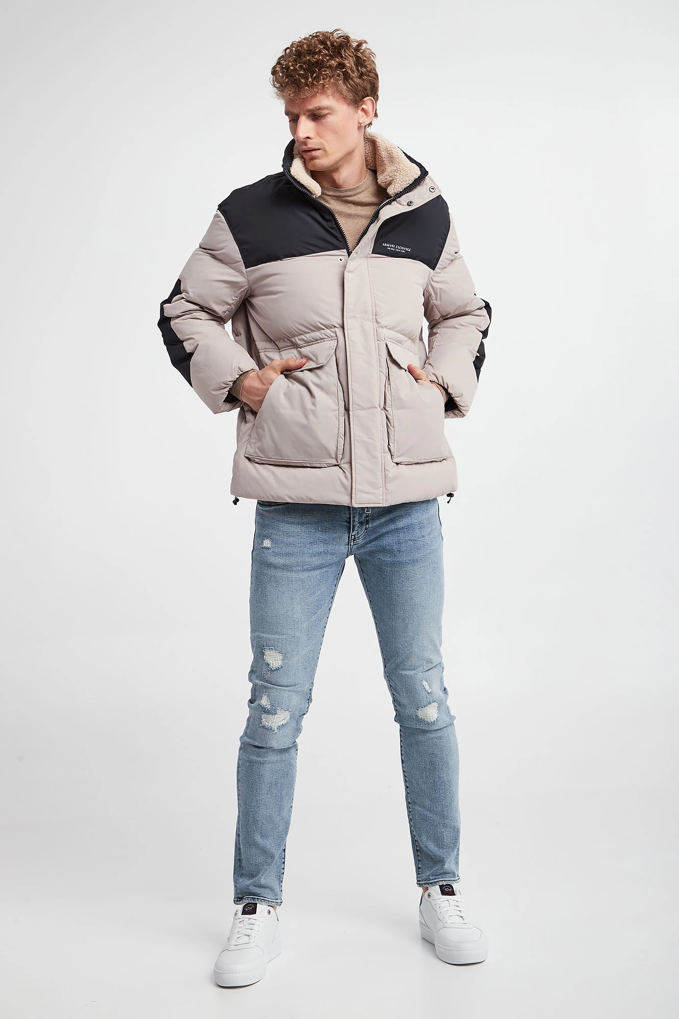Pikowana kurtka puchowa marki Armani Exchange w beżowo-czarnym kolorze. Ze stójką regulowanym za pomocą troczków ze stoperem. Model z dużymi, podwójnymi kieszeniami z patką, zapinanymi za pomocą nap. Długie rękawy zakończone ściągaczem regulowanym za pomocą paska z rzepem. Zapinana za pomocą dwukierunkowego zamka pokrytego tasiemką zapinaną za pomocą nap. Dół regulowany za pomocą troczków ze stoperem. Naturalne wypełnienie. Fason typu relaxed.