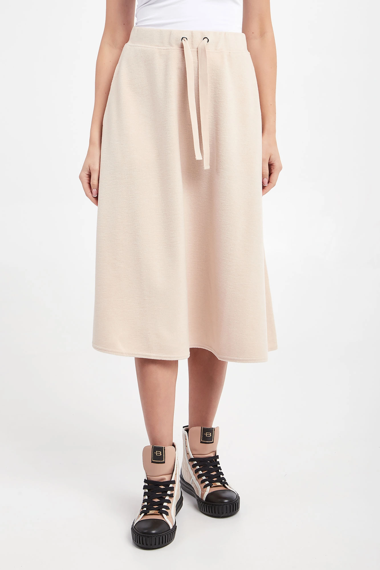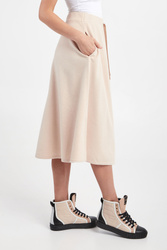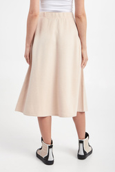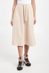 Dzianinowa sukienka marki Weekend Max Mara w beżowym kolorze. Model z dwoma kieszeniami. Fason w kształcie litery A, o długości midi. W talii elastyczny ściągacz regulowany za pomocą troczków. Z przodu gumowana aplikacja z tłoczona nazwą marki. Wykonane z elastycznej mieszanki wełny, wiskozy i bawełny.