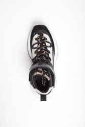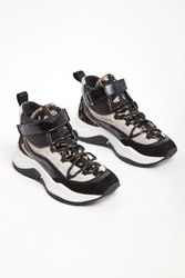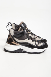 Sneakersy skórzane marki Baldinini w czarno-beżowym kolorze. Wyższa cholewka. Na części wstawka połyskującej skóry, zwierzęcy print w o futerkowym wykończeniu i zamszowa, szara skóra. Wiązane za pomocą czarno-białych sznurówek. U góry pasek zapinany za pomocą rzepy. Z tyłu pętelka ułatwiająca zakładanie. Nieco wyższa, sygnowana podeszwa w biało-czarnym kolorze.