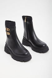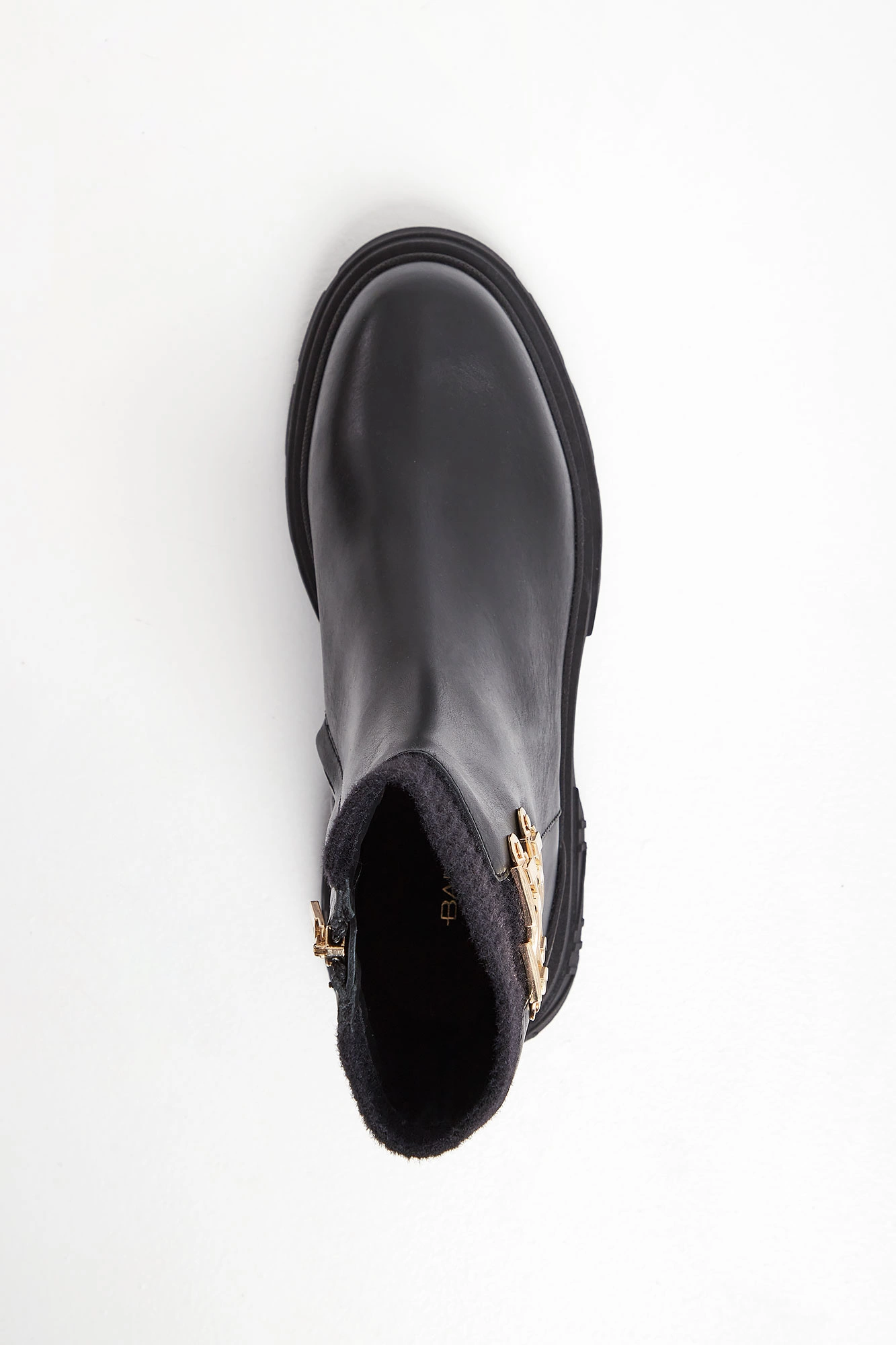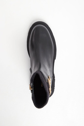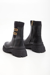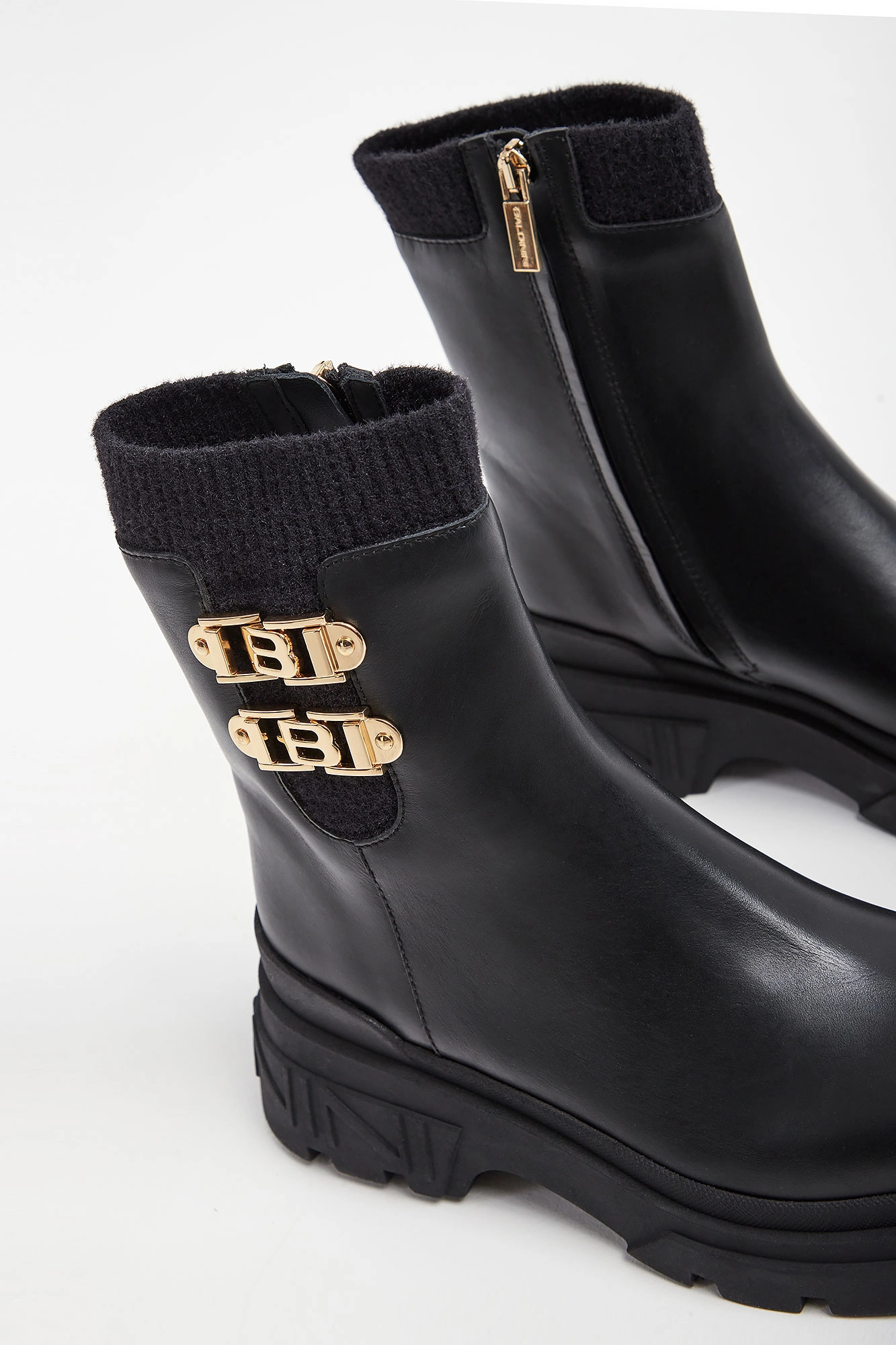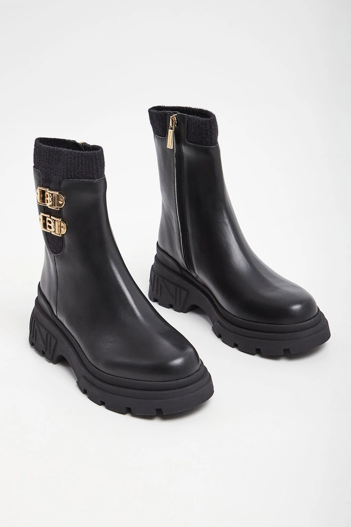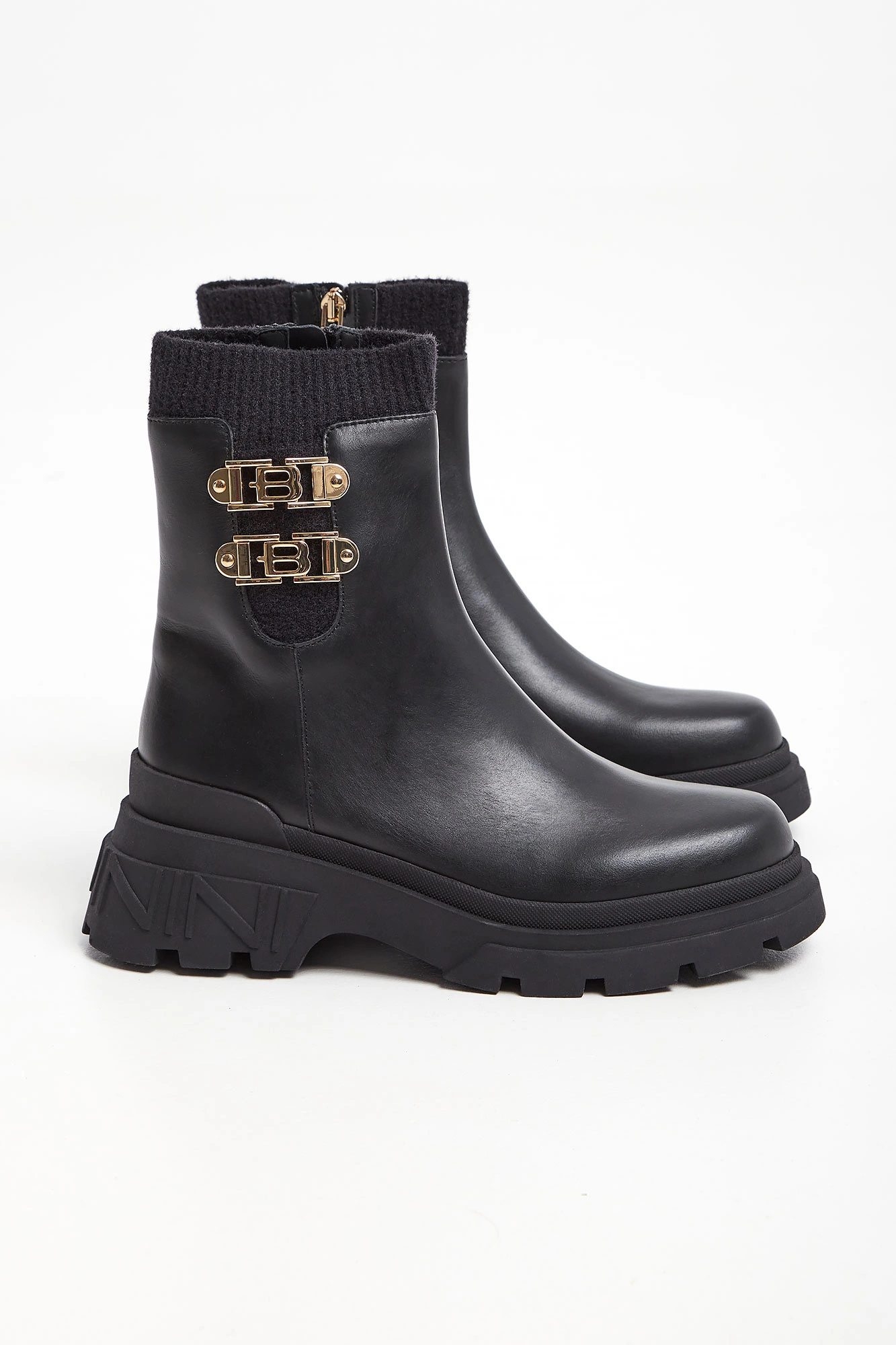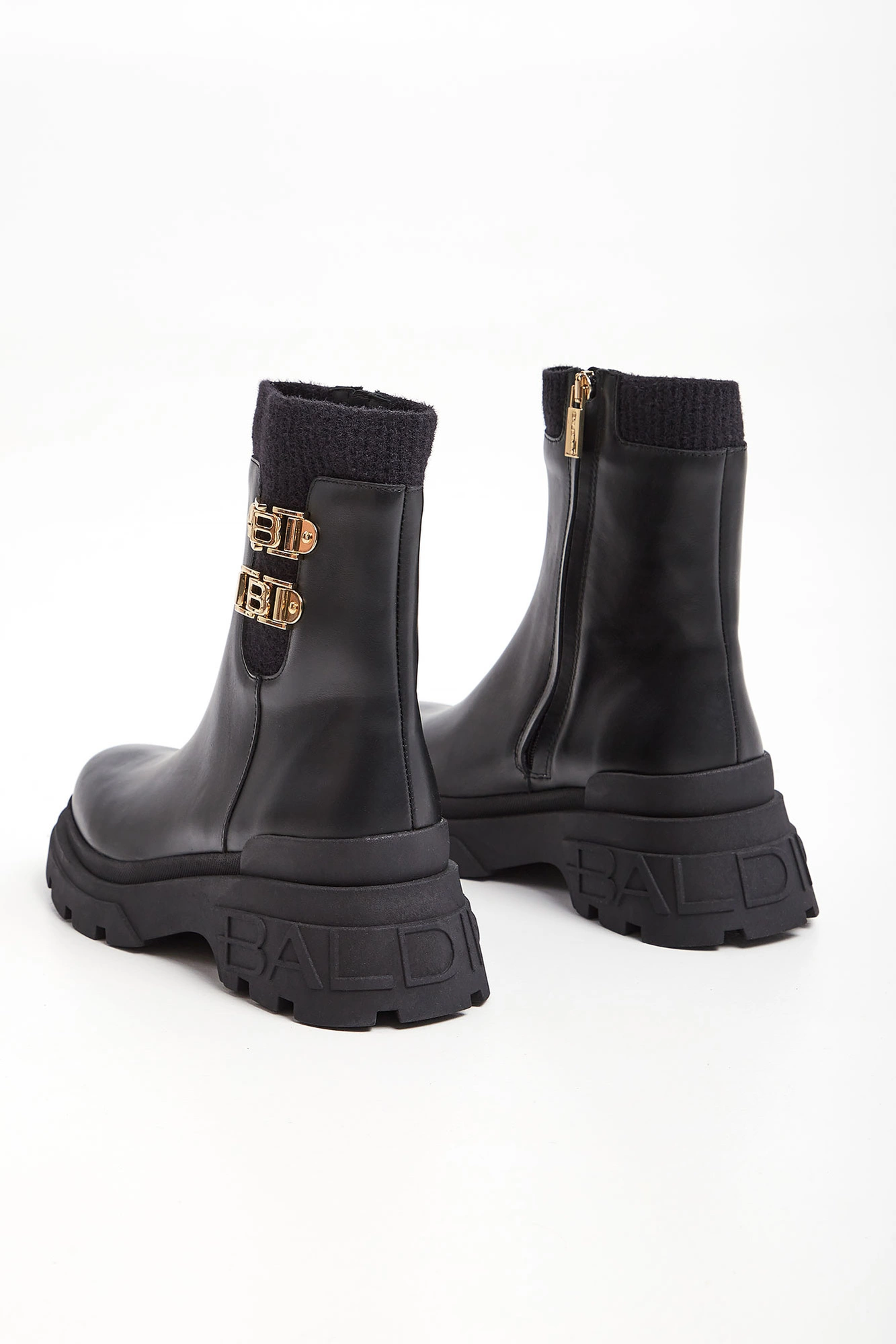 Skórzane botki marki Baldinini w czarnym kolorze. Wykonane z gładkiej, naturalnej skóry. Cholewka wykończona materiałowym ściągaczem. Po boku metalowe ozdobne aplikacja z monogramem marki w złotym kolorze. Zapinane po boku za pomocą zamka. Sygnowana podeszwa.