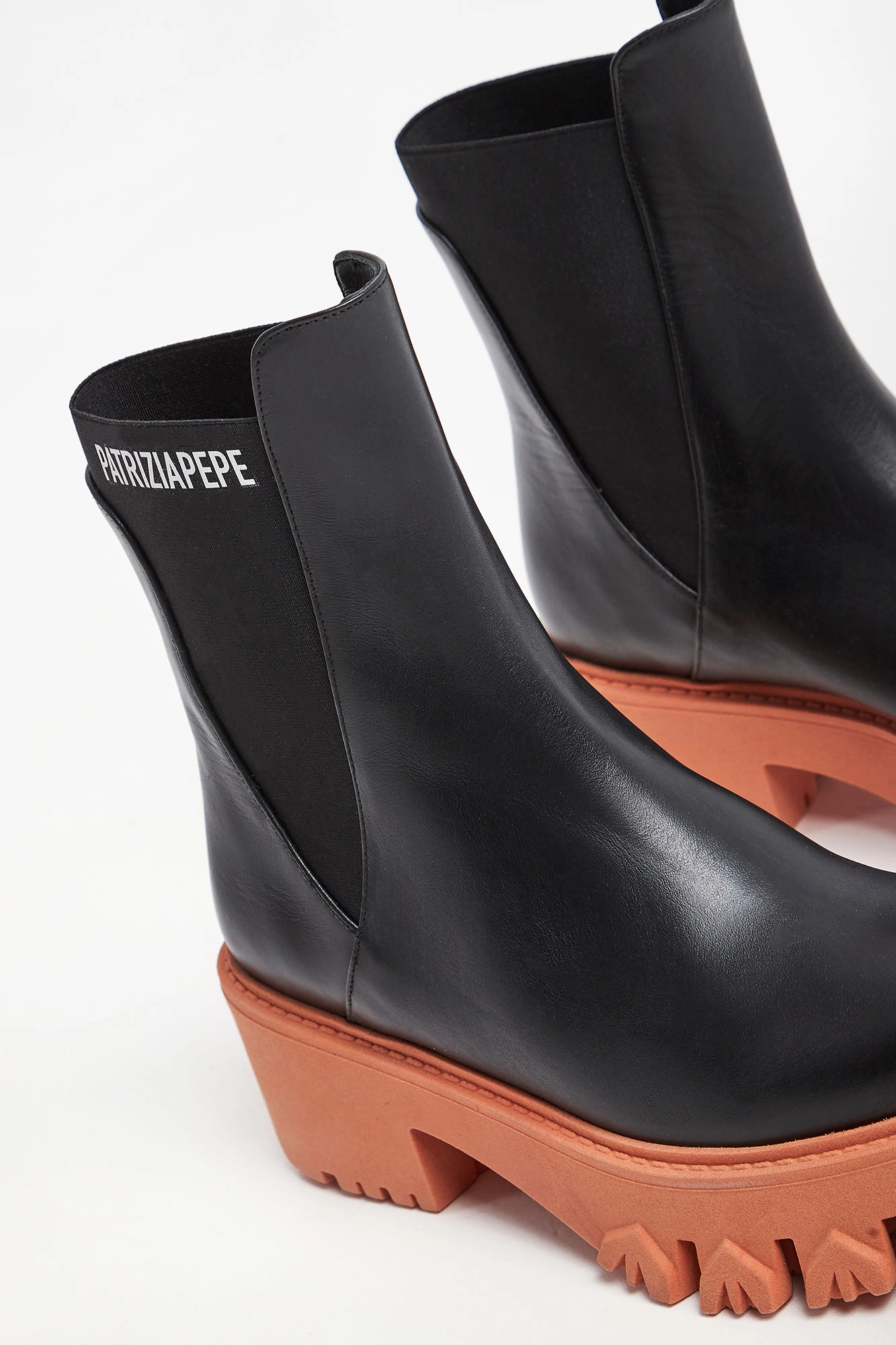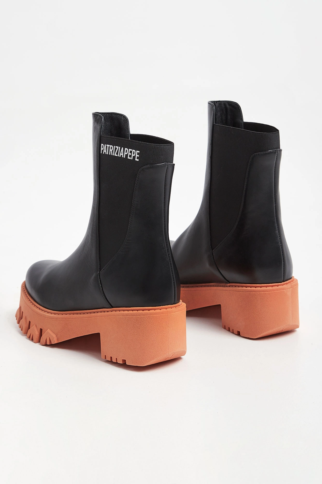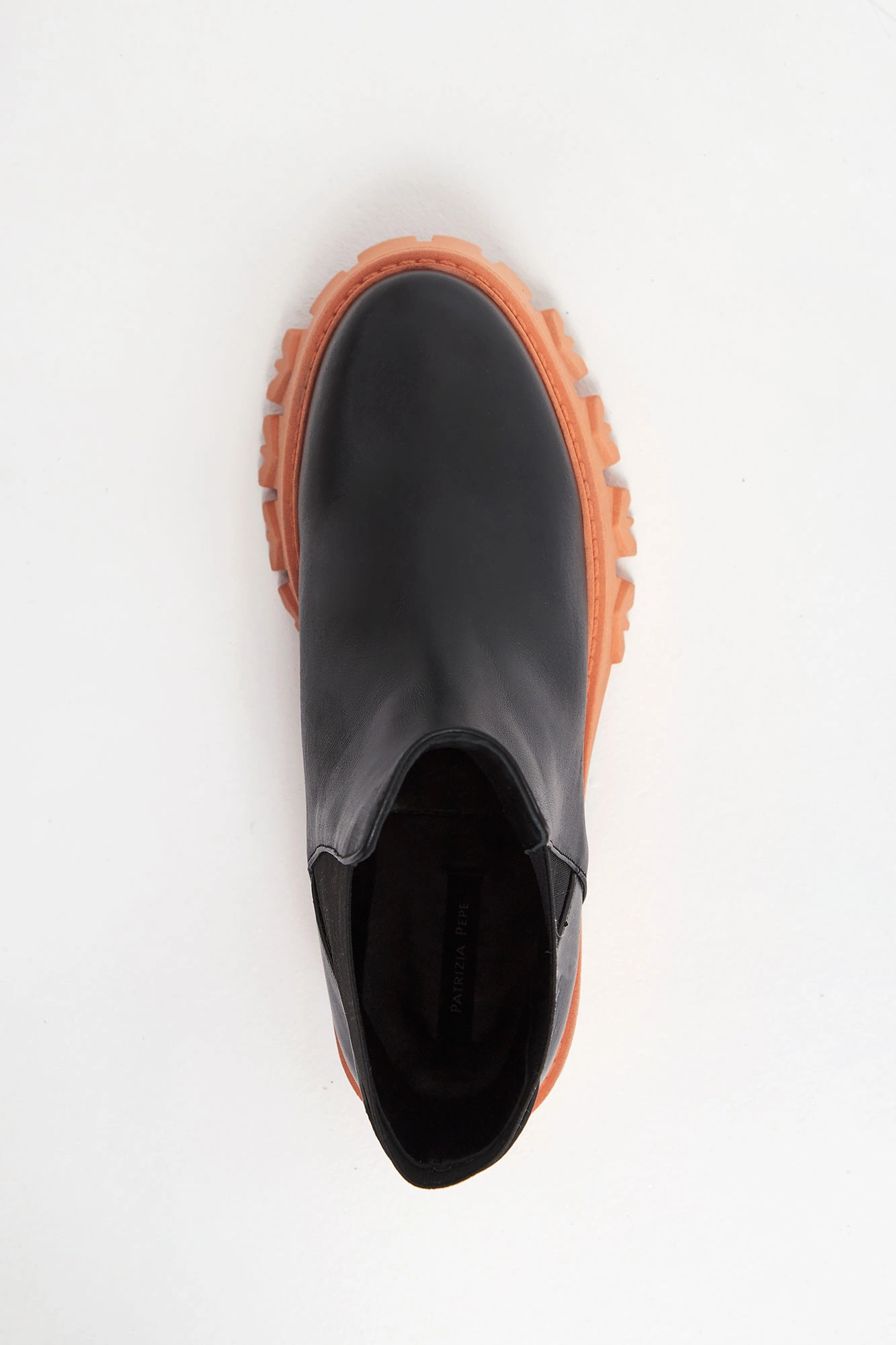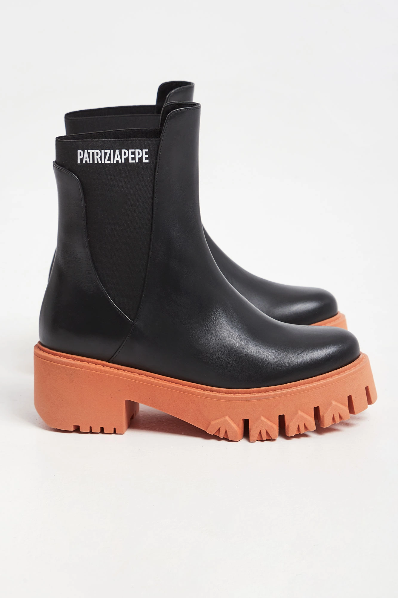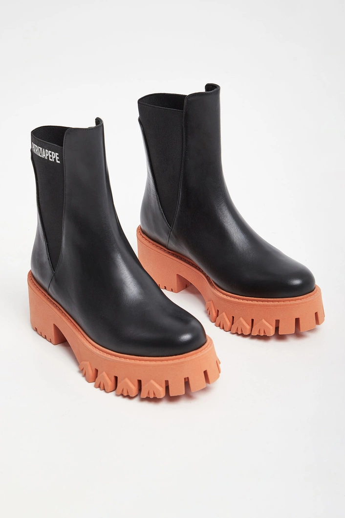 Designerskie trapery w czarnym kolorze marki Patrizia Pepe. Z boku szeroka, elastyczna guma z nadrukiem nazwy marki w białym kolorze. Fantazyjna podeszwa o wysokości około 4,5 cm z tłoczeniem w postaci ważki w kolorze pomarańczowym. Wykonane ze skóry naturalnej. Bardzo komfortowe i stylowe.
