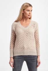 Sweter marki Blugirl Blumarine w beżowym kolorze. Ażurowy, na całości niewielkie, złote cekiny. W zestawie satynowy top wykończony koronką. Dekolt typu v-neck, długie rękawy i dół zakończone prążkowanymi ściągaczami. Na linii karku złota, logowana zawieszka. Obniżona linia ramion. Fason typu relaxed.