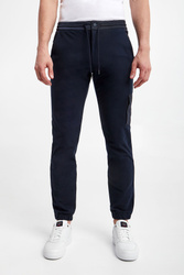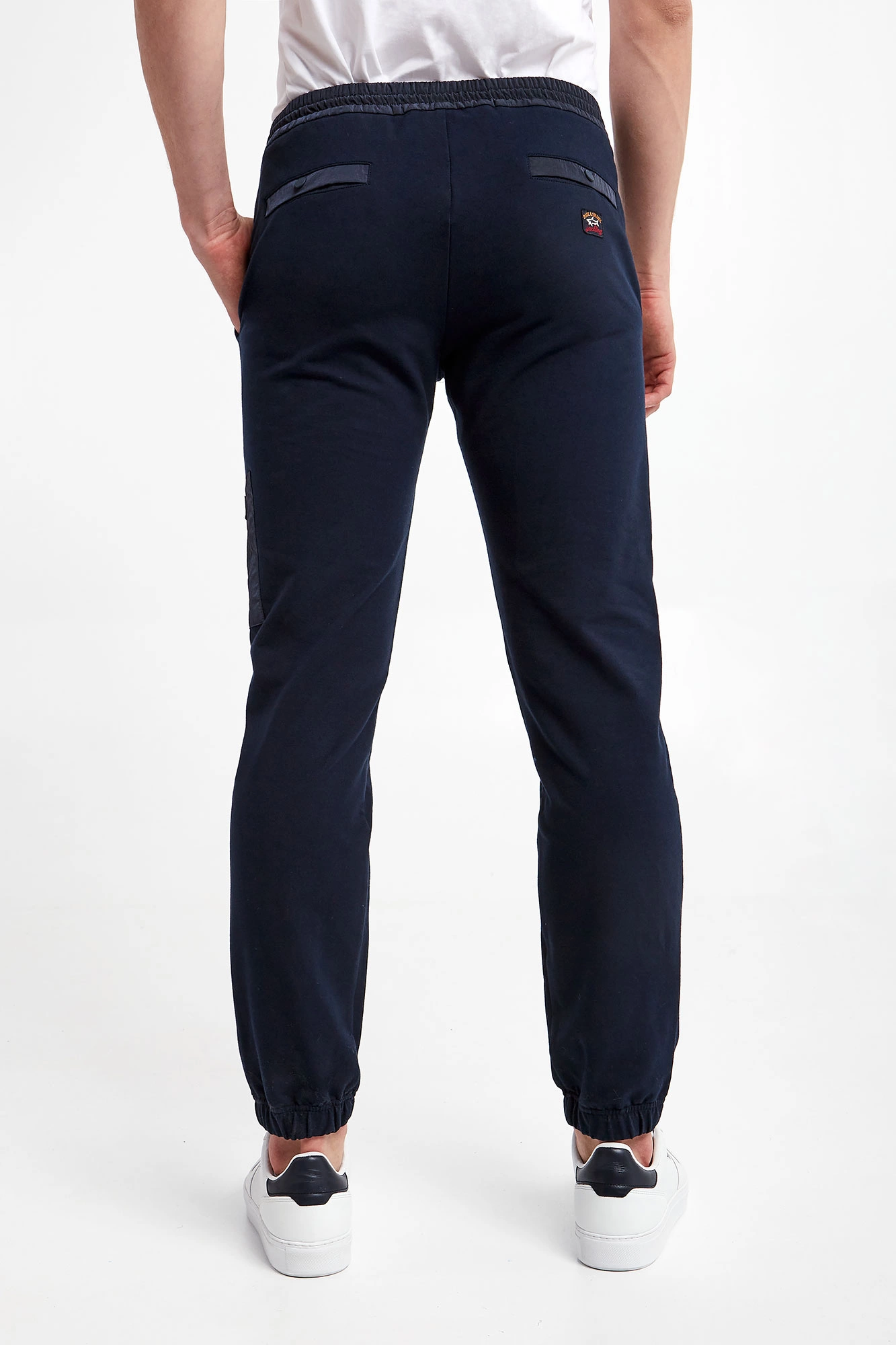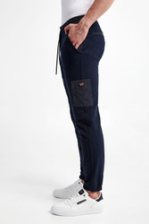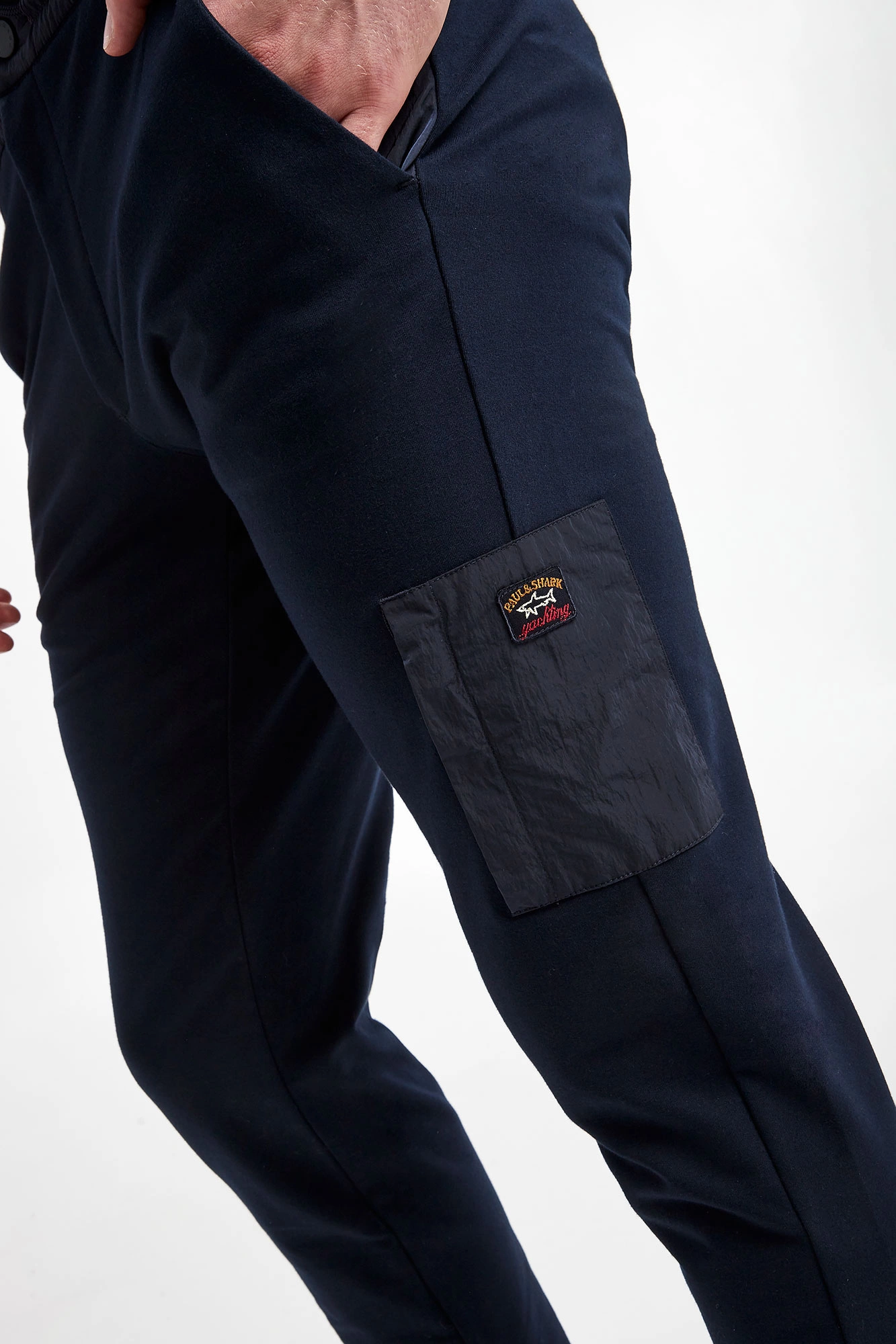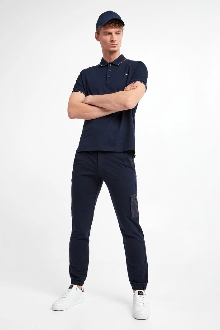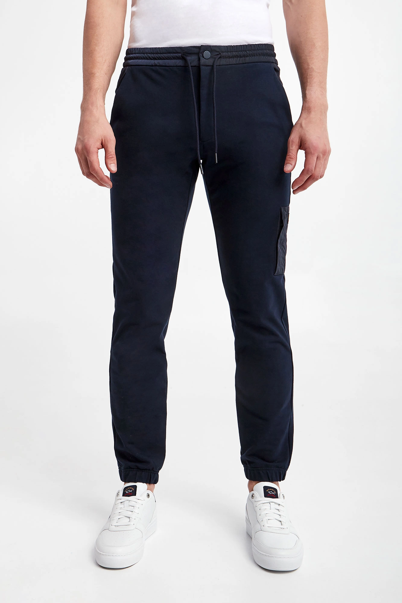 Spodnie dresowe marki Paul&Shark w granatowym kolorze. Fason typu jogger. Model z dwiema bocznymi i dwiema tylnymi, zamykanymi kieszeniami. Na nogawce dodatkowa, naszywana kieszeń z aplikacją z logo, z zamkiem po boku. Zapinane na zamek i nap, z dodatkowym ściągaczem regulowanym za pomocą troczków. Z tyłu naszywka z logo marki. Nogawki zakończone ściągaczami. Wykonane z bawełny organicznej.