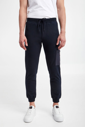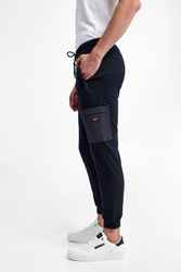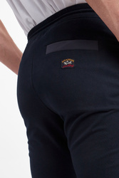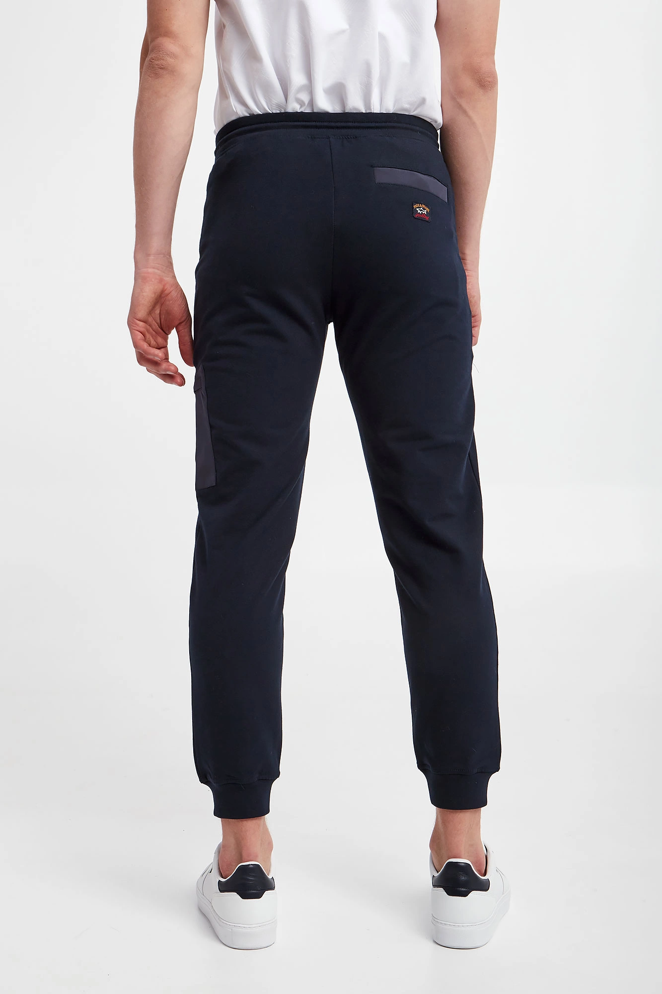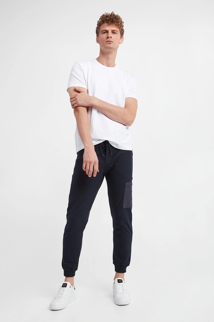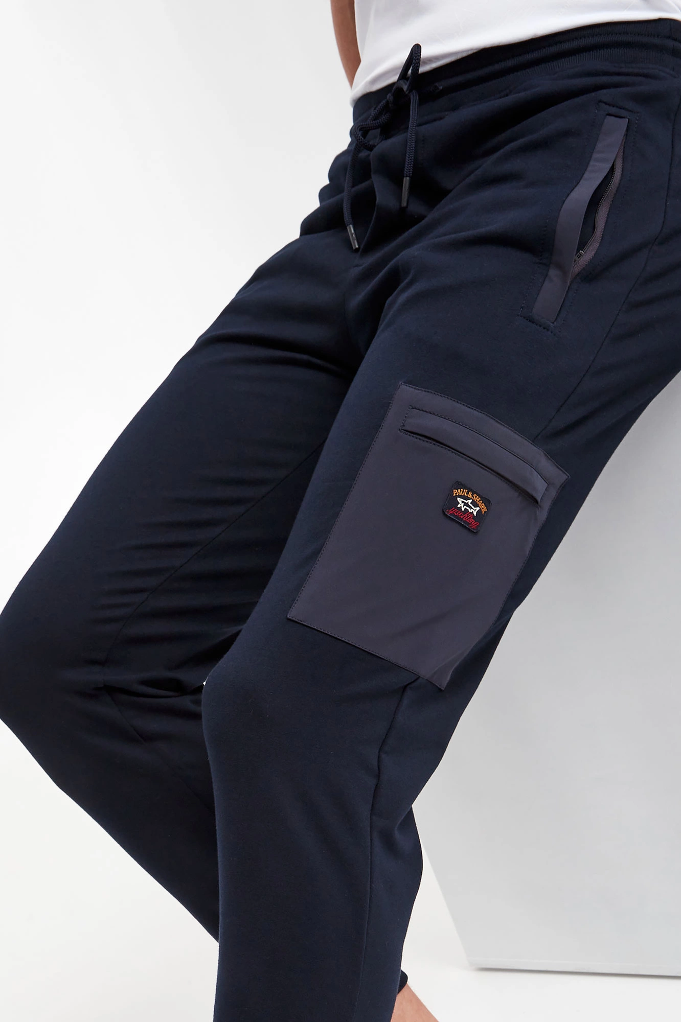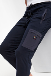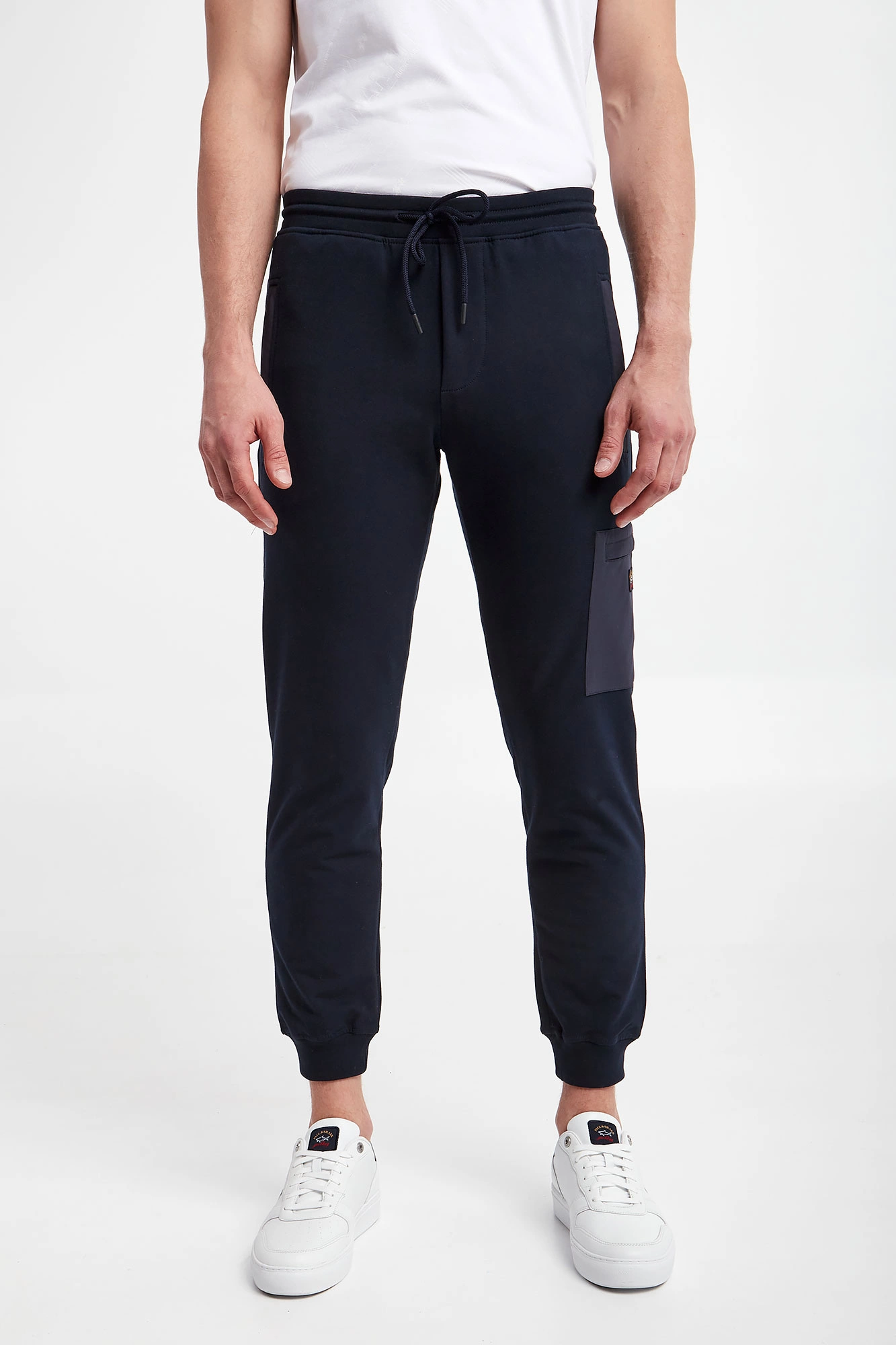 Spodnie dresowe marki Paul&Shark w granatowym kolorze. Fason typu jogger. Model z dwiema bocznymi kieszeniami zapinanymi na zamki oraz jedną tylną zapinaną na napę. Z boku nogawki dodatkowa kieszeń z naszywką z logo, zapinana na zamek. W pasie troczki. Z tyłu naszywka z logo marki. Nogawki zakończone ściągaczami. Wykonane z bawełny organicznej.