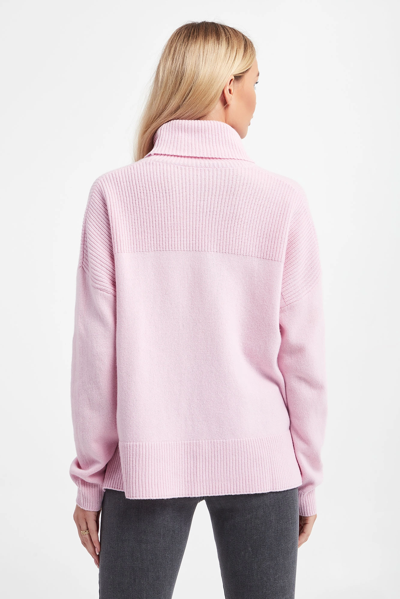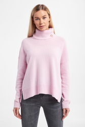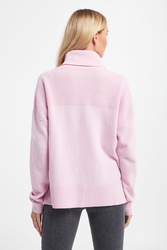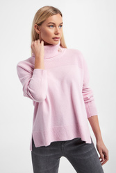 Golf marki Liu Jo w kolorze jasnego różu. Góra prążkowana. Golf luźny, z możliwością podwinięcia, ozdobiony złotą broszką z kryształkami. Rękawy i asymetryczny dół zakończone ściągaczami. Po bokach rozcięcia. Obniżona linia ramion. Fason typu relaxed. Wykonany z elastycznej, wełnianej tkaniny.