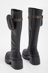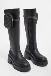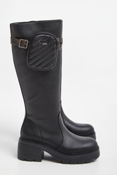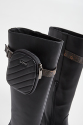 Czarne kozaki marki Liu Jo. Wykonane z gładkiej, ekologicznej skóry. Zapinane po boku za pomocą zamka z synowym suwakiem. Długa cholewka. U góry wykończona logowanym paskiem z klamrą i pikowaną saszetką zapinana na zamek z możliwością jej ściągnięcia. Klasyczna, sygnowana podeszwa.