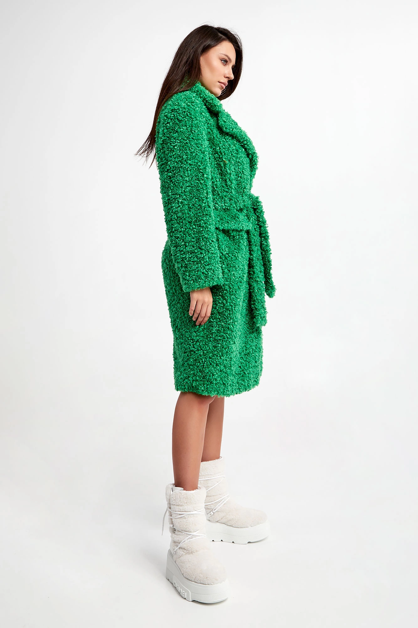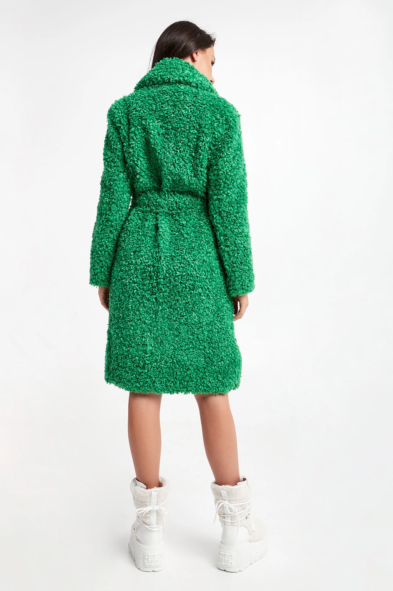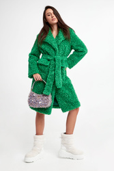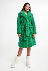 Futro marki Pinko w zielonym kolorze. Fason typu relaxed. Zapinane za pomocą nap. Klasyczny, duży kołnierz. Model z dwoma wpuszczanymi kieszeniami z patką. Długie rękawy. W talii szlufki i pasek. Wykonane z ekologicznego, sztucznego futra.