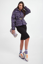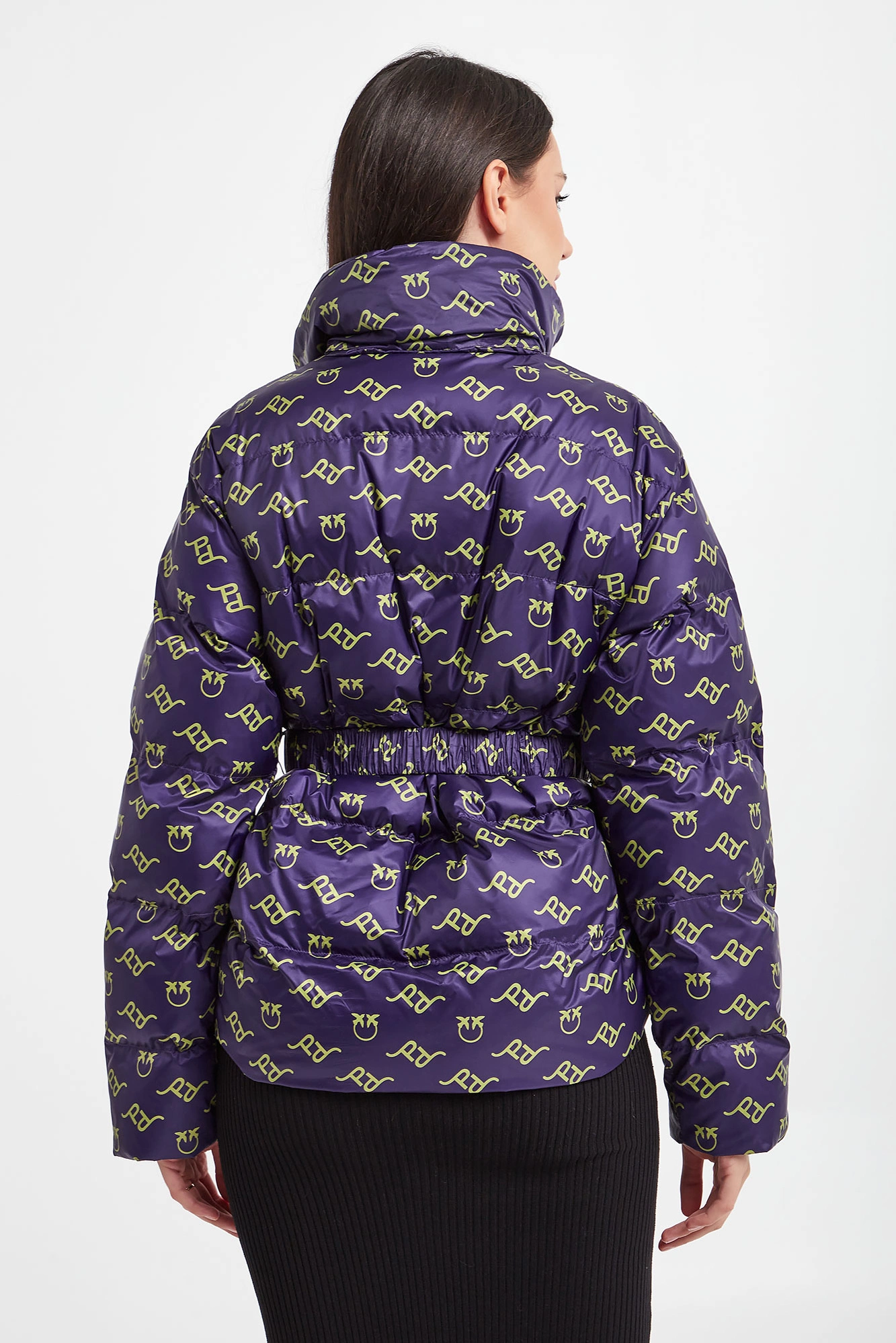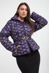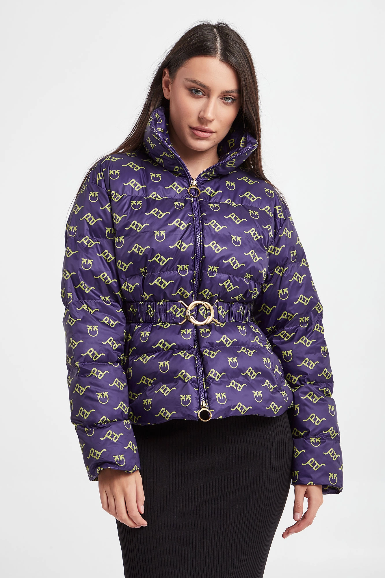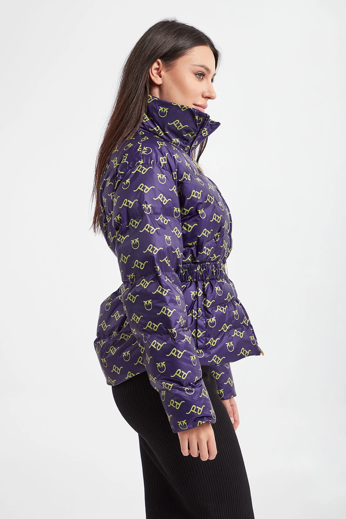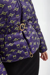 Pikowana kurtka marki Pinko w fioletowym kolorze. Na całości nadruk w postaci logo marki w limonkowym kolorze. Zapinana na dwukierunkowy zamek. Ze stójką W talii szlufki i pasek z logowaną klamrą. Dół regulowany za pomocą troczków ze stoperem. Po bokach kieszenie zapinane na napy. Fason typu regular. Syntetyczne wypełnienie.