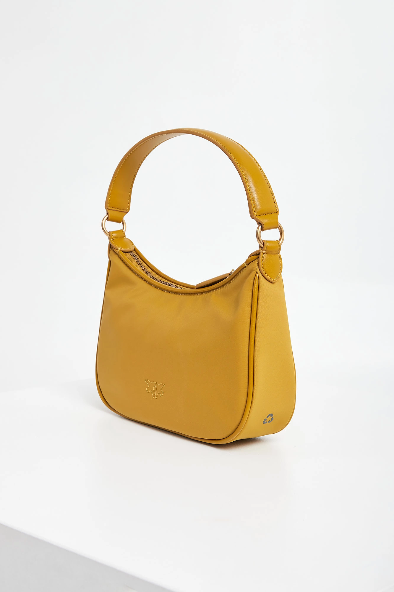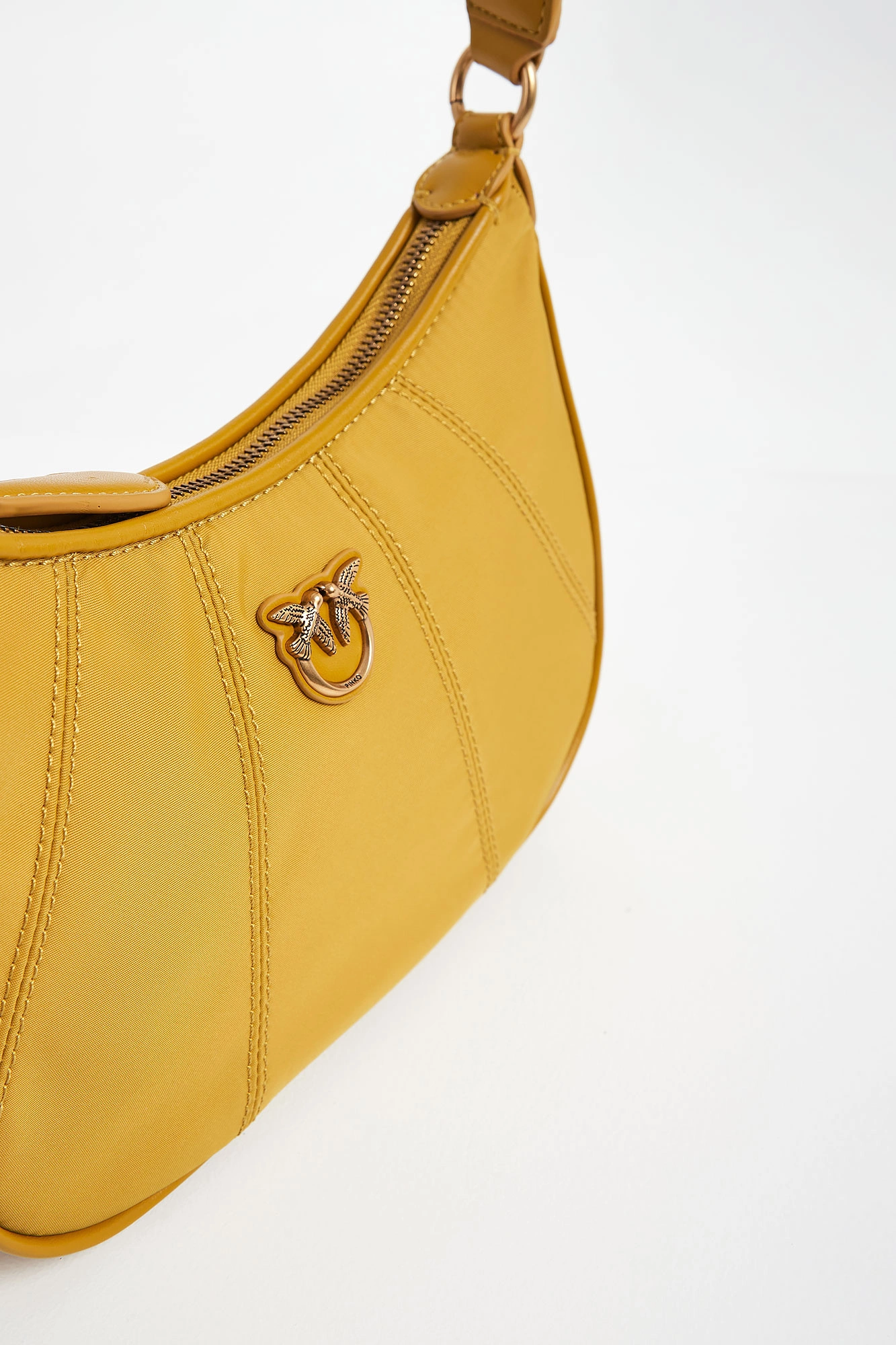 Torebka marki Pinko w musztardowym kolorze, model Half Moon Mini. Nylonowa. Typu baguette bag. Na całości przeszycia. Jednokomorowa. Zapinana za pomocą zamka w złotym kolorze. Z przodu metalowa aplikacja z nazwą i logo marki "Love Birds" w złotym kolorze. Do noszenia na krótkim pasku lub długim, opinanym.